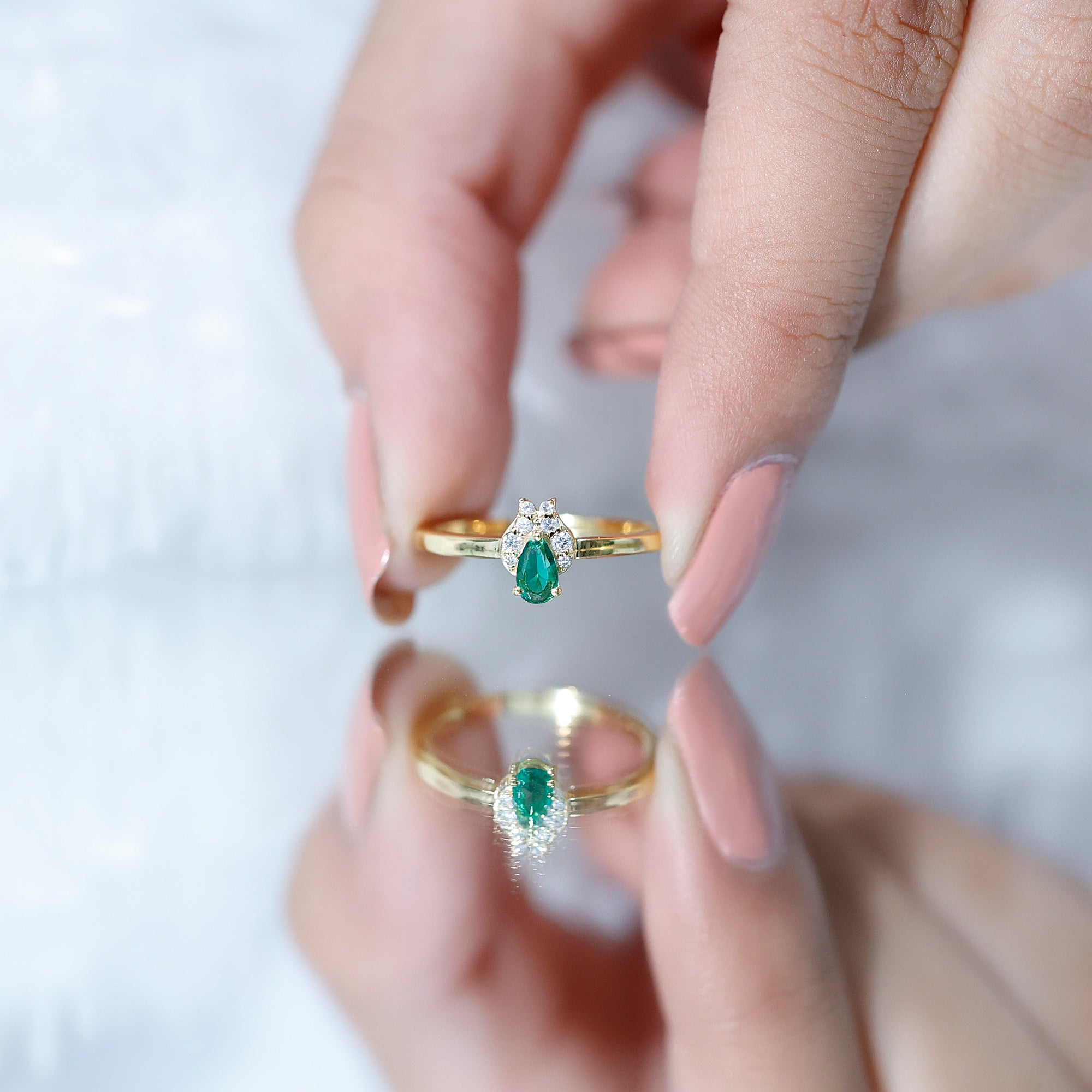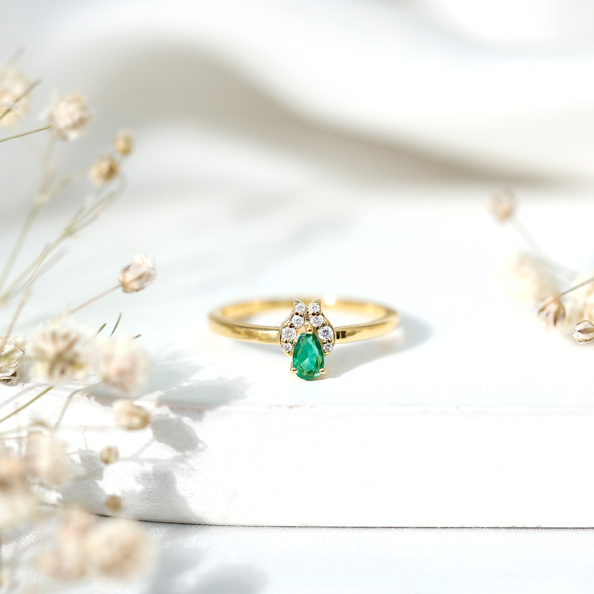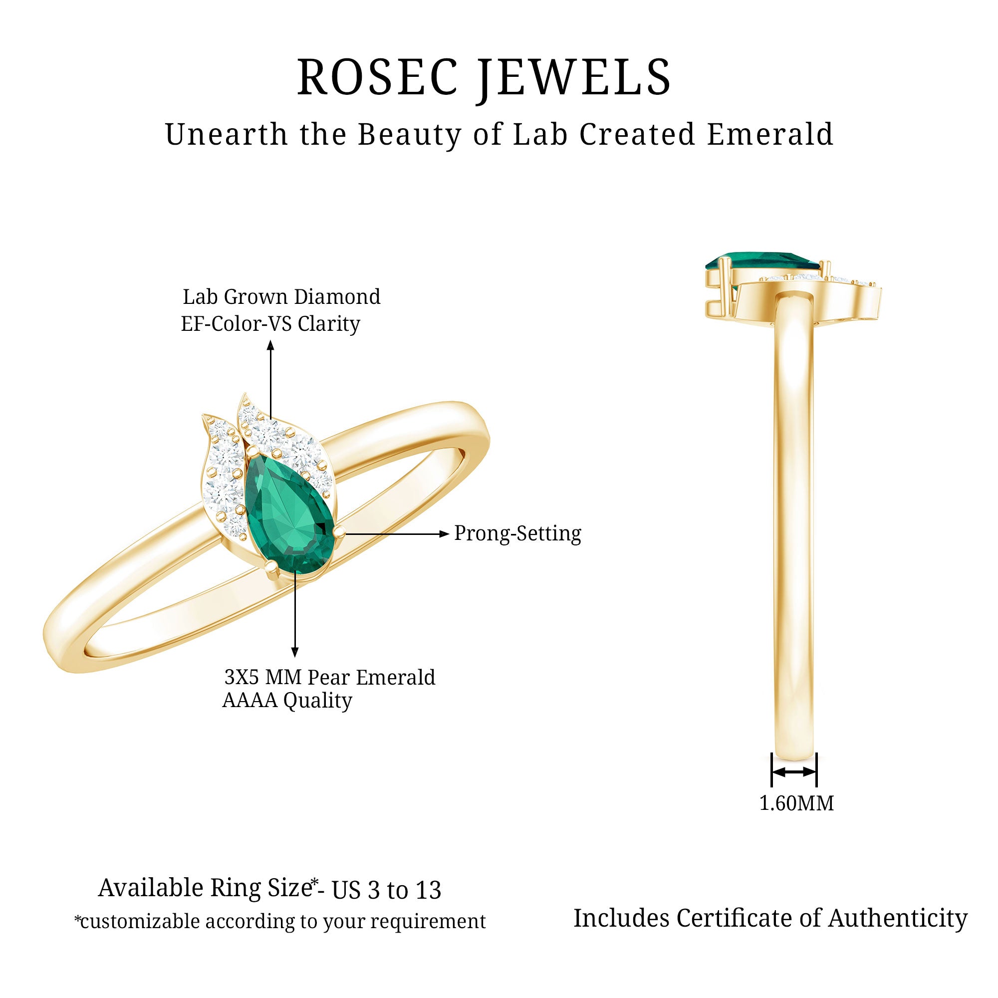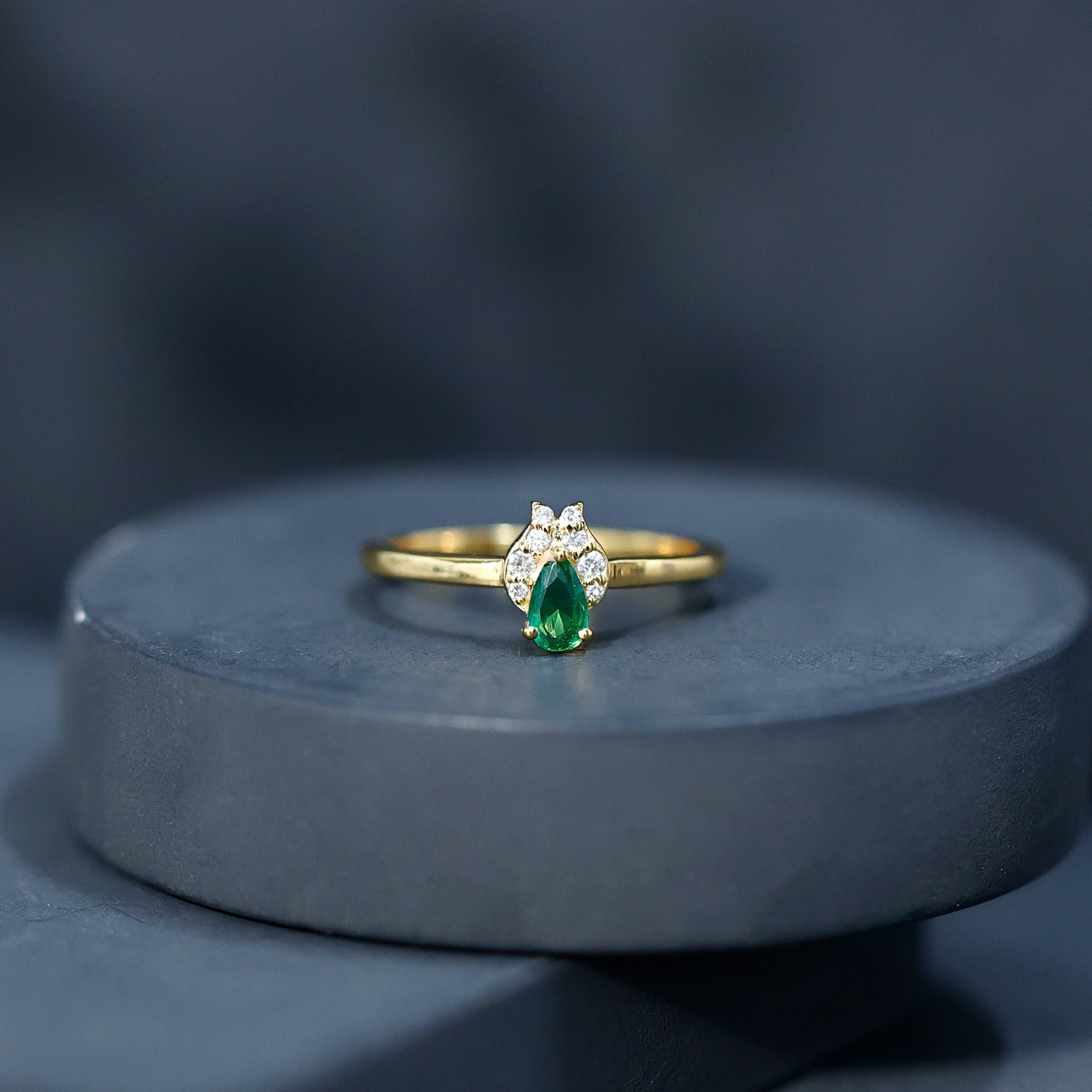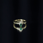 Your every promise shines more brightly with our Emerald Promise Ring, which is designed to capture the essence of love and commitment. Crafted in 14K yellow gold plated silver, this Minimalist Ring is designed for those who appreciate meaningful beauty and a touch of refined sophistication. At the center of this enchanting piece sits a 3X5 MM pear shaped lab created emerald, securely held in prong setting. Adding a delicate sparkle to the design are round lab grown diamonds, gracefully nestled in leaf-like motifs. The contrast between the vivid green and the brilliant white stone brings an air of quiet luxury, while the teardrop shape of the emerald adds a romantic charm. Sleek and slender, the band’s smooth finish complements the center stones perfectly, offering a minimal yet elegant look. The simplicity of the design ensures it remains versatile, ideal as a promise ring, a birthday gift, or a celebration of life’s milestones. Whether you are expressing a lifelong commitment or marking a special memory, this Emerald and Diamond Ring captures the depth of emotion in a soft, graceful way. With its symbolic color and timeless shape, it is a beautiful reminder of the love you share, and a piece to treasure forever. Packaged in a premium jewelry box and accompanied by a certificate of authenticity, this Commitment Ring is a heartfelt gift that speaks volumes with its understated beauty and elegance.