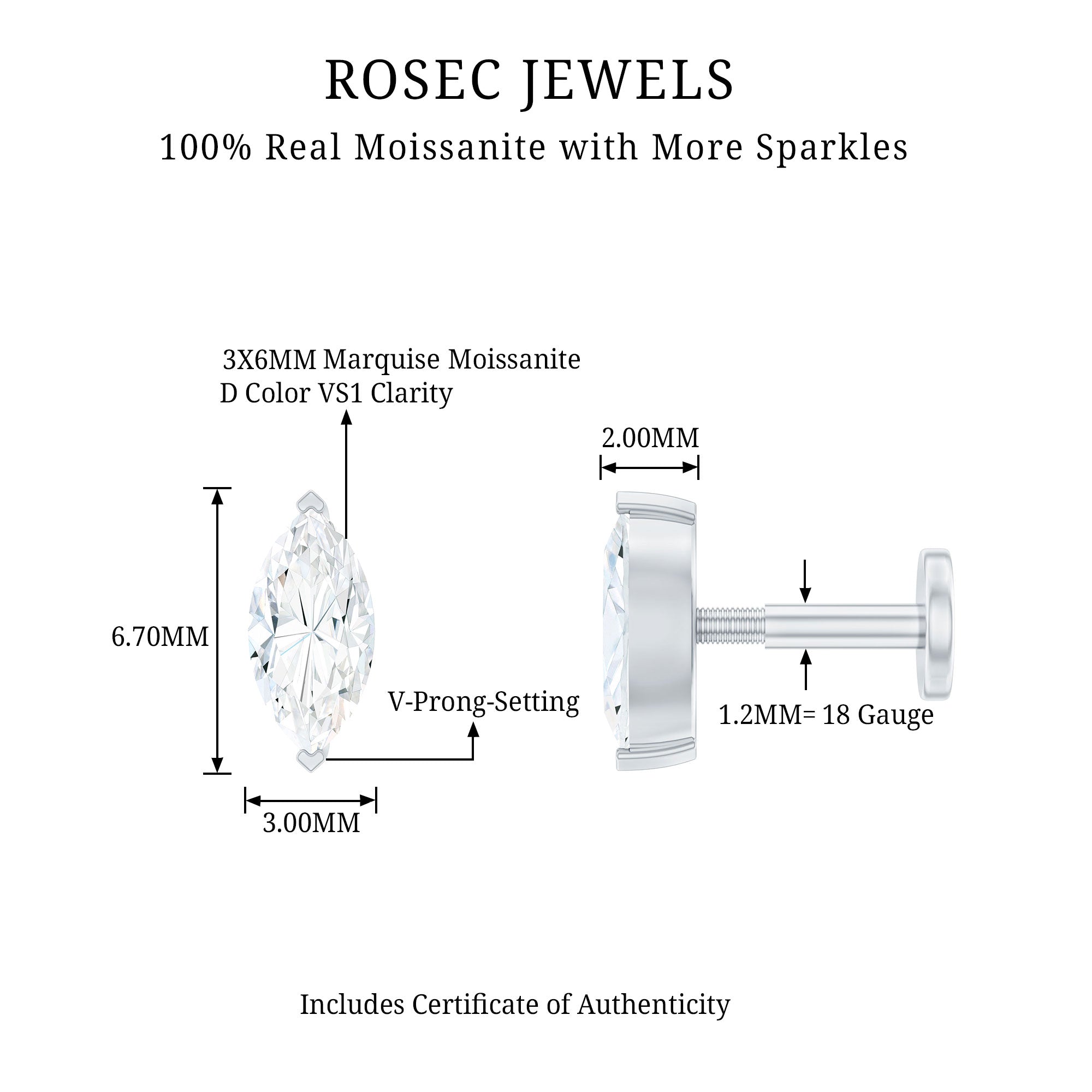 This Solitaire Tragus Earring showcases a 3X6 MM Marquise Cut Moissanite secured in V Prong Setting. You can style this Tiny Earring on your Helix, Cartilage, Tragus, Conch, or Upper Lobe Piercing. Gift this Moissanite Cartilage Earring to your special one as a Birthday Gift or Anniversary Gift and make her shine like a queen. A flat back closure provides both comfort and security, making it perfect for long-term wear. The solitaire moissanite adds a timeless elegance that pairs well with both casual and formal outfits. Whether worn alone or alongside other earrings, its brilliant sparkle ensures you shine effortlessly. Its petite size makes this Marquise Helix Earring ideal for layered ear styles or for those who love minimal yet impactful jewelry. Delivered in a lovely jewelry box, the Moissanite Solitaire Earring makes a considerate gift for Valentine’s Day, anniversaries, or any romantic occasion.