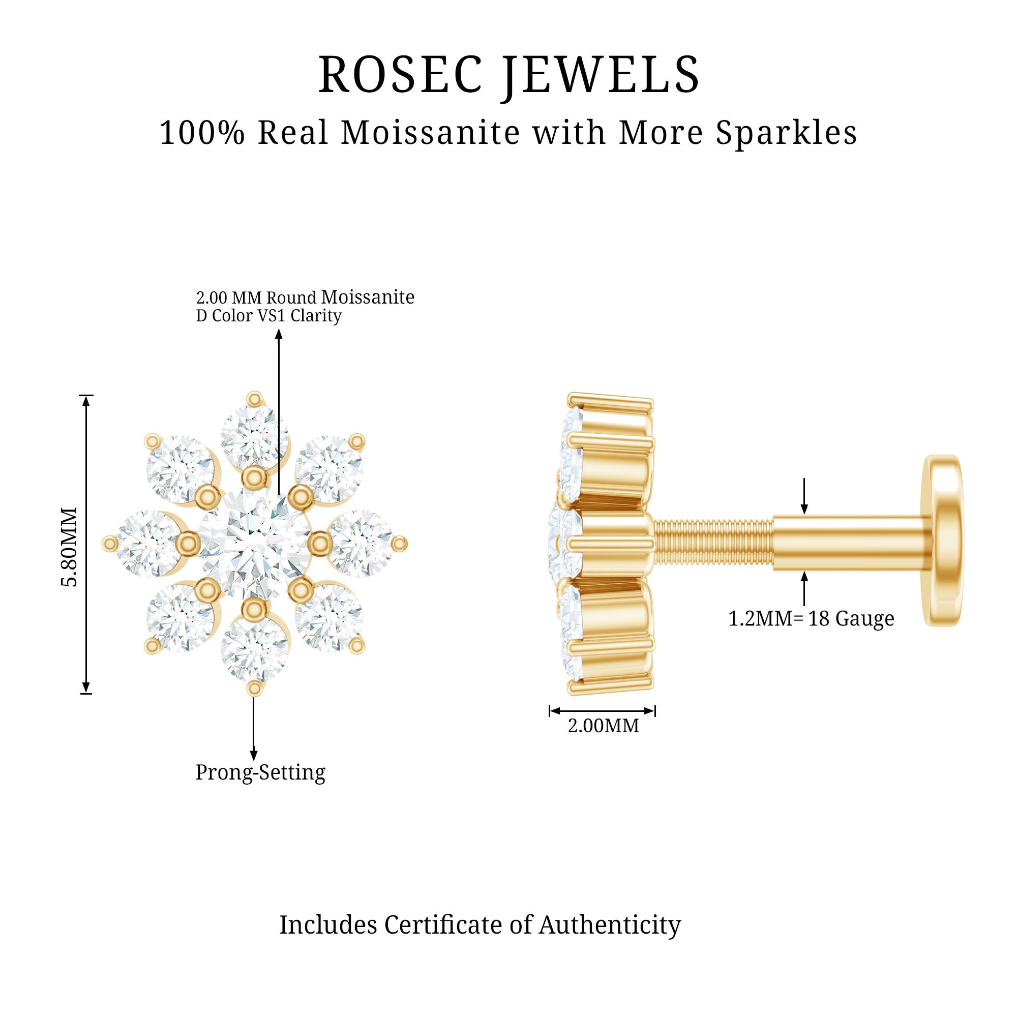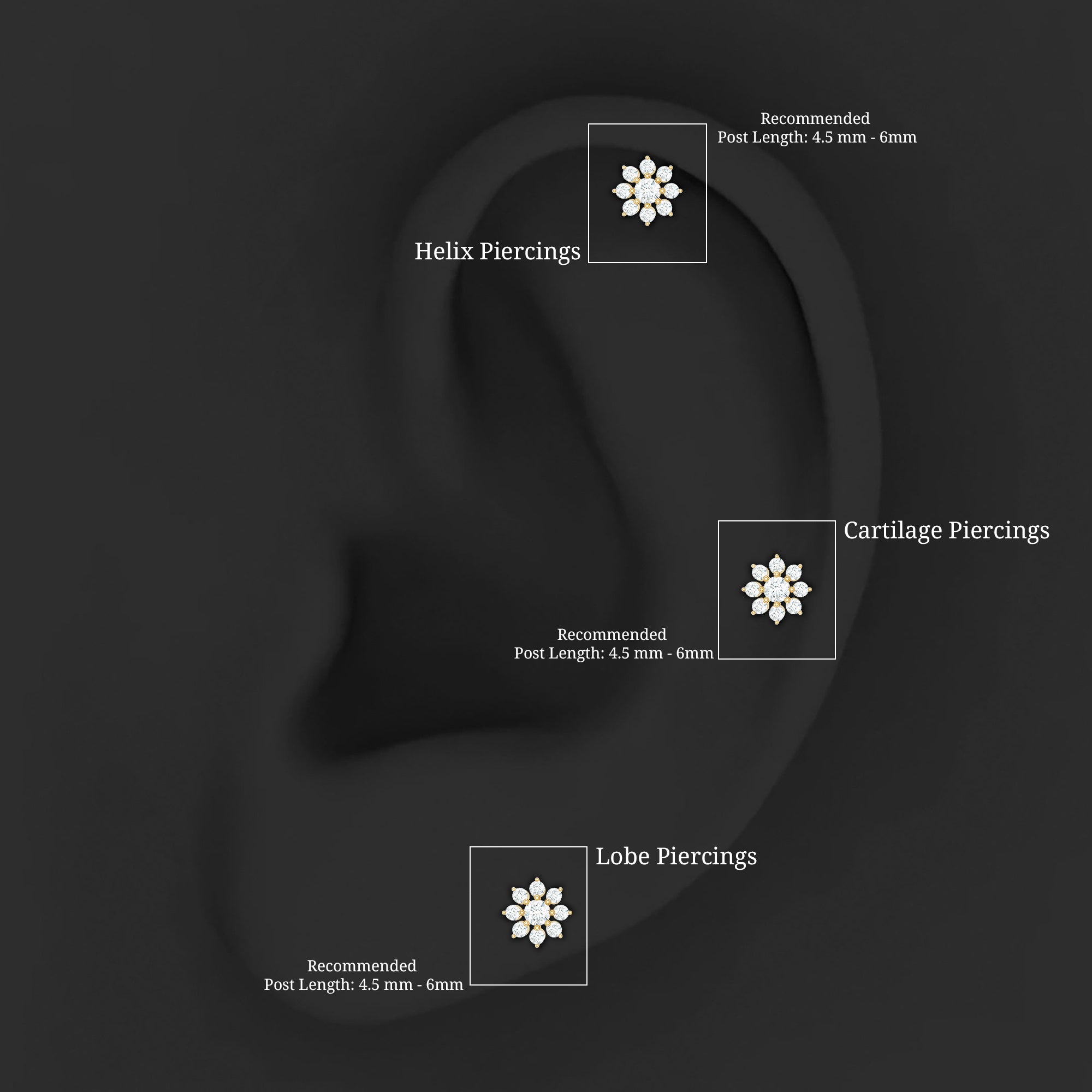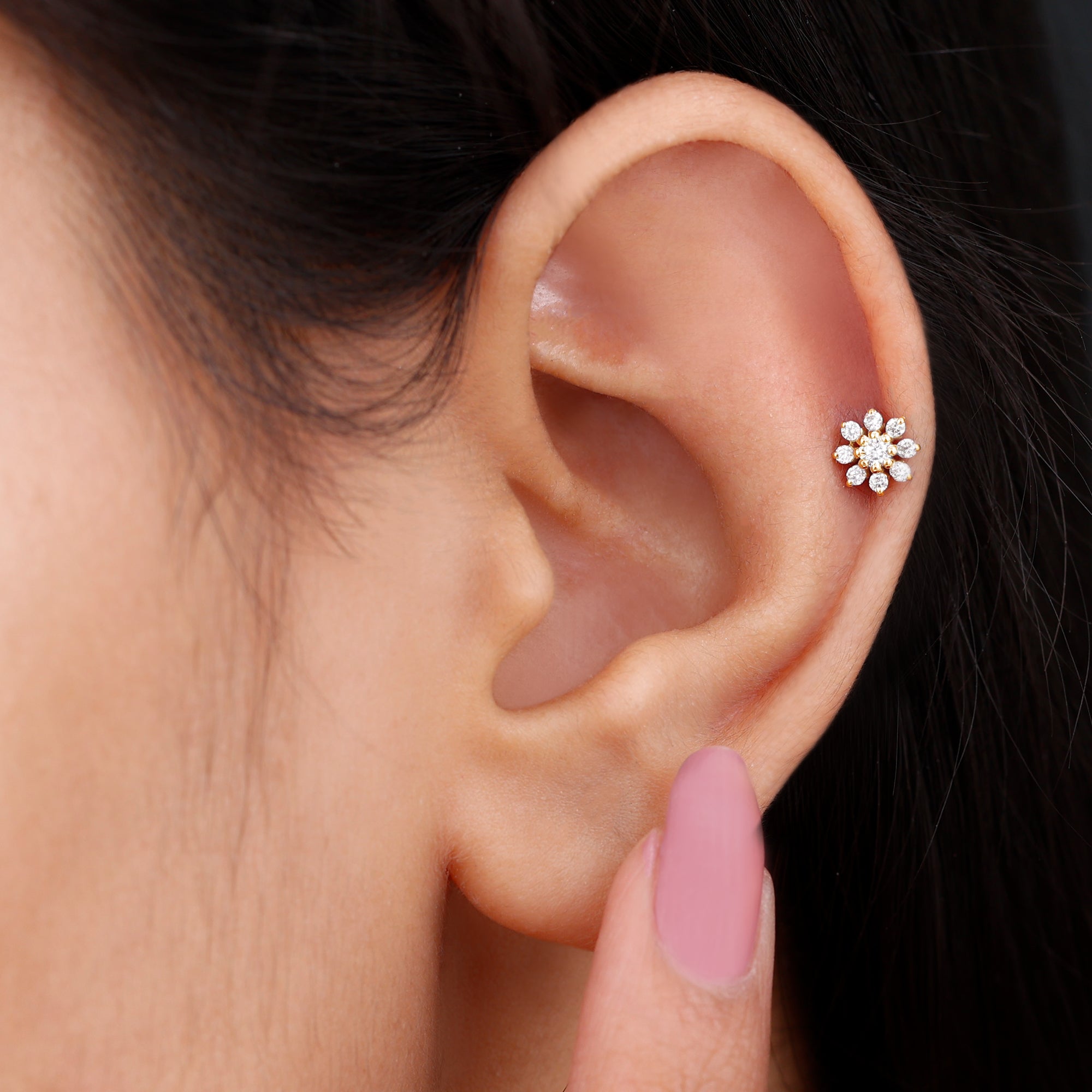 If youre in search of a versatile and stunning earring, look no further than this Moissanite Flower Cartilage Earring. The beautiful Flower Design is composed of high-quality Round Cut Moissanites set in Real Gold Metal. The Flat Back Closure provides a comfortable and secure fit, and this Floral Earring can be worn on your Helix, Conch, Tragus, Cartilage, or Upper Lobe Piercings. With timeless beauty and exceptional quality, this earring is perfect for any occasion.