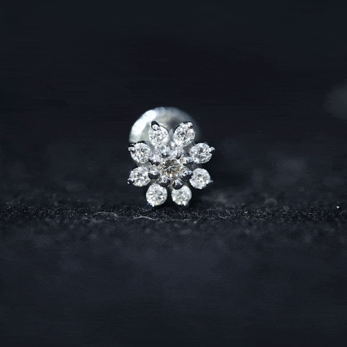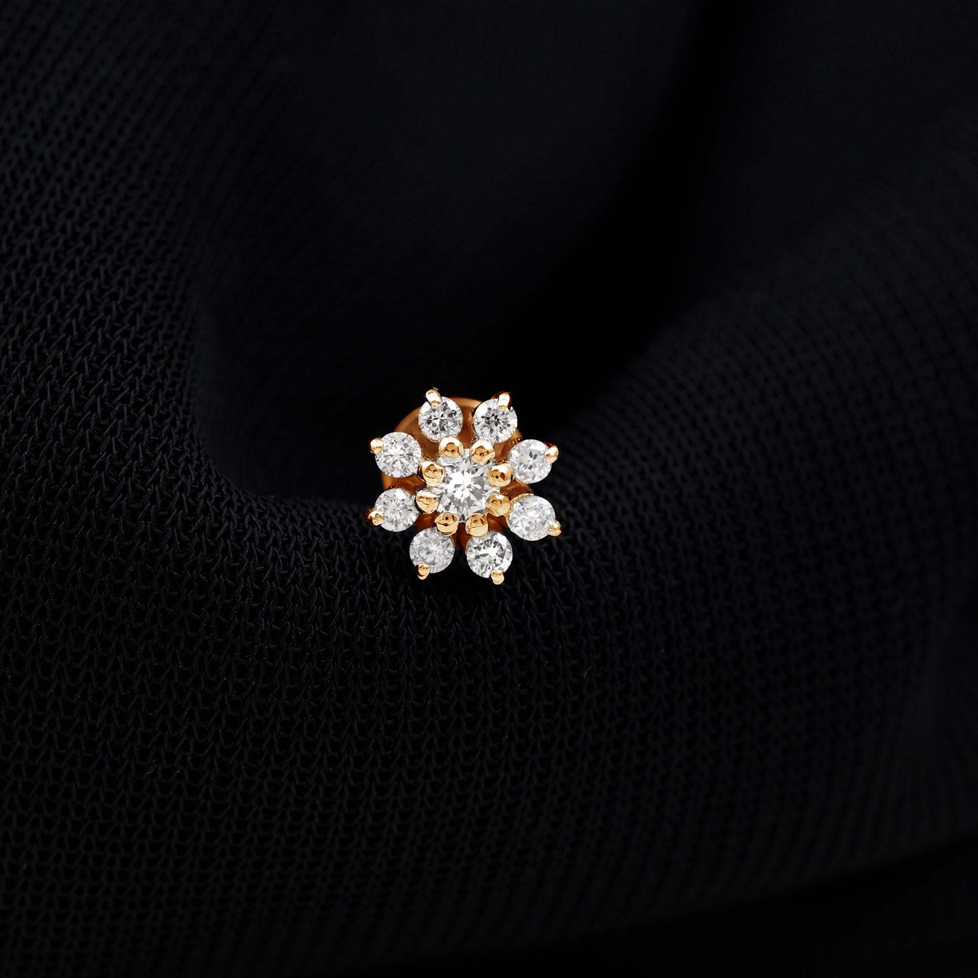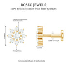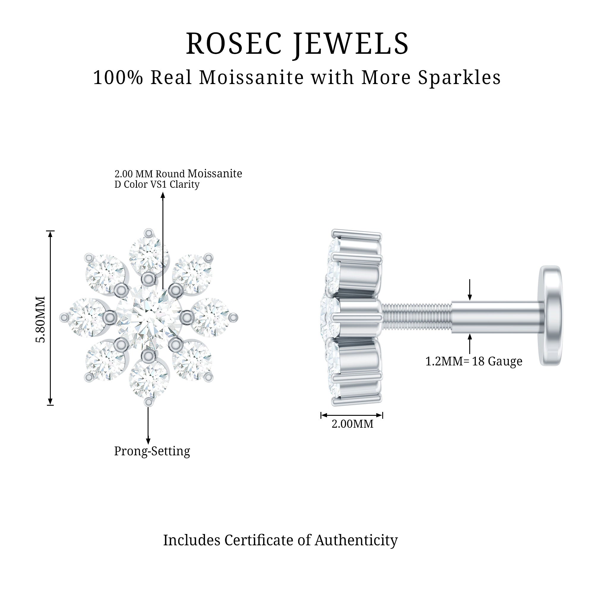 If youre in search of a versatile and stunning earring, look no further than this Moissanite Flower Cartilage Earring. The beautiful Flower Design is composed of high-quality Round Cut Moissanites set in Real Gold Metal. The Flat Back Closure provides a comfortable and secure fit, and this Floral Earring can be worn on your Helix, Conch, Tragus, Cartilage, or Upper Lobe Piercings. With timeless beauty and exceptional quality, this earring is perfect for any occasion.