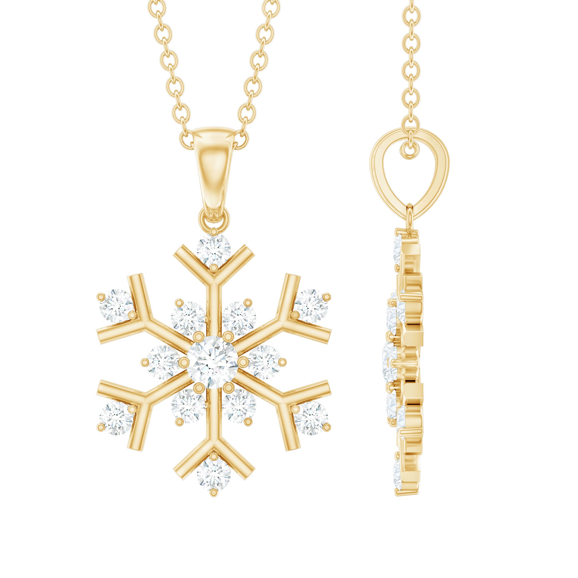 Complete your winter look with this Diamond Snowflake Necklace. It features a metallic snowflake frame adorned with smaller Round Shape Diamonds securely placed in 2 Prong Setting. The Winter Pendant reflects the classic shine of HI color and SI clarity Diamonds, which makes it perfect to light up your look. It hangs from a delicate cable chain, making it a breeze to wear. Also makes an ideal birthday gift for her, a sweet Valentine’s Day surprise for your girlfriend, or a thoughtful Christmas present for mom - this Snowflake Pendant Necklace is sure to light up their faces with joy. It is versatile enough to complement any outfit, whether you are going for a casual vibe or dressing up for a fancy evening. This Real Diamond Necklace will be delivered to you in a premium quality jewelry box with the certificate of authenticity. Perfect for the festive season, this Designer Snowflake Necklace will bring a hint of magic to your Christmas ensemble.