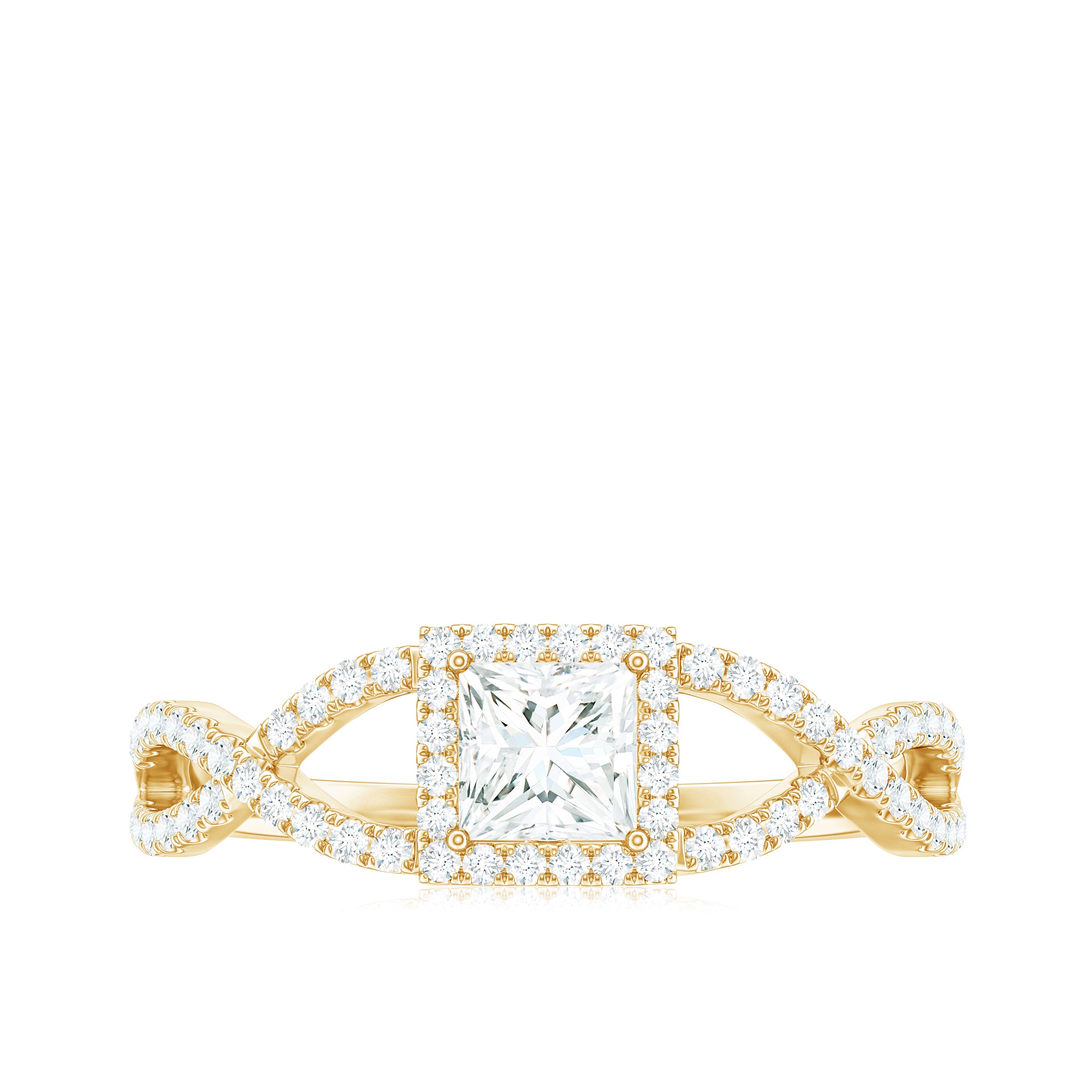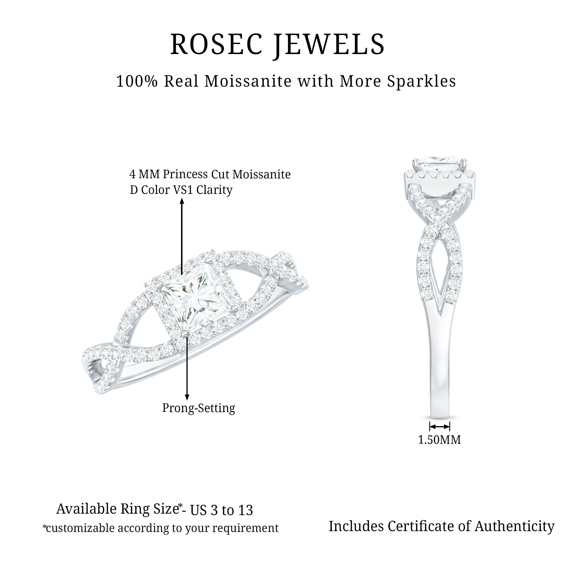 Discover this exquisite Moissanite Engagement Ring that seamlessly merges timeless elegance with a contemporary flair. The band of this Princess Cut Engagement Ring showcases two strands that intertwine gracefully, creating a braided appearance, embellished with sparkling round cut moissanites. This striking design features a prominent 4 mm princess cut moissanite, carefully set in prongs. Stylish and charming, this Crossover Ring represents everlasting love and exemplifies sophisticated taste. Its distinctive twist introduces a whimsical element of refinement to this traditional piece. This Halo Moissanite Ring serves as a considerate and budget-friendly gift for your beloved. This Braided Engagement Ring is ideal for commemorating any significant occasion, whether it be a wedding, anniversary, or simply a heartfelt gift. This Square Engagement Ring is a beautiful expression of love, appreciation, and connection to someone special. Present this Designer Moissanite Ring to that extraordinary individual, and allow it to stand as a timeless symbol of love and beauty.
