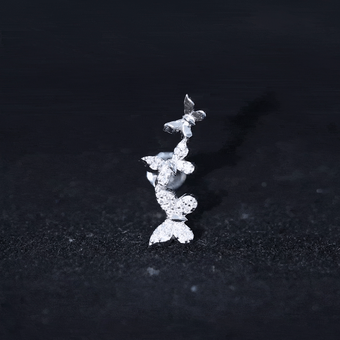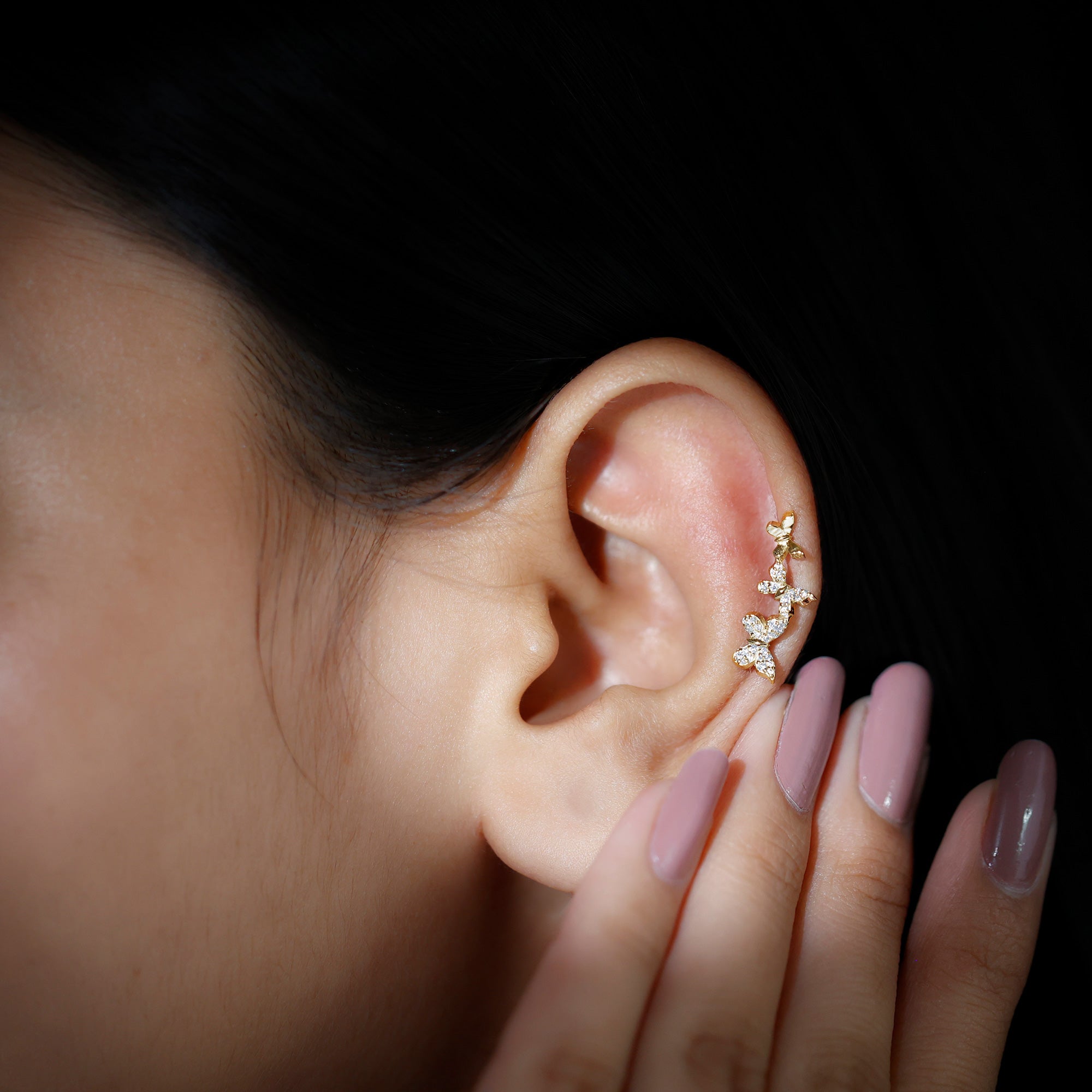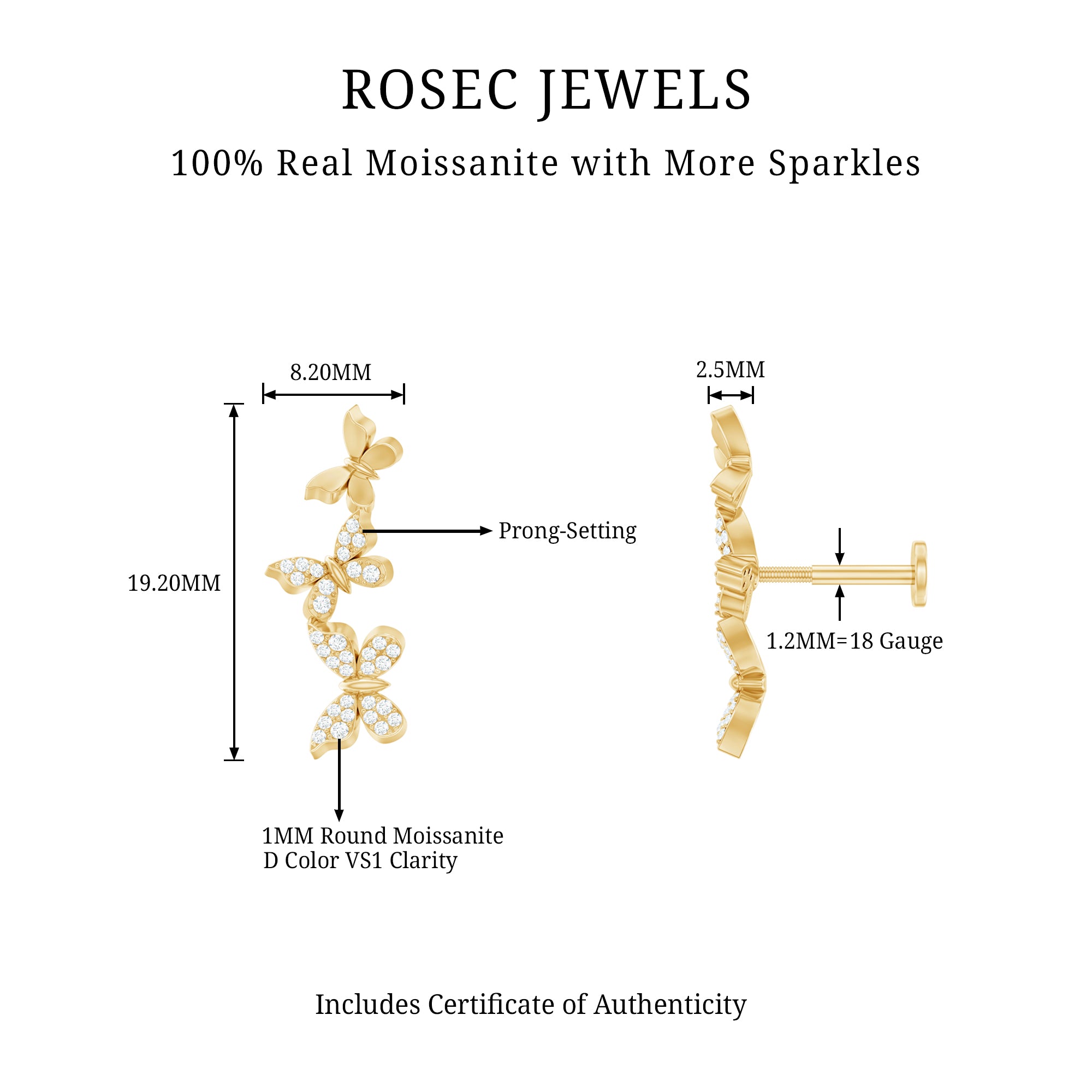 Our Moissanite Butterfly Climber Earring is a unique and stunning piece of jewelry that will elevate your ear piercing game to the next level. Featuring three butterfly designs, embellished with natural Round Cut Moissanites for an eye-catching sparkle. You can wear this Butterfly Earring on your Helix, Cartilage, or Upper Lobe Piercing.