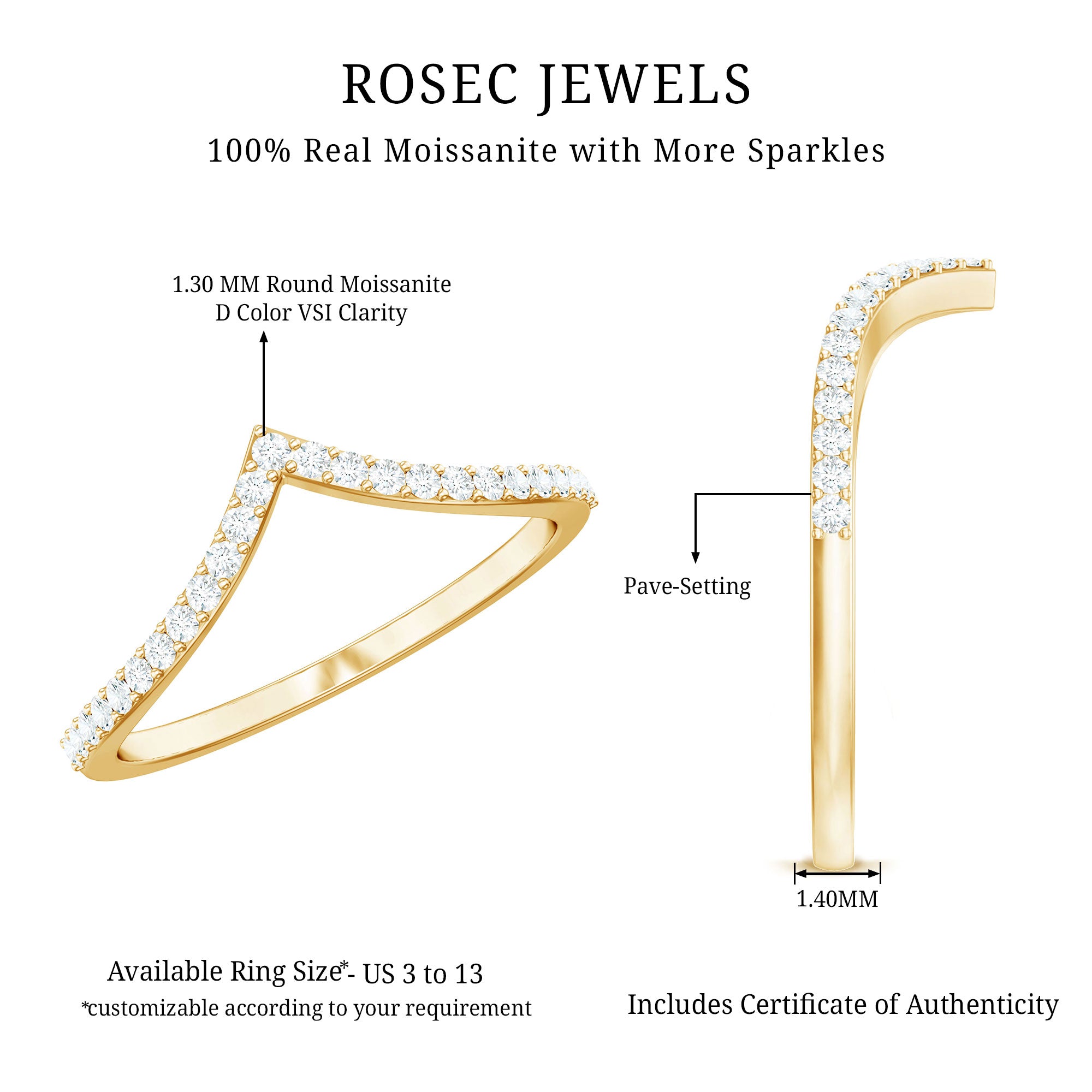 Give a new life to your old engagement ring with this elegant V-shaped Moissanite Enhancer Ring. Designed in a sleek chevron style, this ring offers a modern and refined way to frame your engagement ring or wear solo for a minimal sparkle. This Chevron Ring is set with a row of dazzling round cut moissanite stones in secure pave setting. Known for their high fire and clarity, the moissanites are of D-VS1 quality, offering the brilliance of diamonds with an ethical and affordable edge. Each stone is placed carefully to ensure a clean, continuous shine that follows the curve of the band. Whether you are stacking it with your engagement ring, marking an anniversary, or adding a little glam to your everyday wear, this Chevron Stackable Ring is made to stand out while staying elegant. Its slim, comfortable design allows you to wear it daily with ease. Available in multiple ring sizes, metal colors, and purities, this V Shaped Wedding Band can be tailored to your unique style. A thoughtful choice for brides, anniversary gifts, or simply to treat yourself, this Engagement Ring Enhancer combines classic brilliance with a trendy, modern edge.