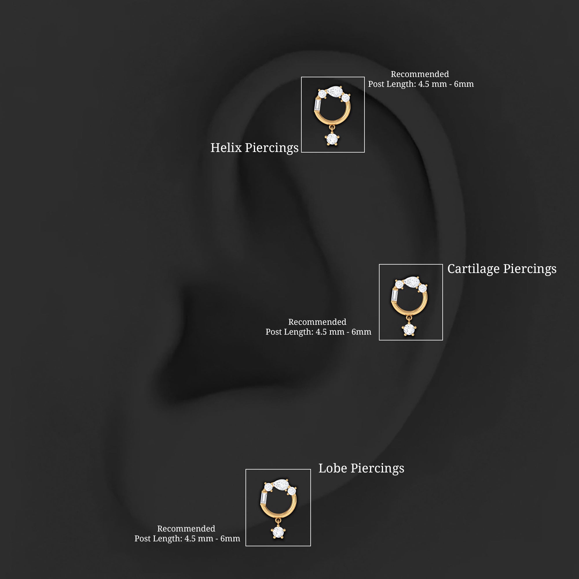 Enhance your jewelry collection with this modern and elegant Dangly Cartilage Earring, featuring stunning Round, Baguette, and Pear Cut Moissanite in a Prong Setting. Wear it on your Cartilage, Helix, or Upper Lobe piercing to add a touch of sophistication to any outfit. The earring comes with a secure closure to keep it in place all day long.