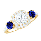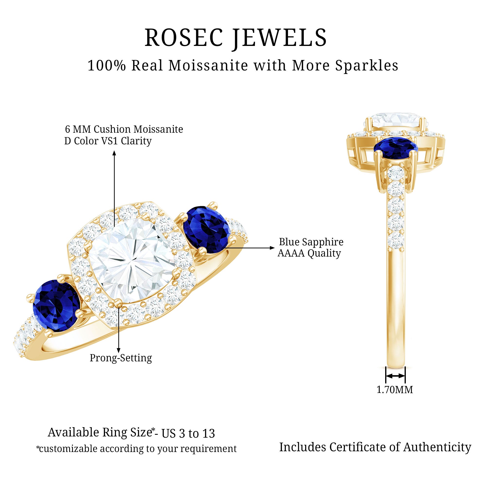 Elevate her ensemble with this Moissanite Engagement Ring an elegant and charming choice for her. Embellished with 6 MM Cushion-Cut Moissanite wrapped in a halo frame of Round petite Moissanite adding an extra touch of sparkle. The Created Blue Sapphire studded as a Side Stone is sure to impress her. Crafted with precision, this halo ring enhances every outfit, whether a casual fit or a formal wear our moissanite ring is designed to illuminate appearance. Make her day special and start a new journey together with this engagement ring.
