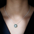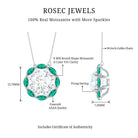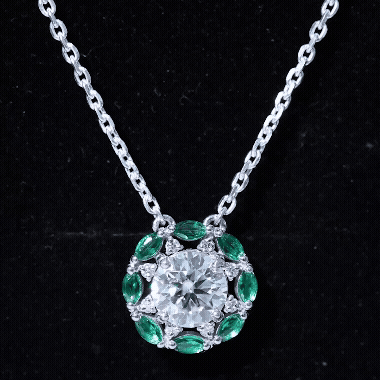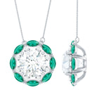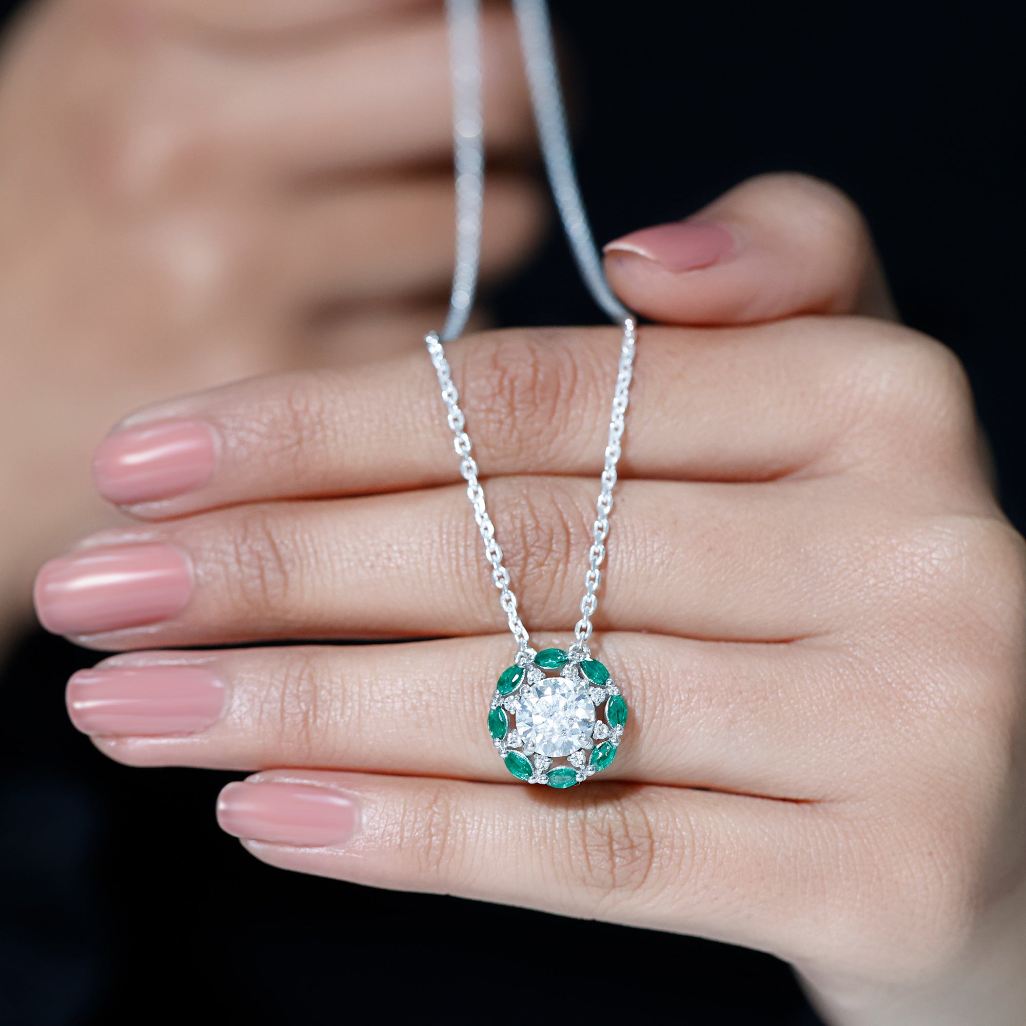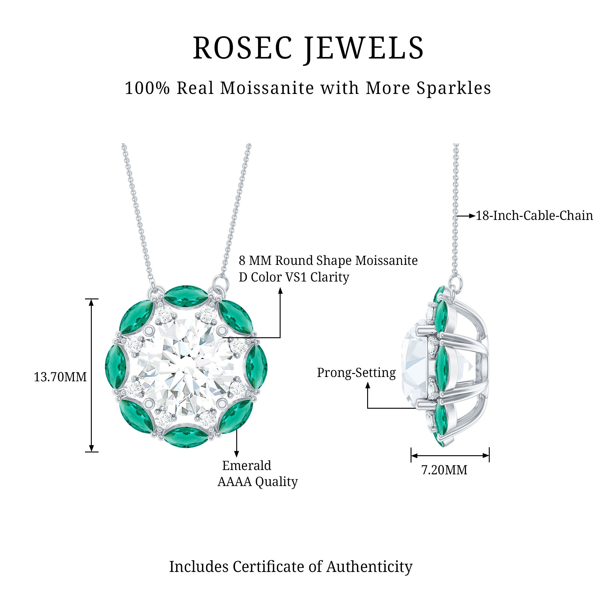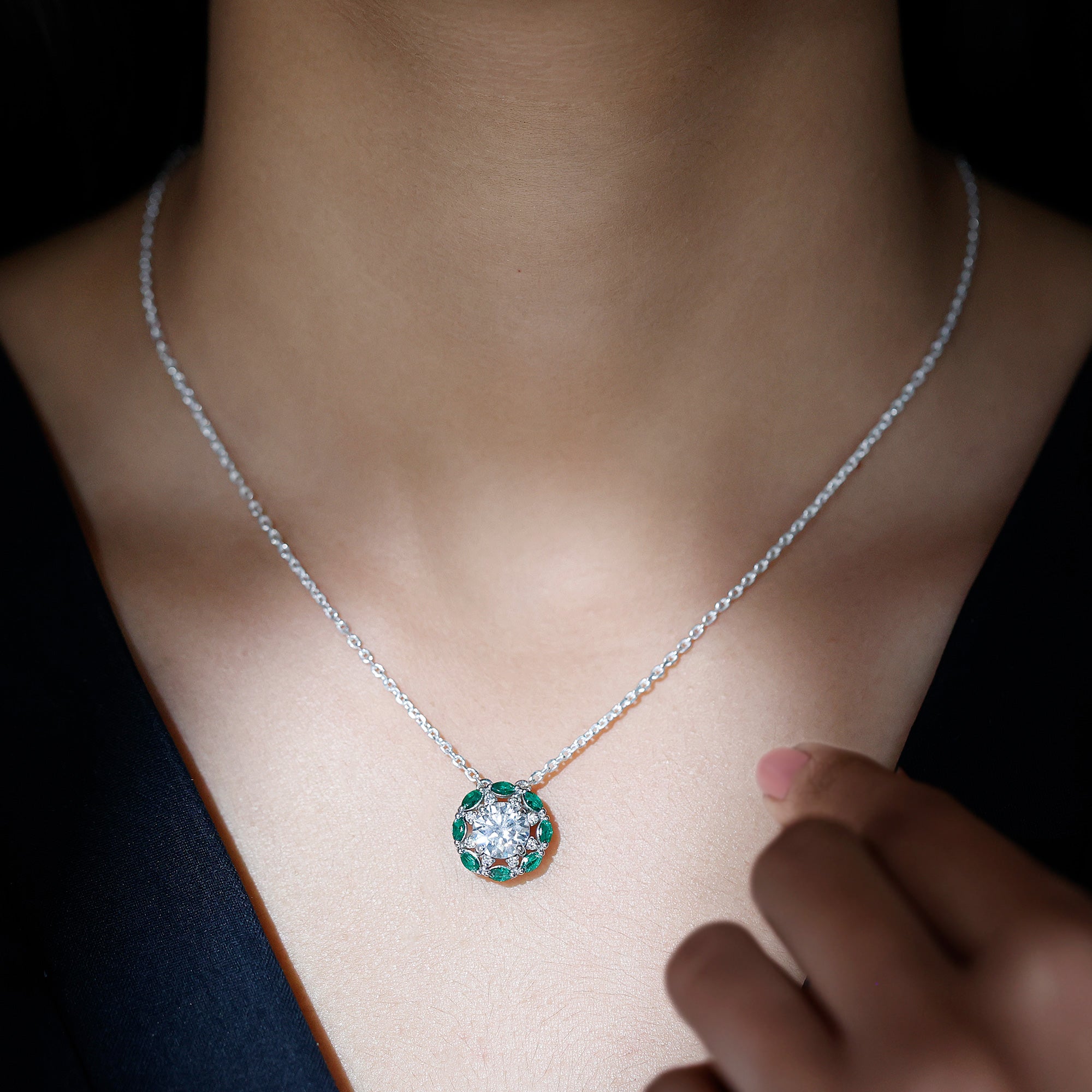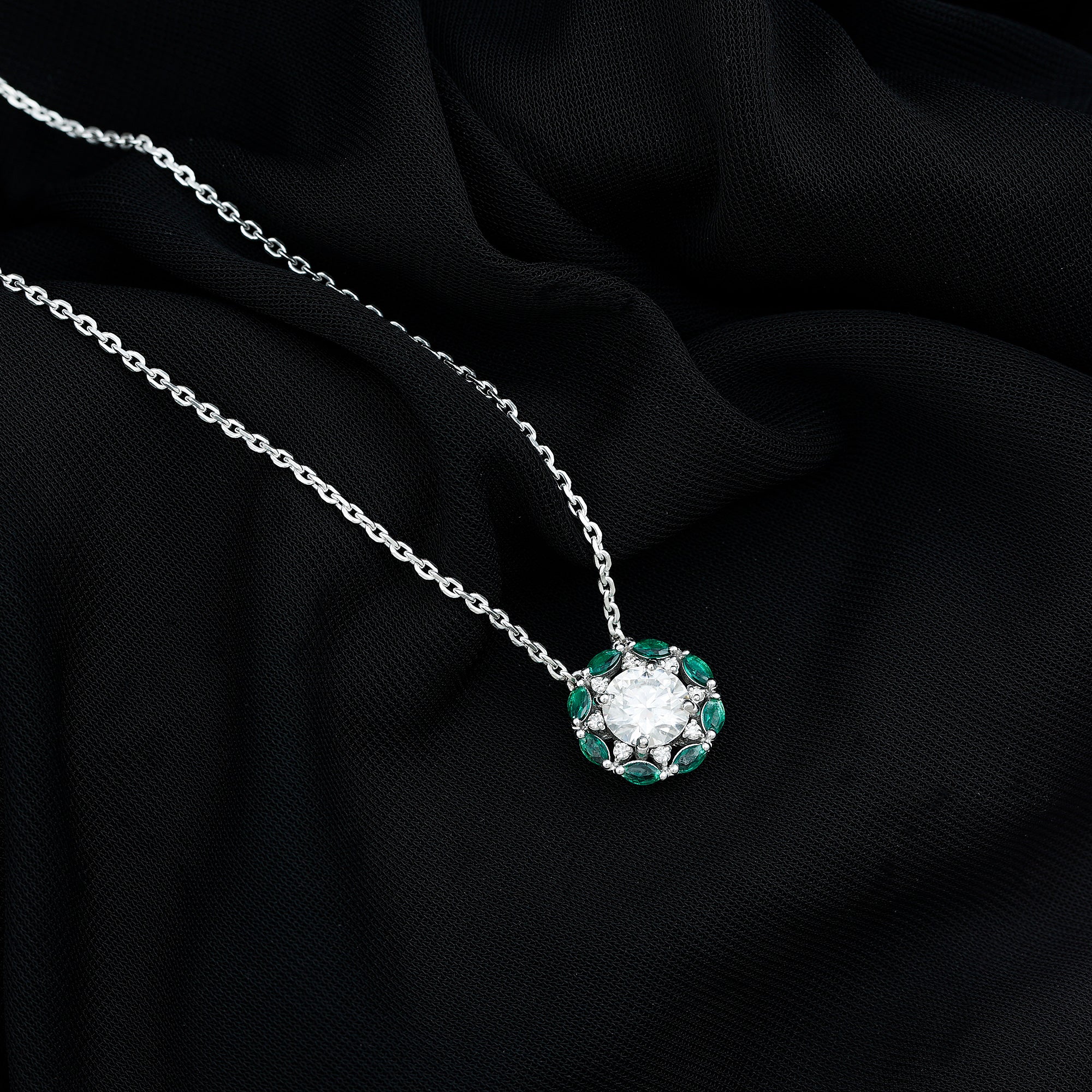 Step into the world of refined elegance with this stunning Halo Pendant Necklace - a creation of mesmerizing contrast that captures attention with every glance. It has an 8 MM round cut Moissanite set in prongs in the center, boosting D color and VS1 clarity. Encircling the hero gem are smaller round cut moissanite stones and vivid marquise cut lab created emeralds, handpicked for their AAAA quality. The rich green hue creates a striking contrast against the shimmering Moissanite. This Unique Pendant Necklace is created in 14k white gold plated silver, making it a piece of luxury designs. Curated with passion by skilled artisans, every detail reflects finesse and creativity. Suspended effortlessly from a sleek cable chain, this Moissanite and Emerald Necklace feels both timeless and contemporary.
