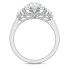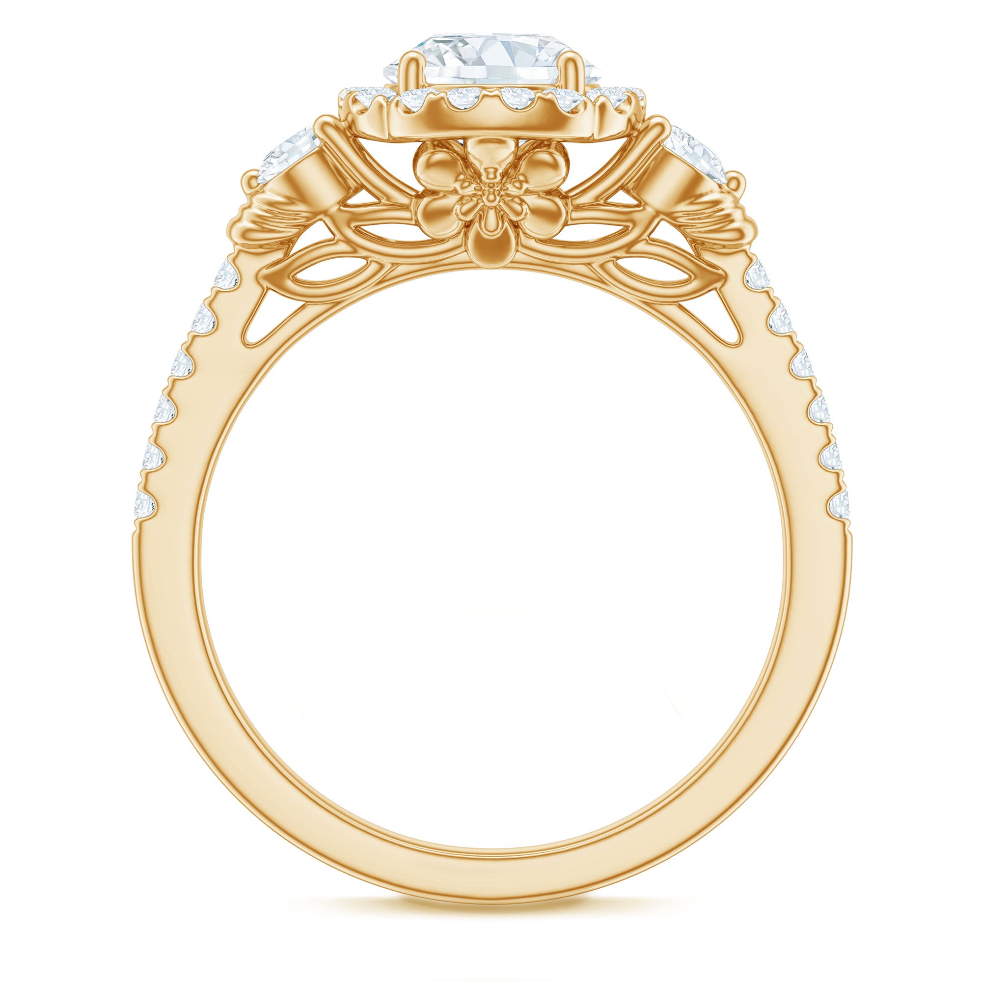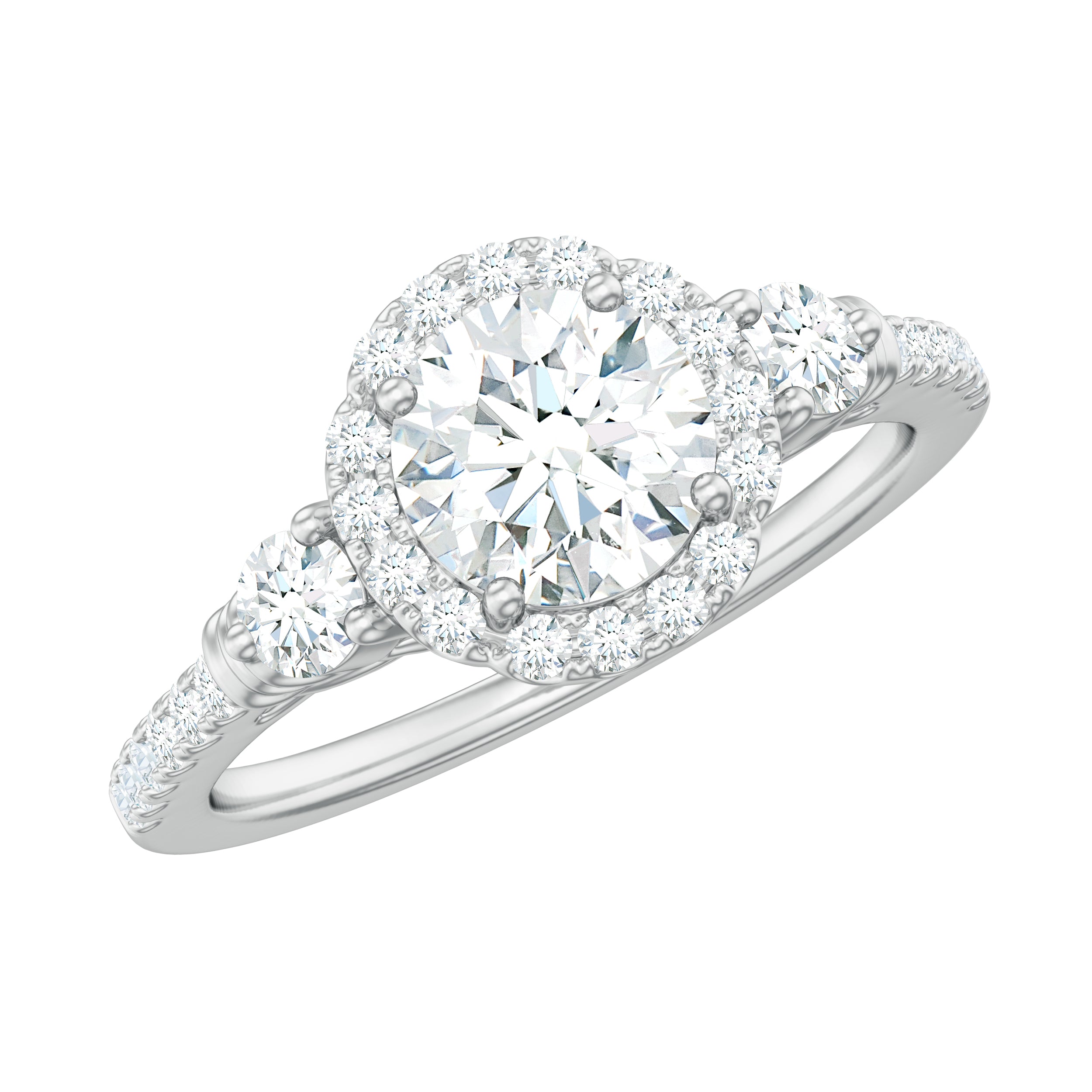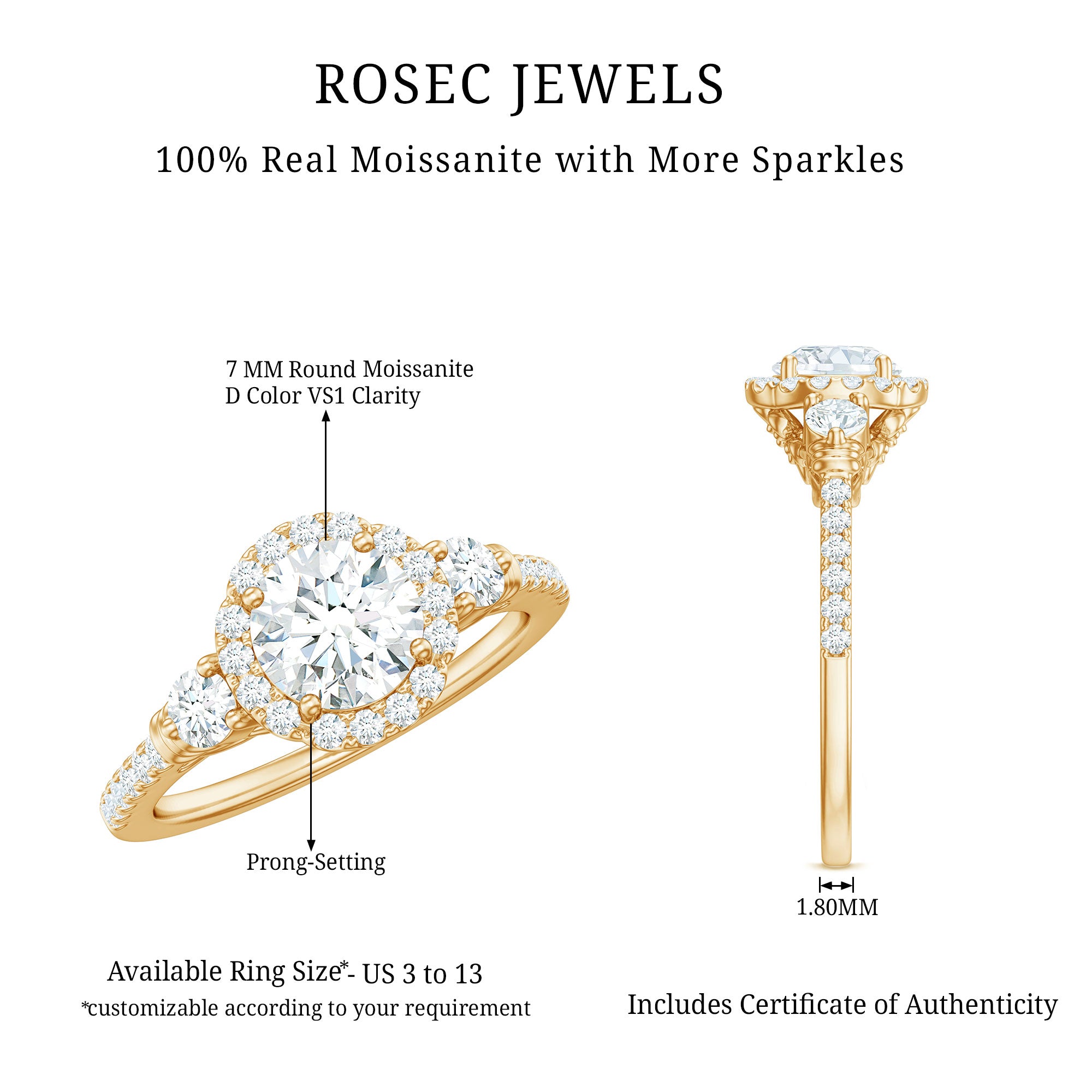 This stunning Round Moissanite Engagement Ring is a perfect blend of timeless elegance and thoughtful design. At the heart of this ring is a 7 MM brilliant round cut Moissanite, surrounded by a halo of sparkling stones that enhance its natural shine. The halo style not only amplifies the center stone’s brilliance but also gives the ring a radiant and luxurious look from every angle. What truly sets this Classic Engagement Ring apart is the intricate attention to detail. The ring features 3 MM sparkling side stones on either side of the center, adding extra charm and dimension to the overall design. The band is further lined with smaller round stones that extend halfway along the shank, bringing a continuous sparkle to the piece. Take a closer look beneath the center stone and you will discover a beautifully crafted gallery adorned with a delicate floral motif. This hidden detail adds a unique, romantic touch, perfect for those who appreciate artistry in the smallest elements. The gentle curves and openwork in the gallery give this Halo Engagement Ring a graceful profile while maintaining strength and comfort. This 1 Carat Moissanite Ring is a timeless statement of love and commitment. Whether for a proposal, anniversary, or special moment, this moissanite ring is an unforgettable symbol of your journey together.