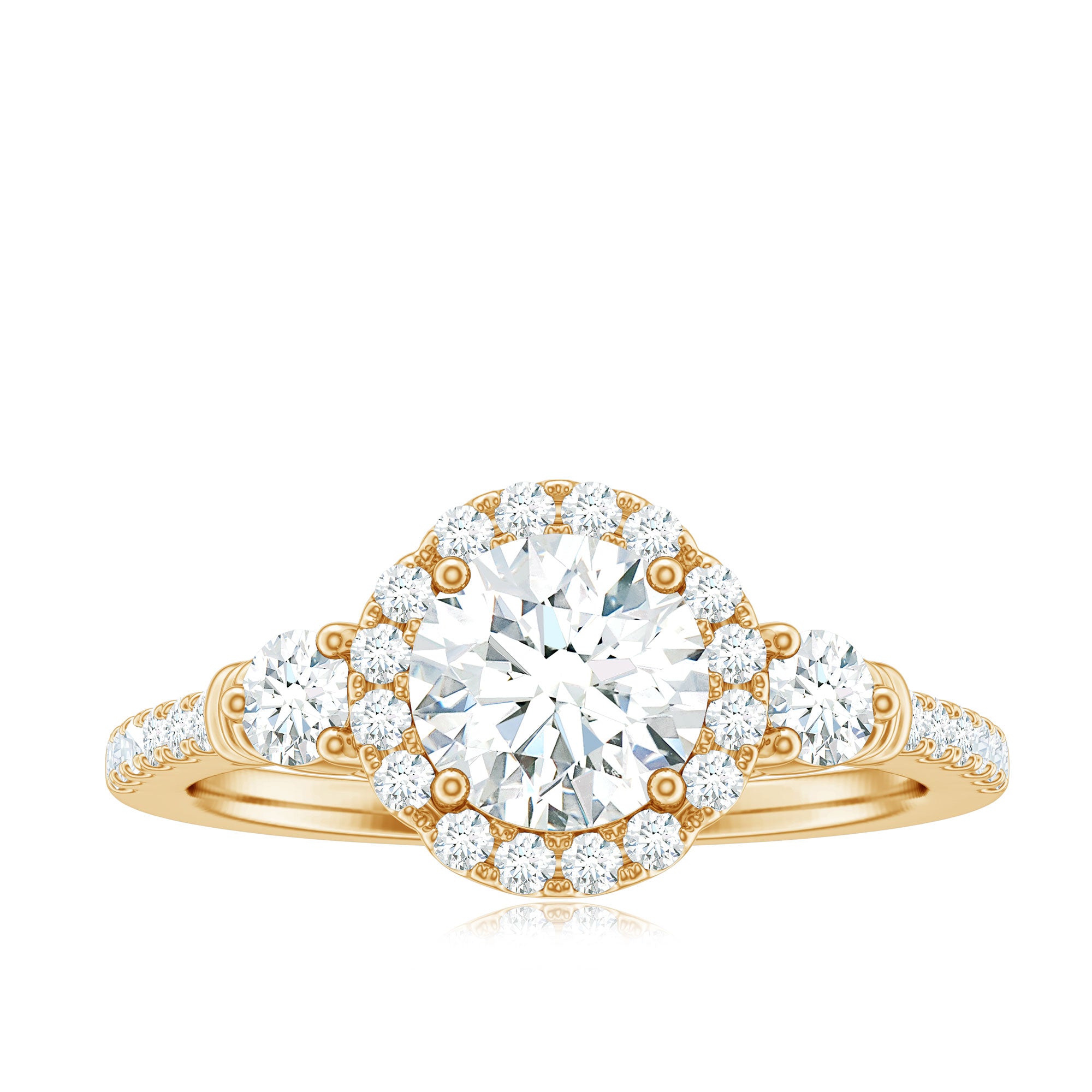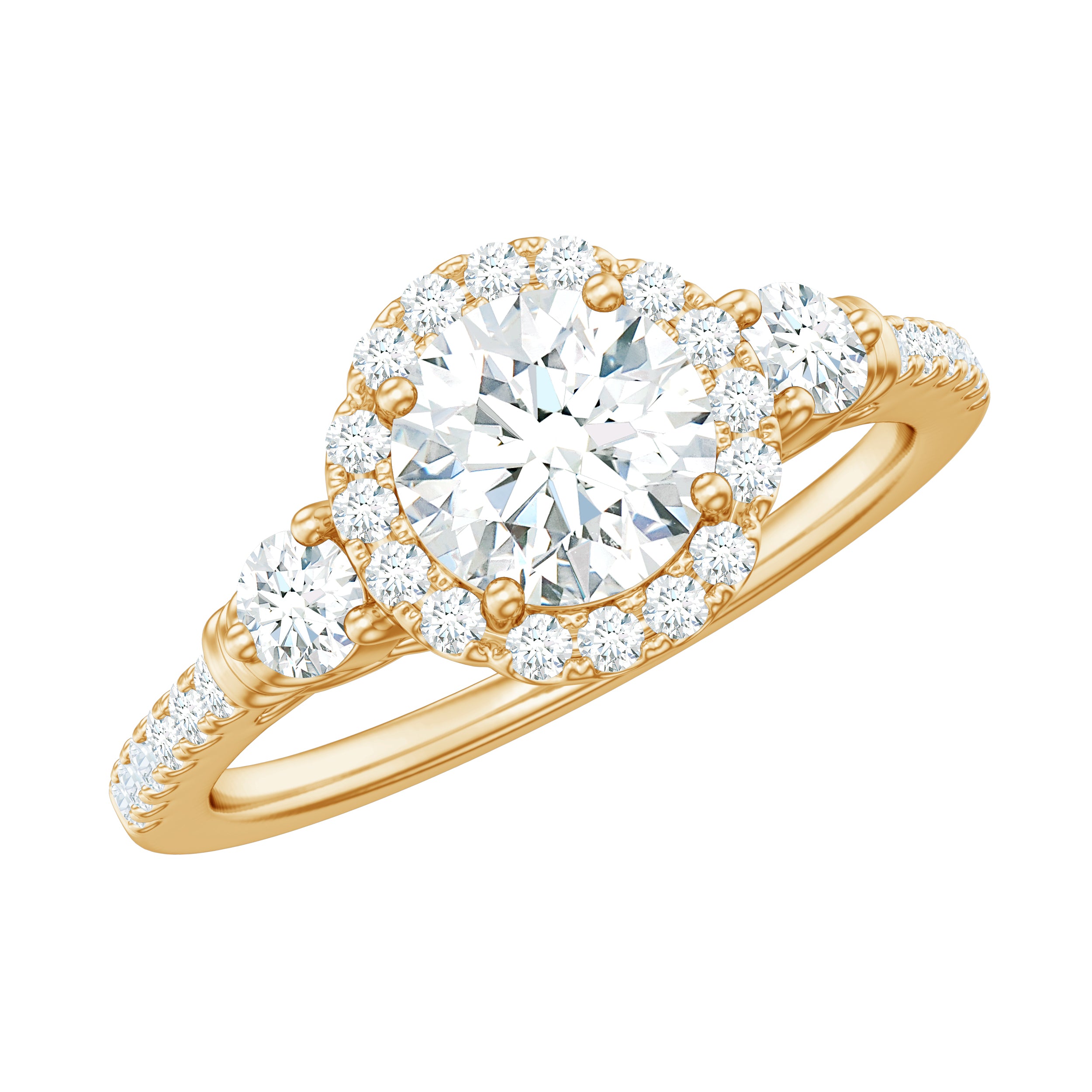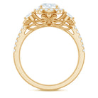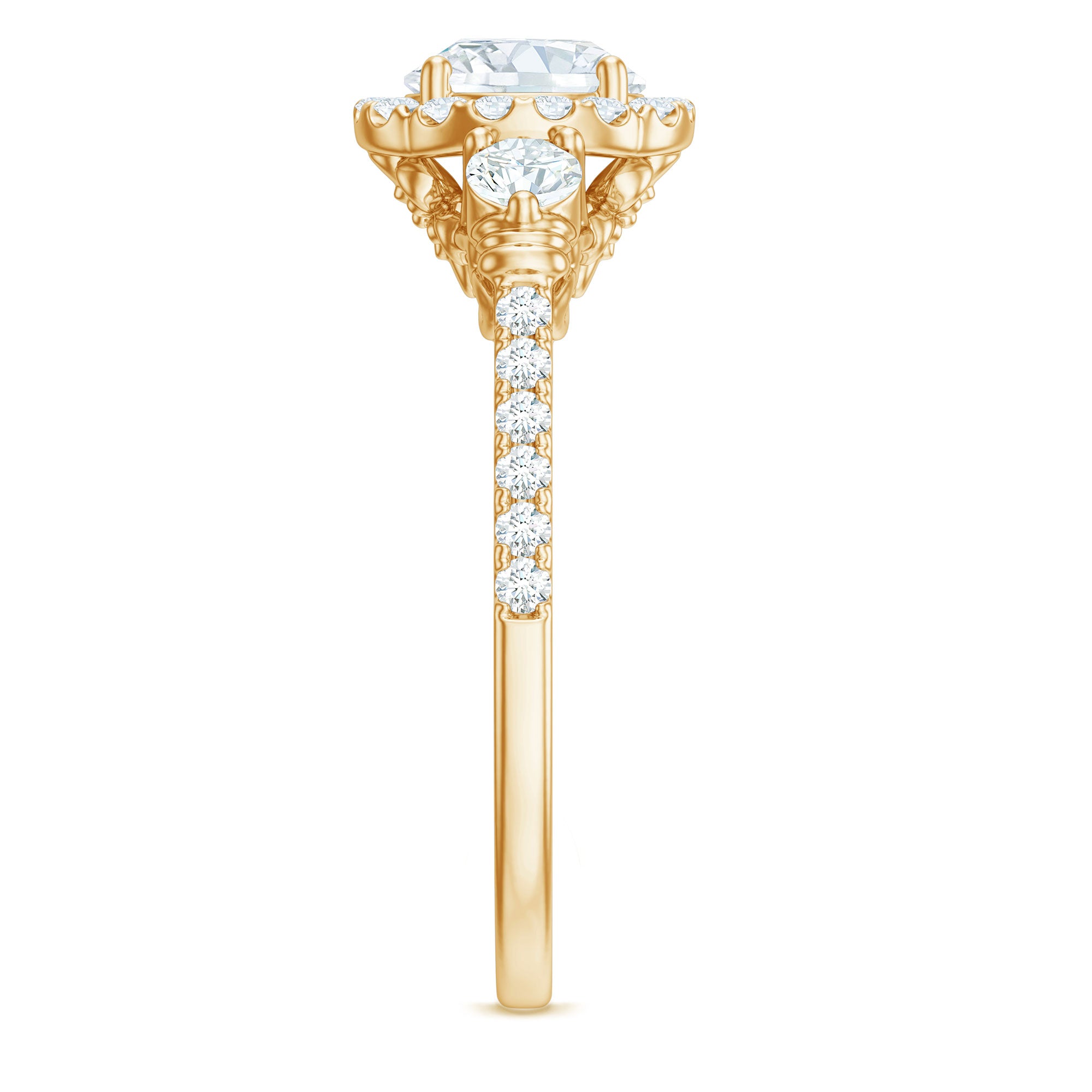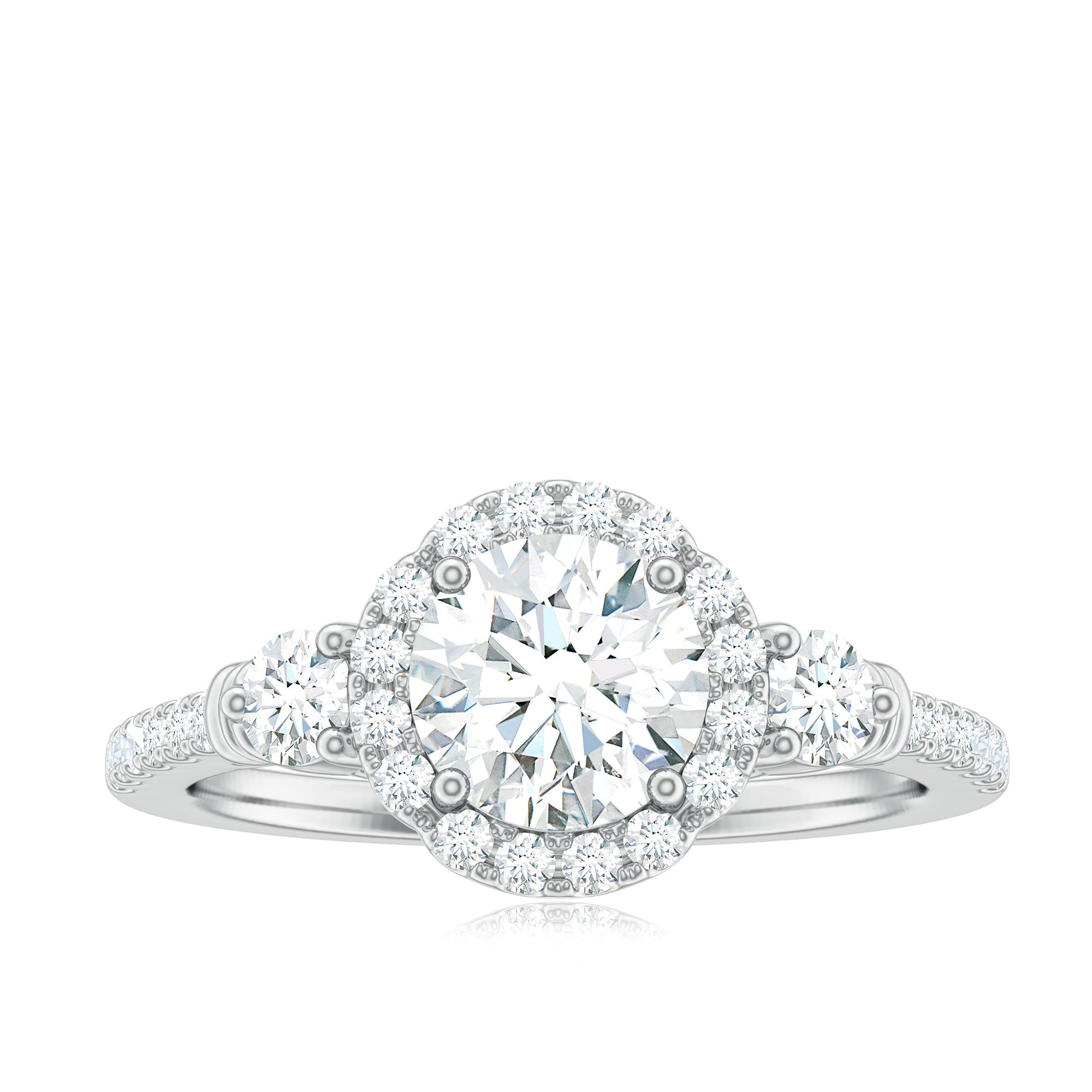 This stunning Round Moissanite Engagement Ring is a perfect blend of timeless elegance and thoughtful design. At the heart of this ring is a 7 MM brilliant round cut Moissanite, surrounded by a halo of sparkling stones that enhance its natural shine. The halo style not only amplifies the center stone’s brilliance but also gives the ring a radiant and luxurious look from every angle. What truly sets this Classic Engagement Ring apart is the intricate attention to detail. The ring features 3 MM sparkling side stones on either side of the center, adding extra charm and dimension to the overall design. The band is further lined with smaller round stones that extend halfway along the shank, bringing a continuous sparkle to the piece. Take a closer look beneath the center stone and you will discover a beautifully crafted gallery adorned with a delicate floral motif. This hidden detail adds a unique, romantic touch, perfect for those who appreciate artistry in the smallest elements. The gentle curves and openwork in the gallery give this Halo Engagement Ring a graceful profile while maintaining strength and comfort. This 1 Carat Moissanite Ring is a timeless statement of love and commitment. Whether for a proposal, anniversary, or special moment, this moissanite ring is an unforgettable symbol of your journey together.