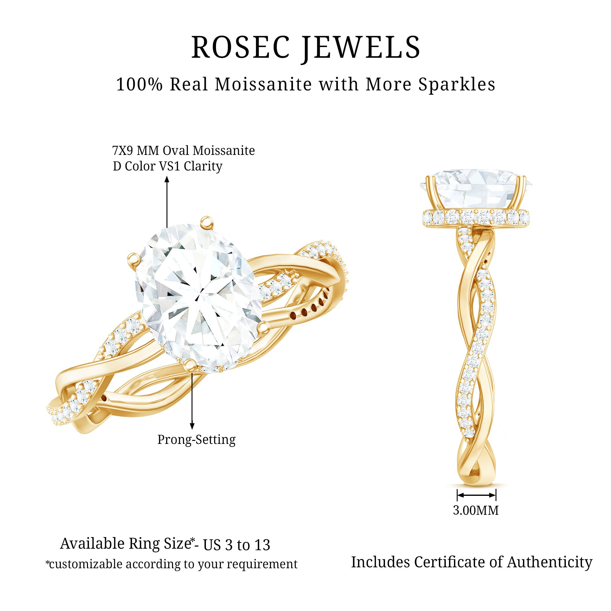 Gracefully presenting a marvelous 7X9 MM Oval Cut Moissanite embedded in the center with Hidden Halo. This Solitaire Engagement Ring features a braided shank where one strand is in plain metal, and the other strand is studded with tiny glimmering moissanite gemstones. The D-VS1 Quality Moissanite featured in the ring will make your lady stun. This Moissanite Oval Engagement Ring is handcrafted for your special day. This Hidden Halo Engagement Ring will be delivered to you in premium packaging which ensures that your emotions attached to this ring are secured. Your purchase will include the certificate of gemstone authentication assuring the quality of gemstone.