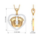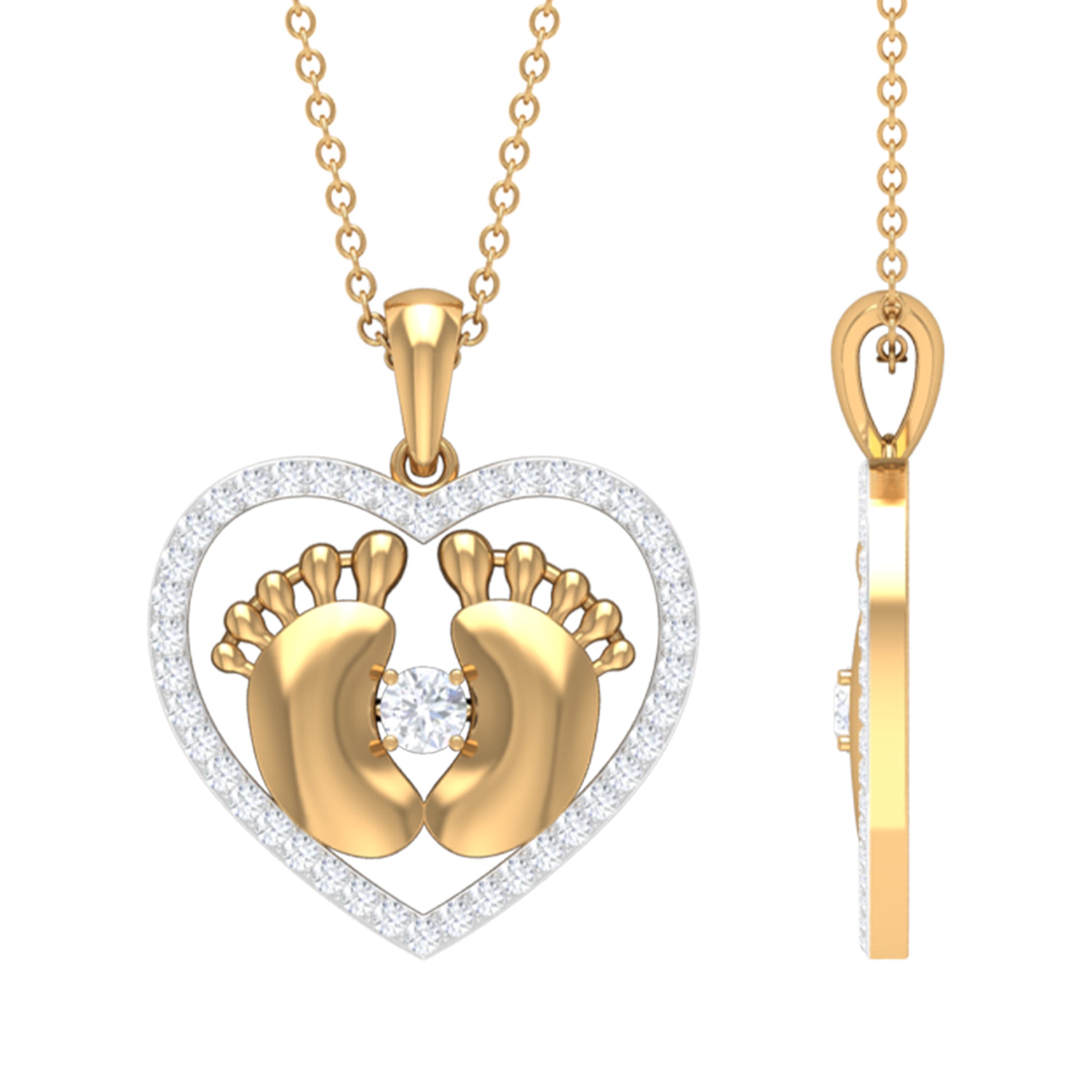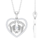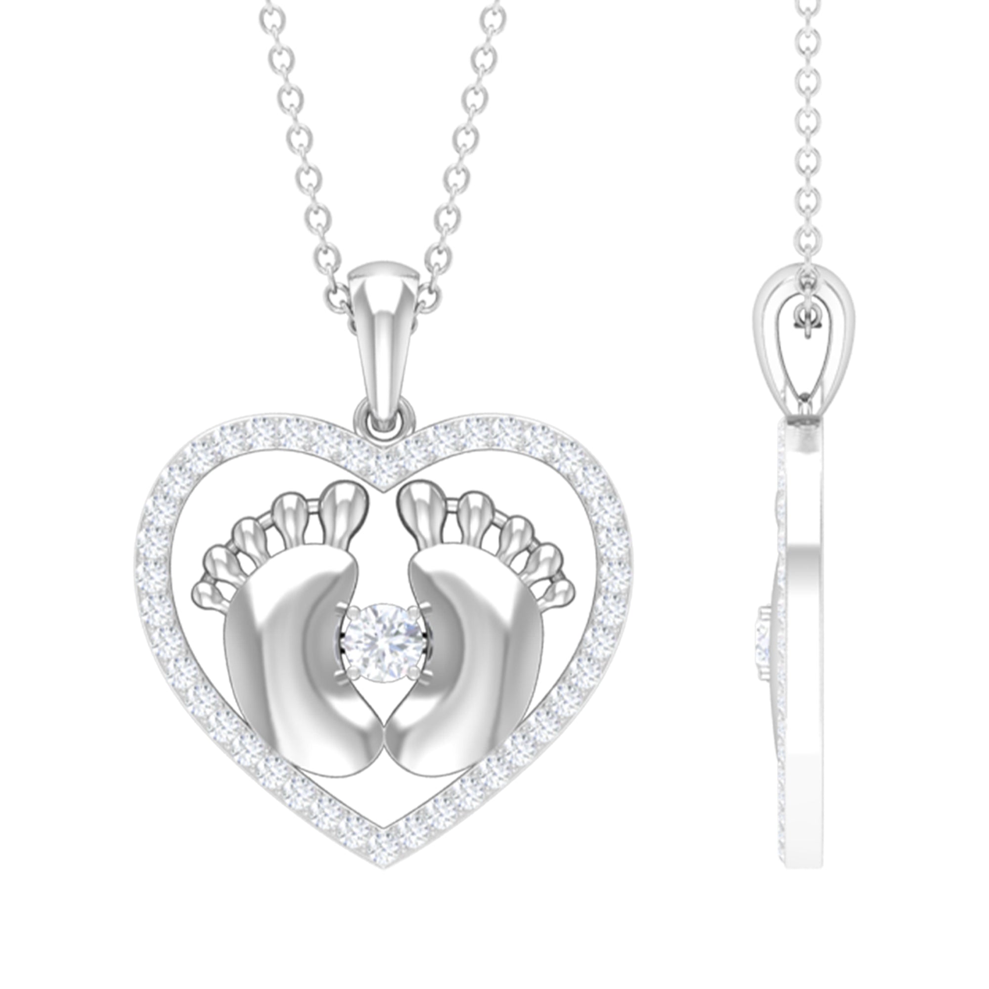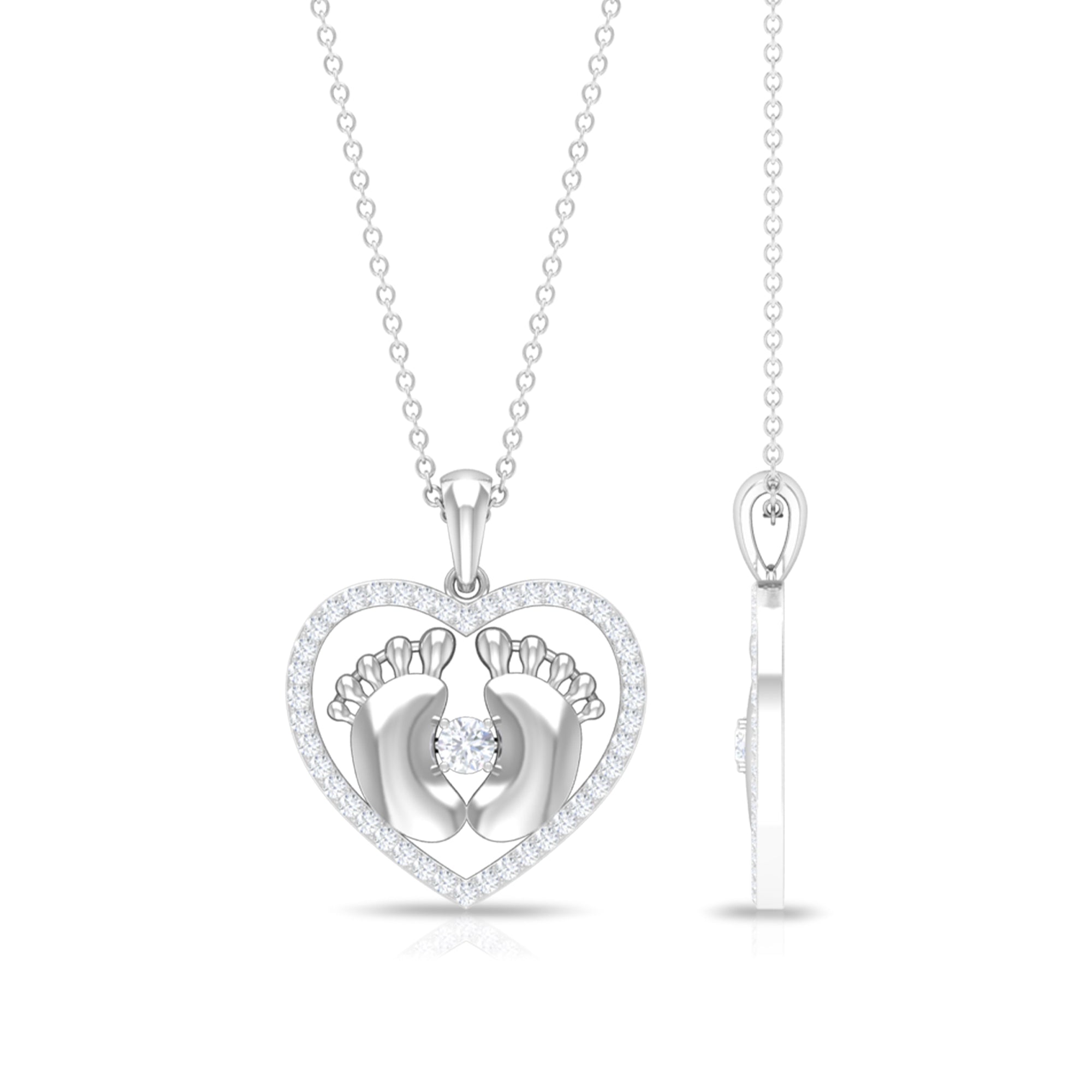 Celebrate Motherhood with this Moissanite Pendant. It features a unique design that includes a metallic baby foot placed in the Moissanite studded Heart frame. A 3 MM Moissanite placed at the center in Prong Setting. This Heart Pendant Necklace is perfect for being presented to a Mom-to-be or a new mom. The cute baby feet make the design of this pendant unique and behold the classic shine of D-VS1 Quality Moissanite. Get this pendant for the one who is going to experience motherhood soon. This Heart Moissanite Pendant will be delivered to you in a classic jewelry box with a certificate of authenticity.