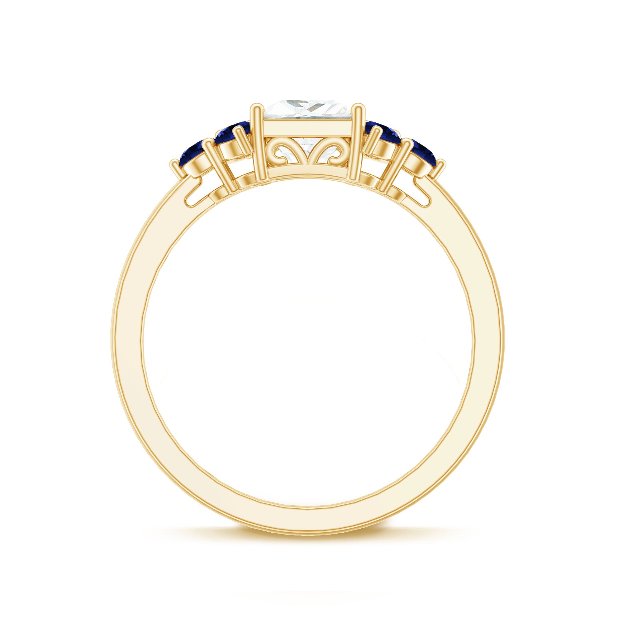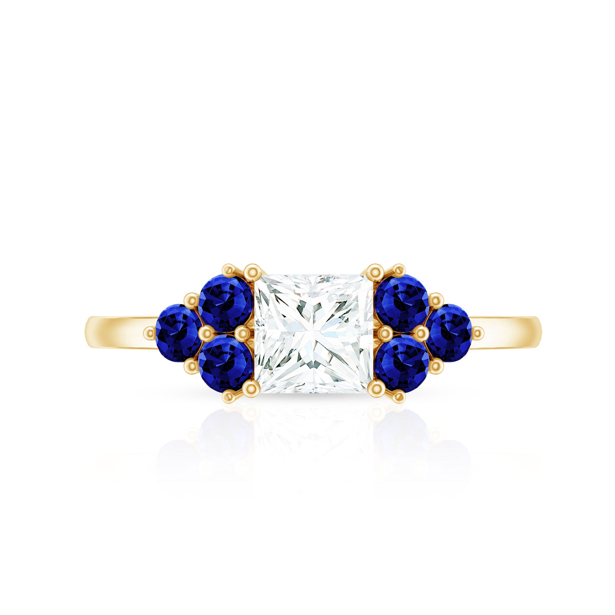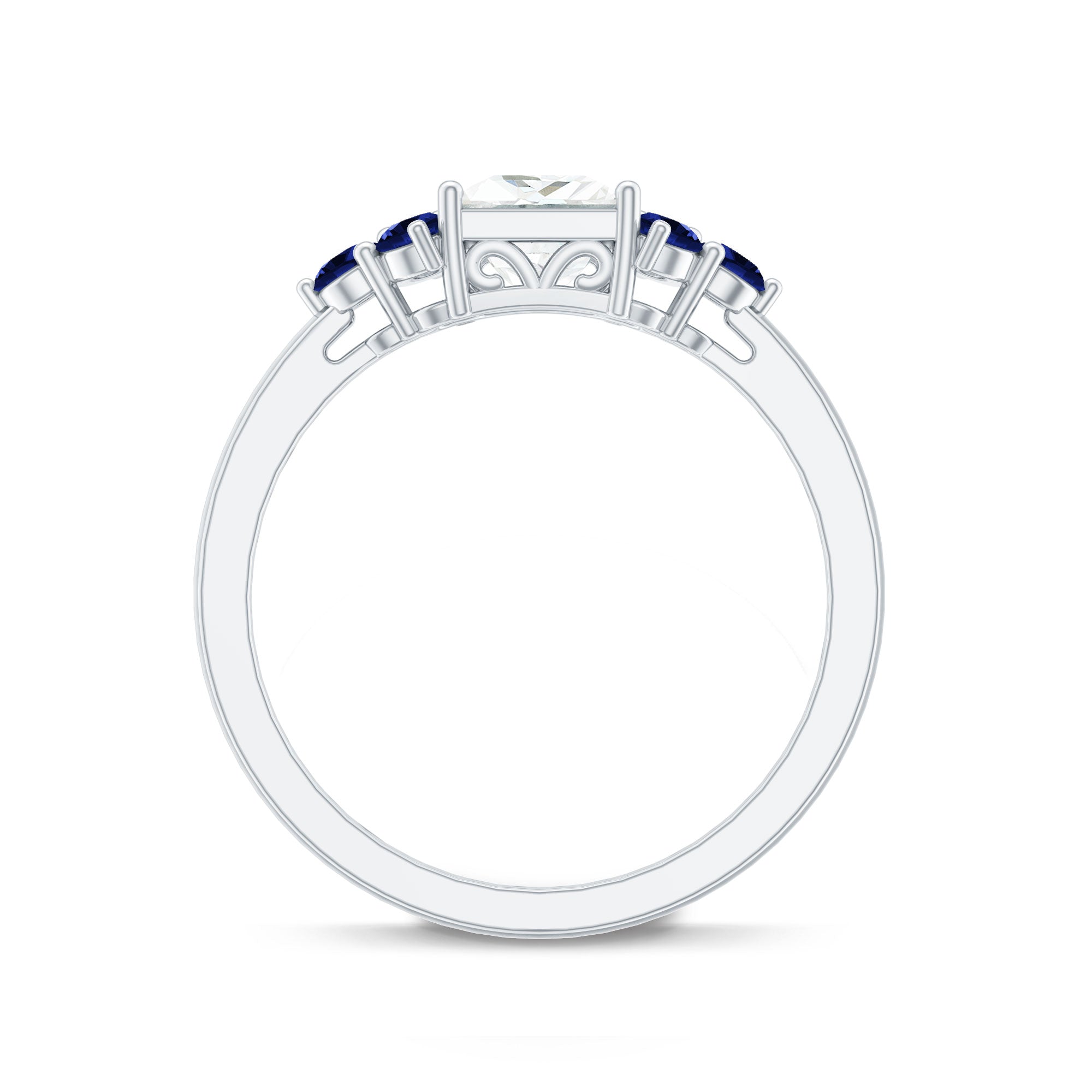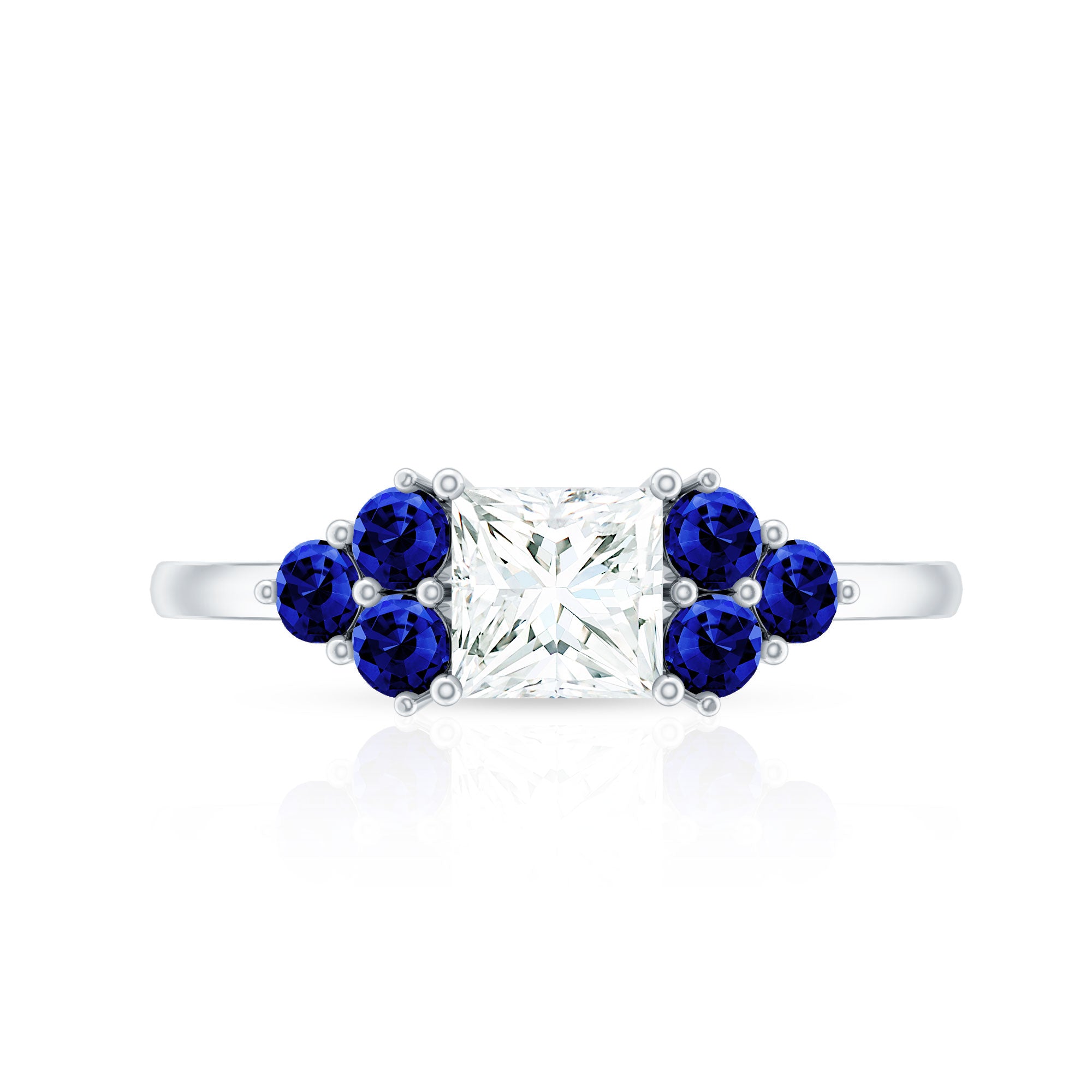 Delicate, timeless, and full of quiet charm, this Moissanite Engagement Ring is designed to reflect elegance in the most effortless way. At the heart of this ring lies a sparkling 5 MM princess cut moissanite of D-VS1 grade set in prong setting. On either side of the center stone are three round cut lab created blue sapphires, carefully chosen for AAAA quality. Their subtle arrangement adds a graceful contrast, bringing a serene pop of color without overpowering the design. This elegant Moissanite and Sapphire Ring is perfect for someone who appreciates classic beauty with a twist of color. Whether you are marking a special moment or planning a heartfelt proposal, this piece speaks of love, thoughtfulness, and enduring simplicity. The Promise Engagement Ring is available in multiple metal options, ring sizes, and finishes, allowing you to personalize it just the way you like. It also comes with a certificate of gemstone authentication and is presented in a charming jewelry box , ready to gift, or to keep safe as a treasured keepsake.