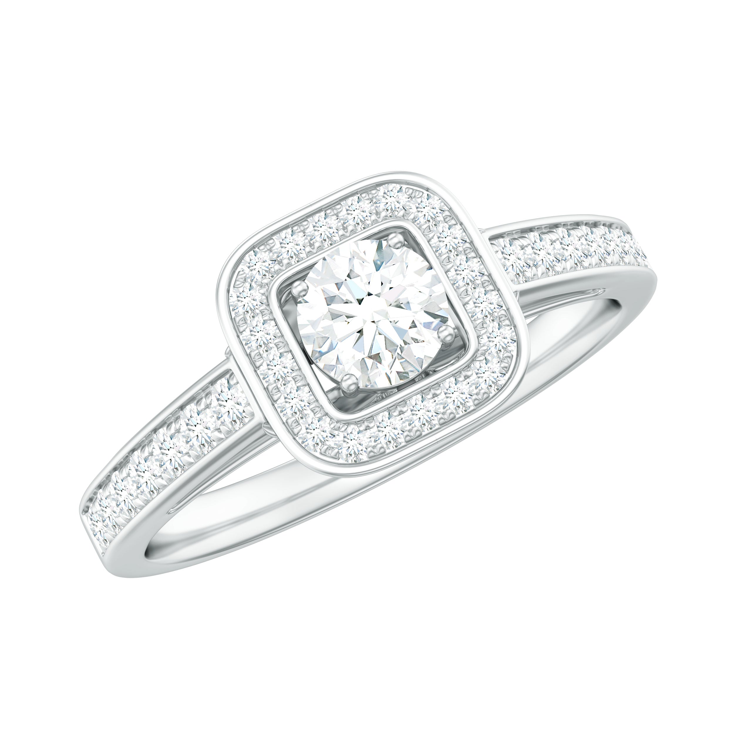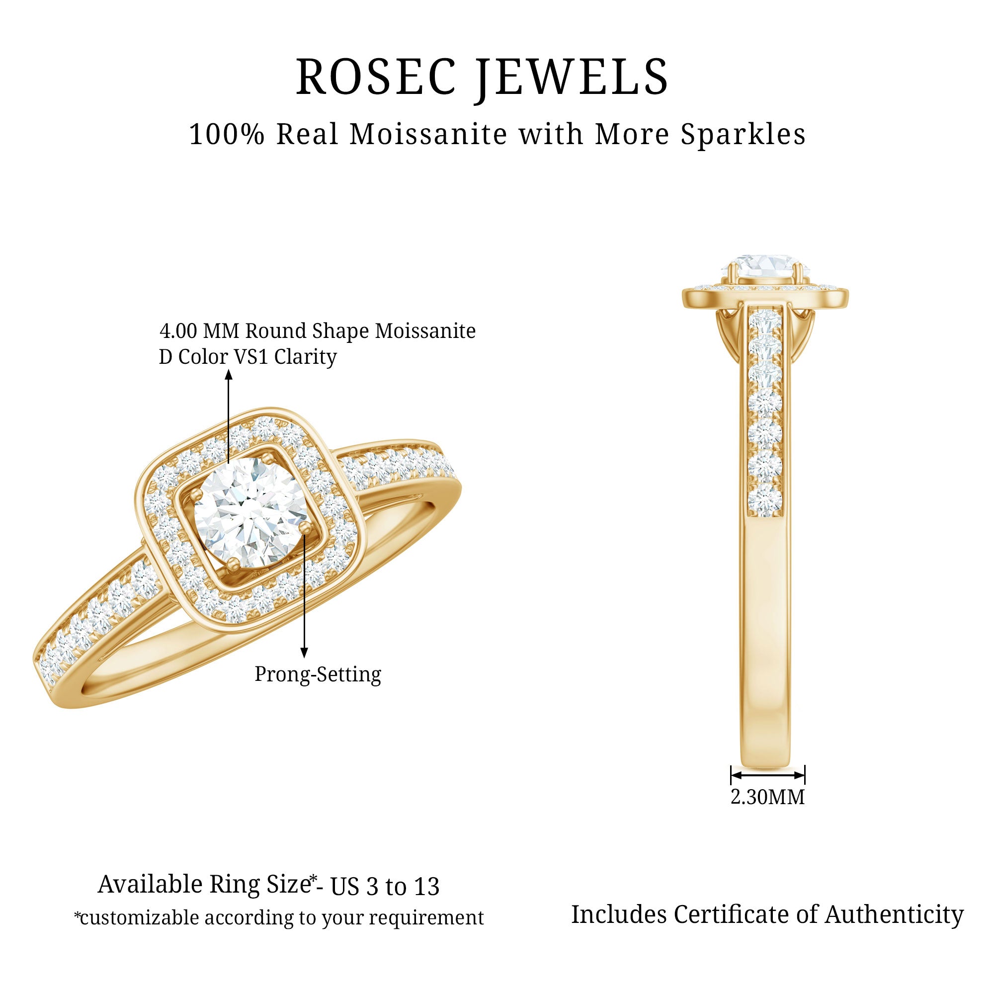 A timeless sparkle with a modern twist, this Moissanite Engagement Ring is where classic romance meets contemporary elegance. At the heart of this radiant design lies a 4 MM Round Cut Moissanite, expertly set in secure prong setting that lets its brilliance shine through effortlessly. Surrounding it is a striking square shaped halo, crafted with shimmering round moissanite stones. The band itself is sleek and adorned with a row of carefully set round moissanites, offering just the right amount of extra sparkle while maintaining a refined profile. Designed for those who appreciate detail, light, and meaning, this Halo Engagement Ring balances sophistication with simplicity. Whether you are popping the question or celebrating a milestone, it is made to capture hearts. This Classic Engagement Ring is available in a wide range of US sizes from 3 to 13 and can be customized in various metal colors and finishes to suit your personal style. It also arrives in a premium jewelry box with a certificate of authenticity, making it a ready-to-gift treasure.