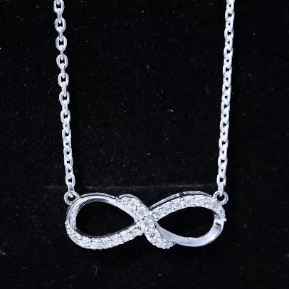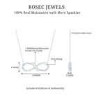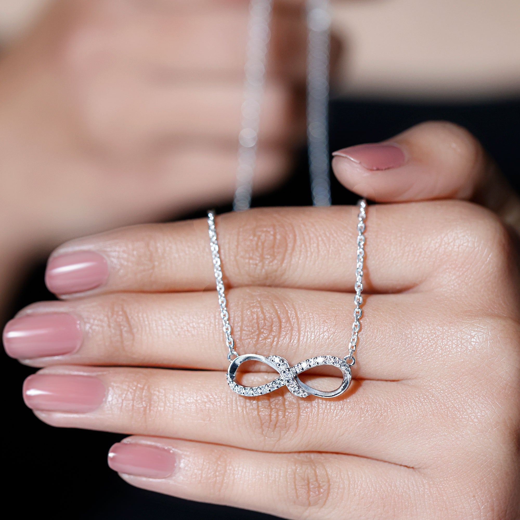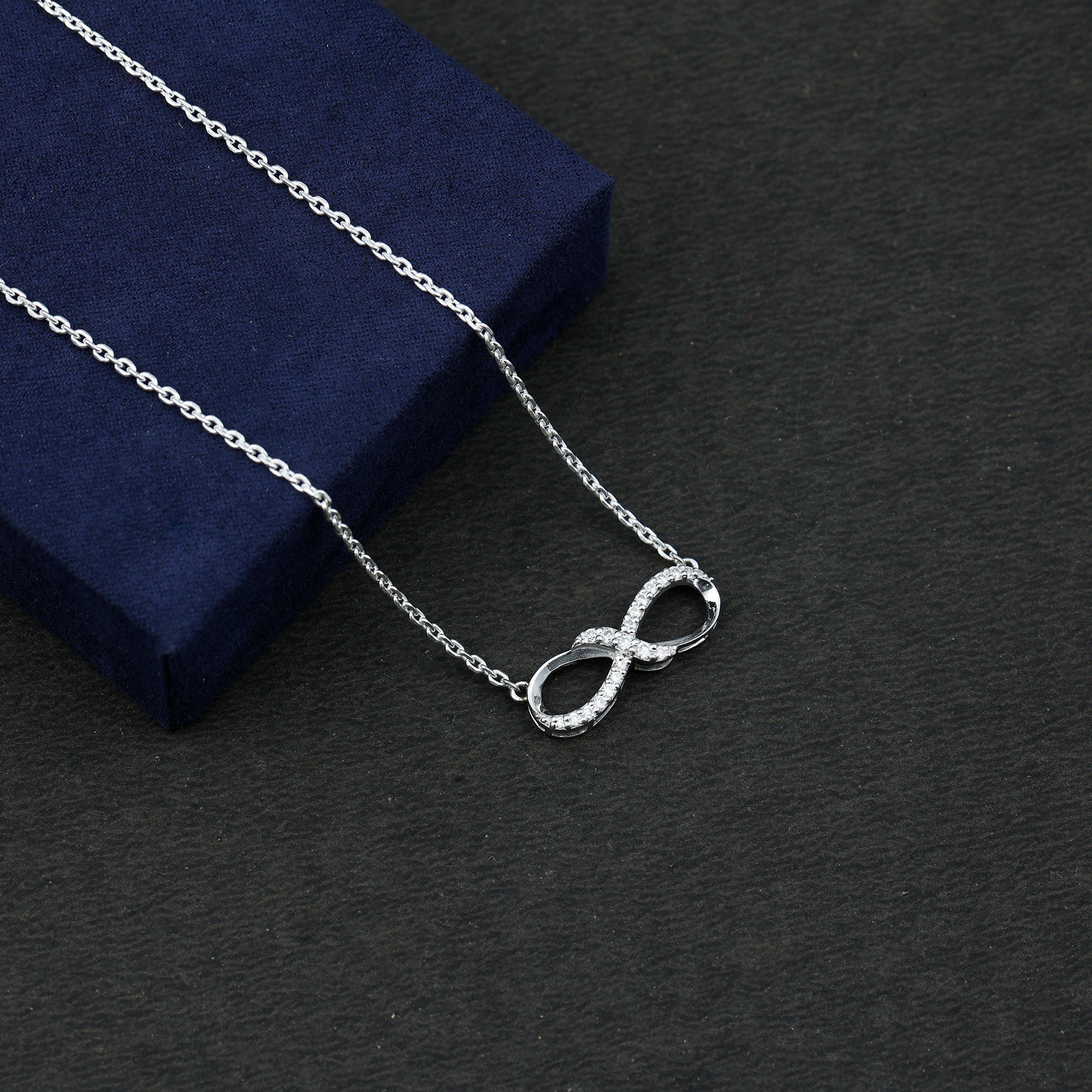 This Moissanite Pendant Necklace is a deep symbol of eternity, unity, and an unbreakable connection. Blending timeless beauty with lasting charm, this Infinity Knot Necklace provides insights by remaining pristine for years. Made from white gold plated silver, this Forever Symbol Necklace features round brilliant cut Moissanite stones in pave setting on the infinity design with a minimalist style, symbolizing the most treasured relationships and timeless values. This Moissanite Infinity Necklace stands as a lasting testament to the bond it signifies. Representing boundlessness and limitlessness. The stunning sparkle of D-VS1 Quality Moissanite is truly breathtaking. Incorporate this necklace into your everyday outfit and select a piece of jewelry that holds significance for you and remains with you throughout your life. As a true and undying love, it is intricately crafted to incorporate a refined style that captures the essence of forever.