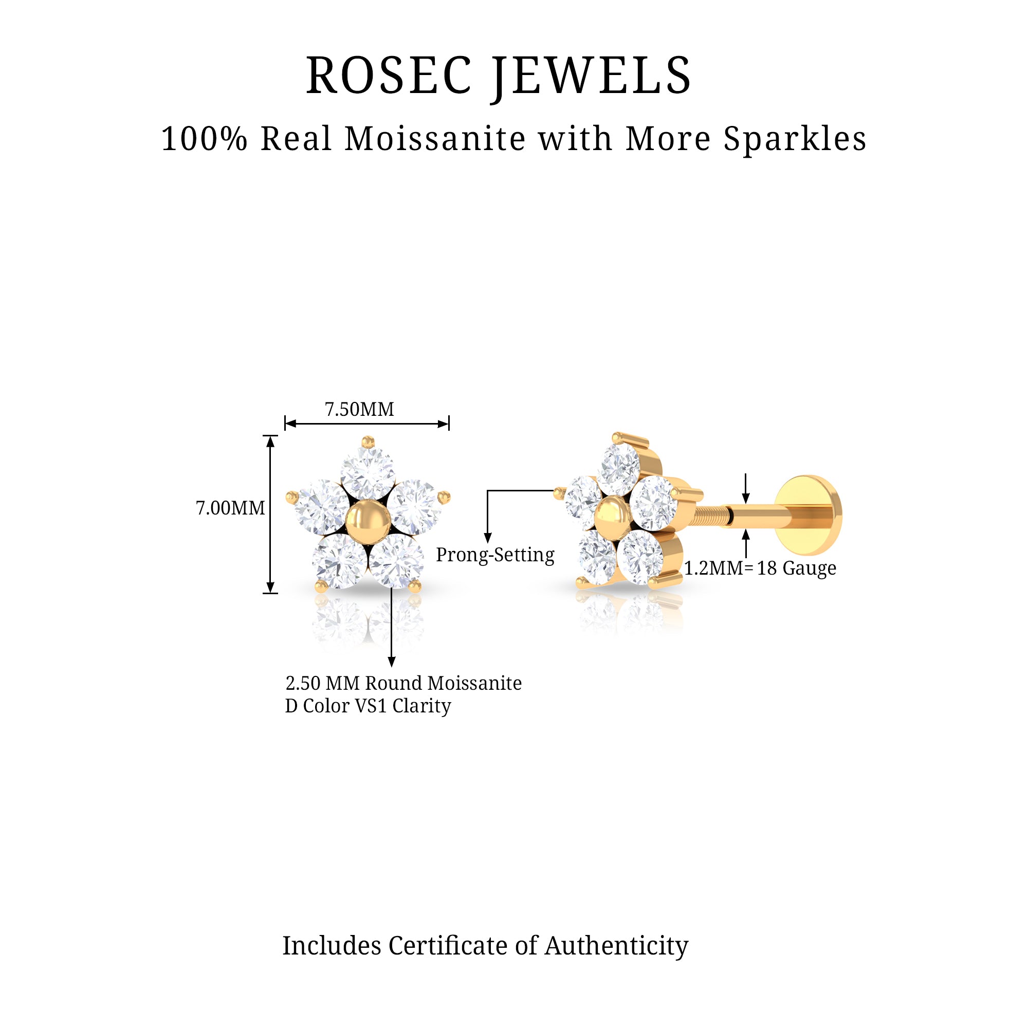 Adorn yourself with our exquisite Flower Earring adorned with Round Cut Moissanites in Prong Setting, arranged in the shape of a blooming flower. The Floral Earring can be worn on your Conch, Helix, Tragus, Cartilage, or Upper Lobe Piercing, and the Flat Back Closure will keep it securely in place. This Moissanite Earring would make an excellent Graduation Gift for someone special.