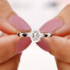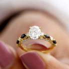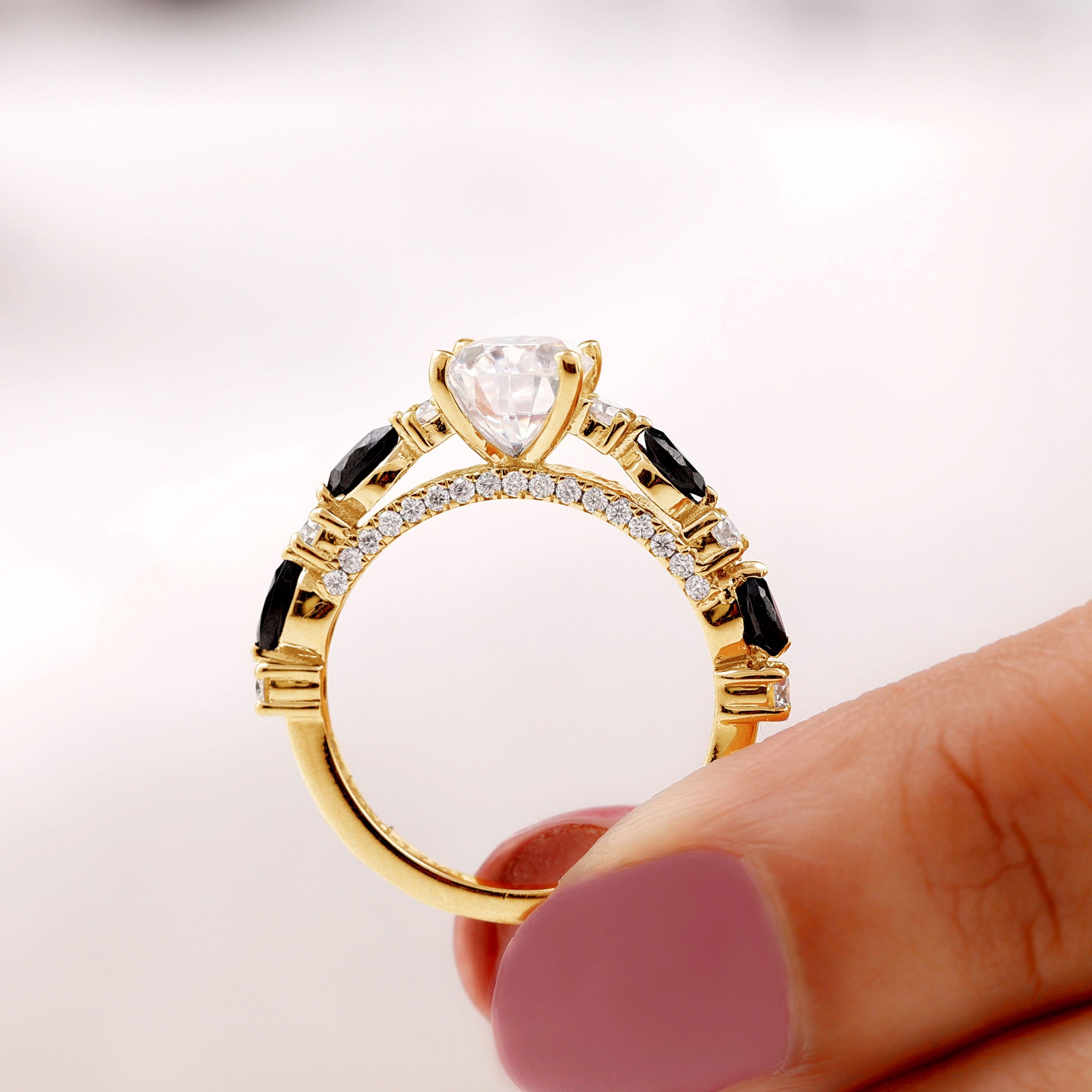 Shine as the centerpiece of any celebration with our Vintage Engagement Ring, featuring a dazzling Oval Moissanite set in a claw setting at its heart. The ring is further adorned with Marquise Cut Black Spinel and round Moissanite accents elegantly gracing the band. This ring not only signifies your commitment but also adds a touch of vintage-inspired elegance to your special moments.