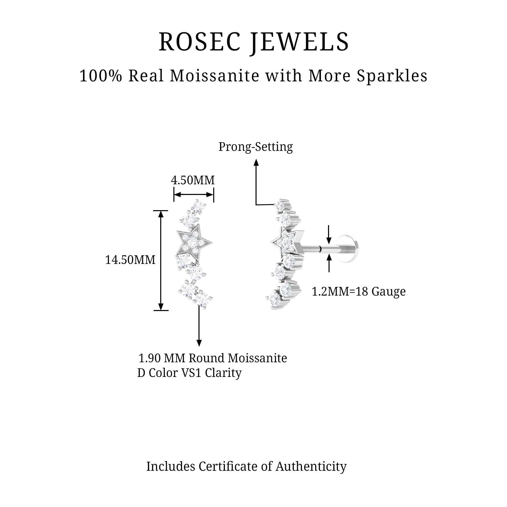 The Moissanite Star Celestial Earring is a fun and unique piece of jewelry. The design features a star-shaped frame set with Round Cut Moissanites secured in Prong Setting. Wear this Climber Earring on your Helix, Cartilage, or Upper Lobe Piercing. Crafted with Real Gold Metal for a shiny appearance.
