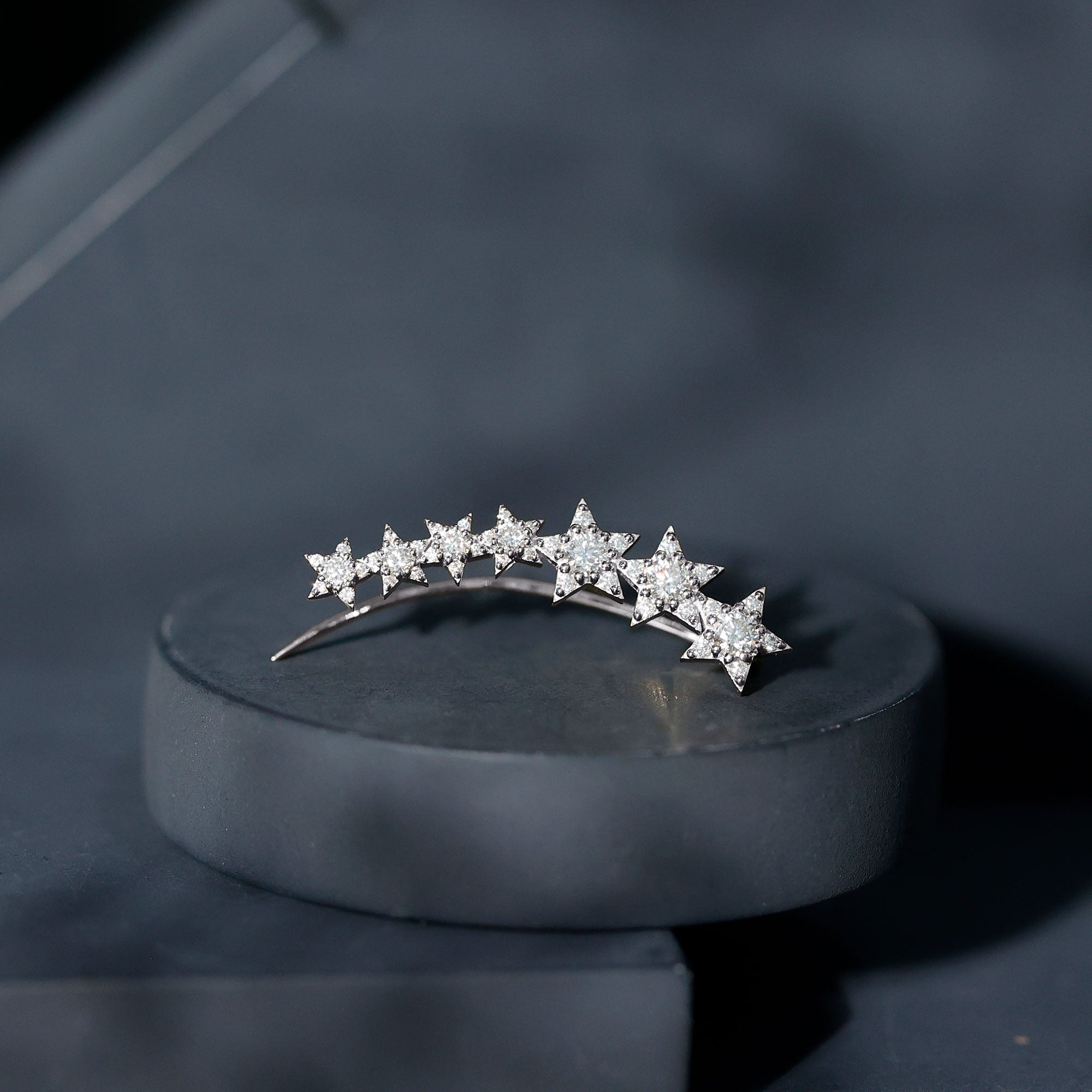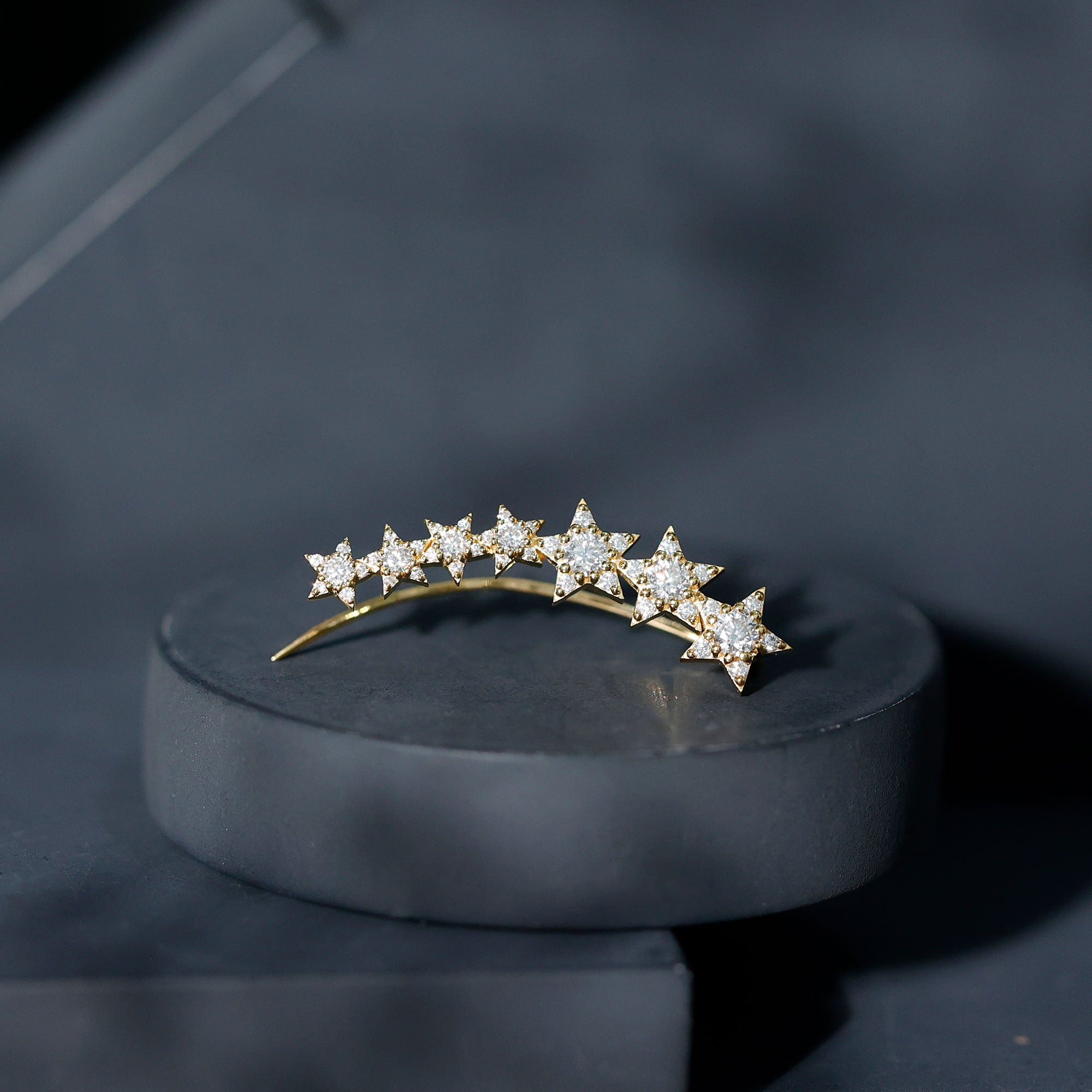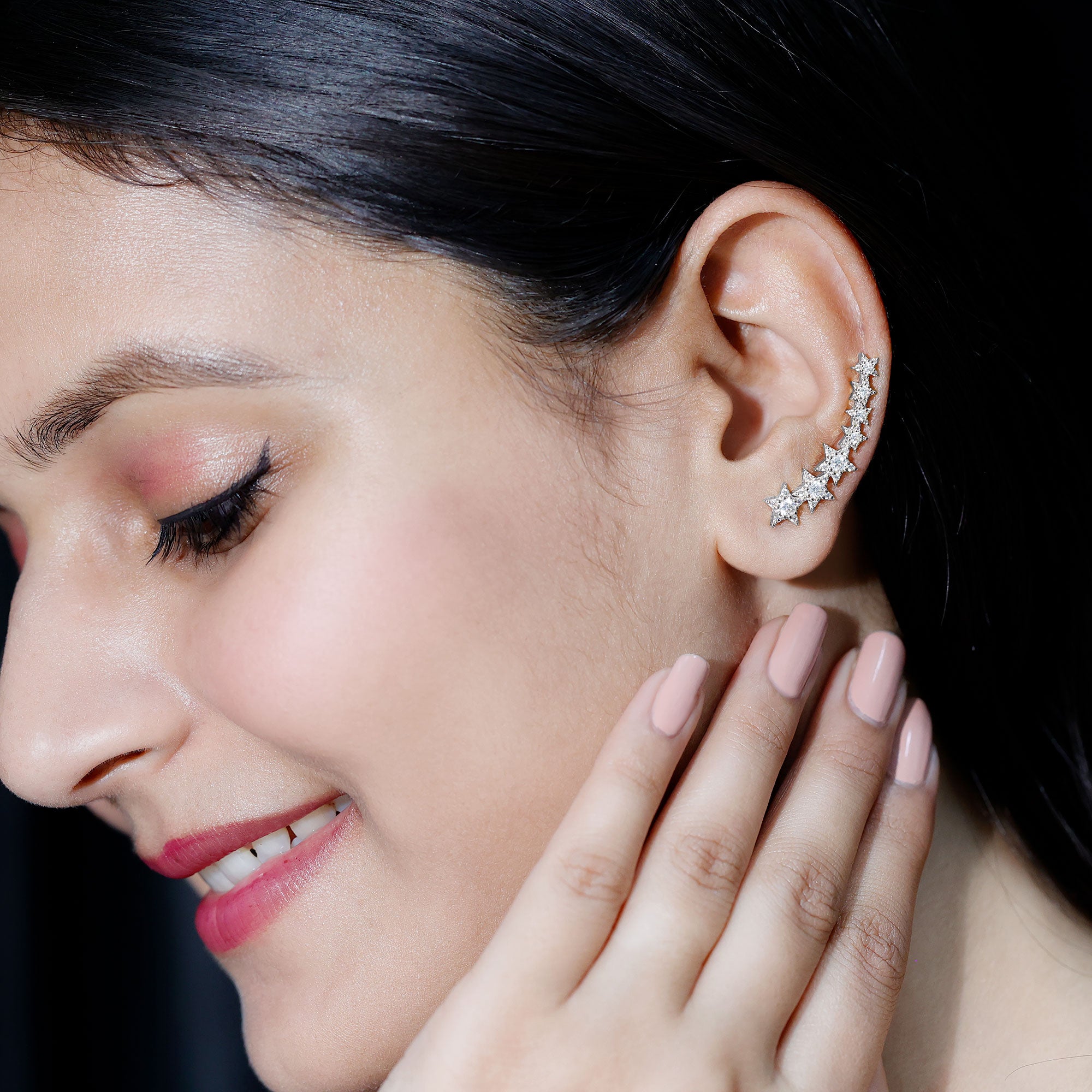This Moissanite Star Climber Earring features Round Cut Moissanite studded on a gold star design. The earring is specifically designed for cartilage, helix, and upper lobe piercings, ensuring a comfortable and secure fit. Whether youre dressing up for a special occasion or adding a touch of sparkle to your everyday look, this crawler earring is sure to impress.