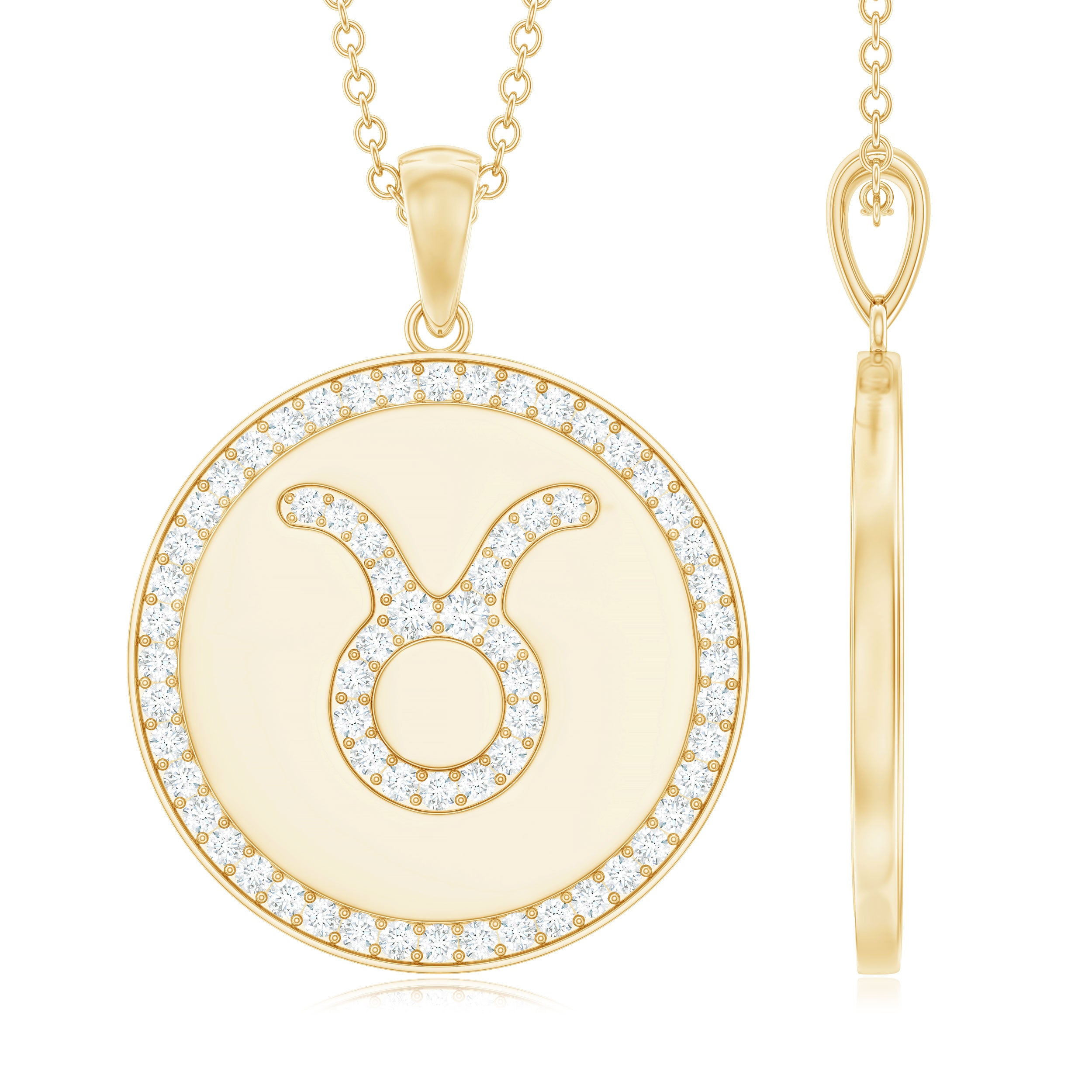 Take on the world wearing this Zodiac Disc Pendant embellished with Round Cut Moissanite in Pave Setting arranged in the pattern of Taurus Zodiac symbol. This Moissanite Zodiac Pendant has been intricately crafted in hallmarked metal, making for a flattering accessory for all the May borns out there.