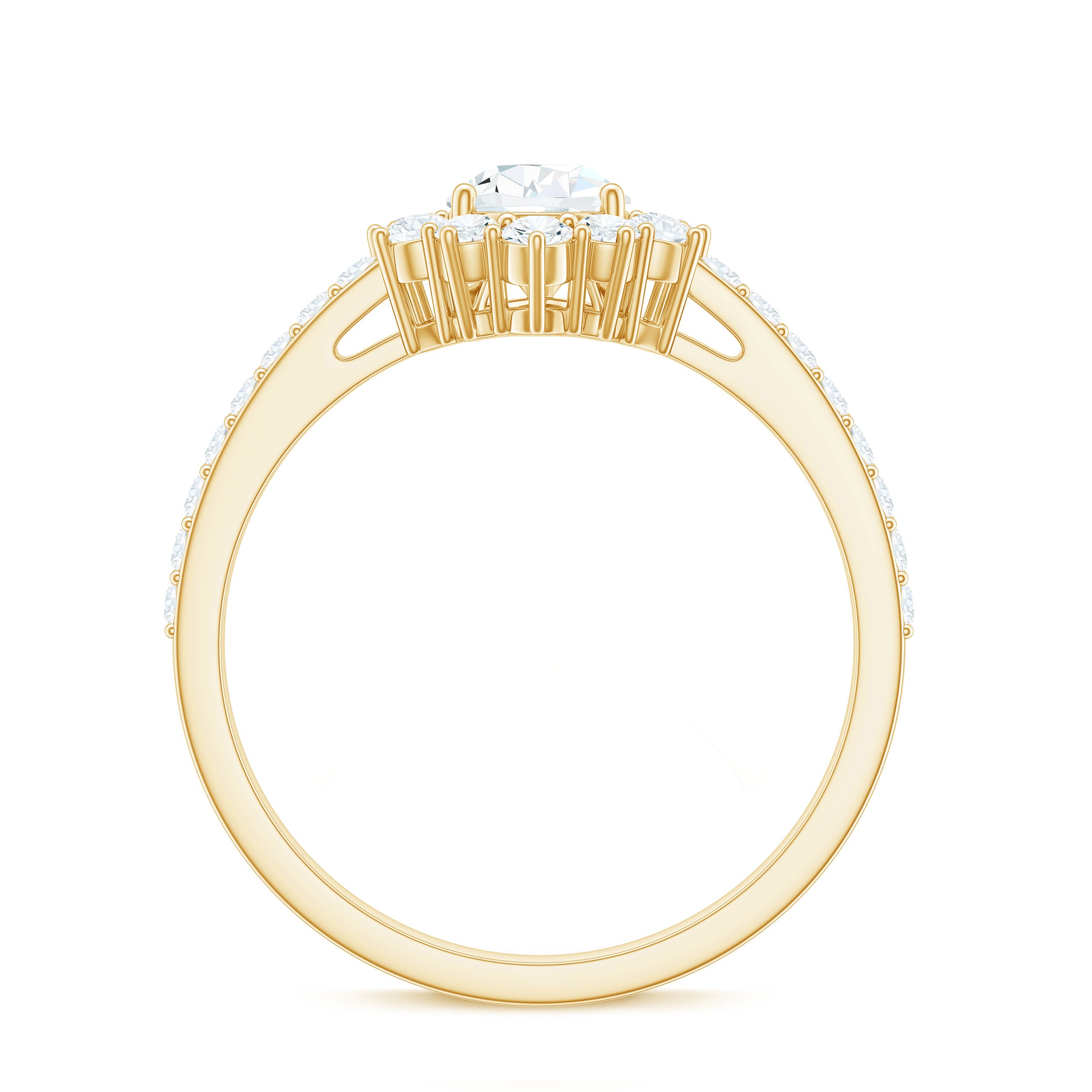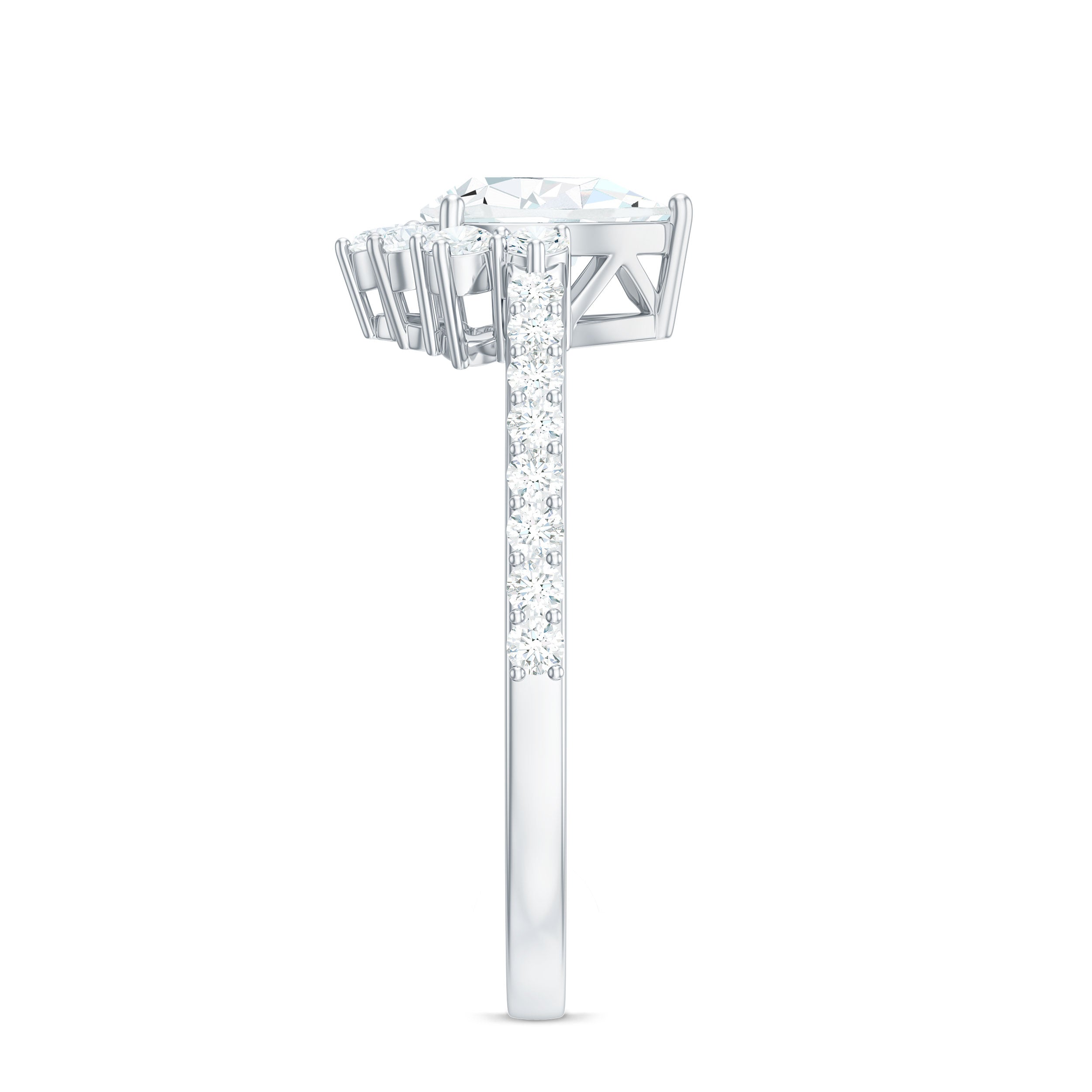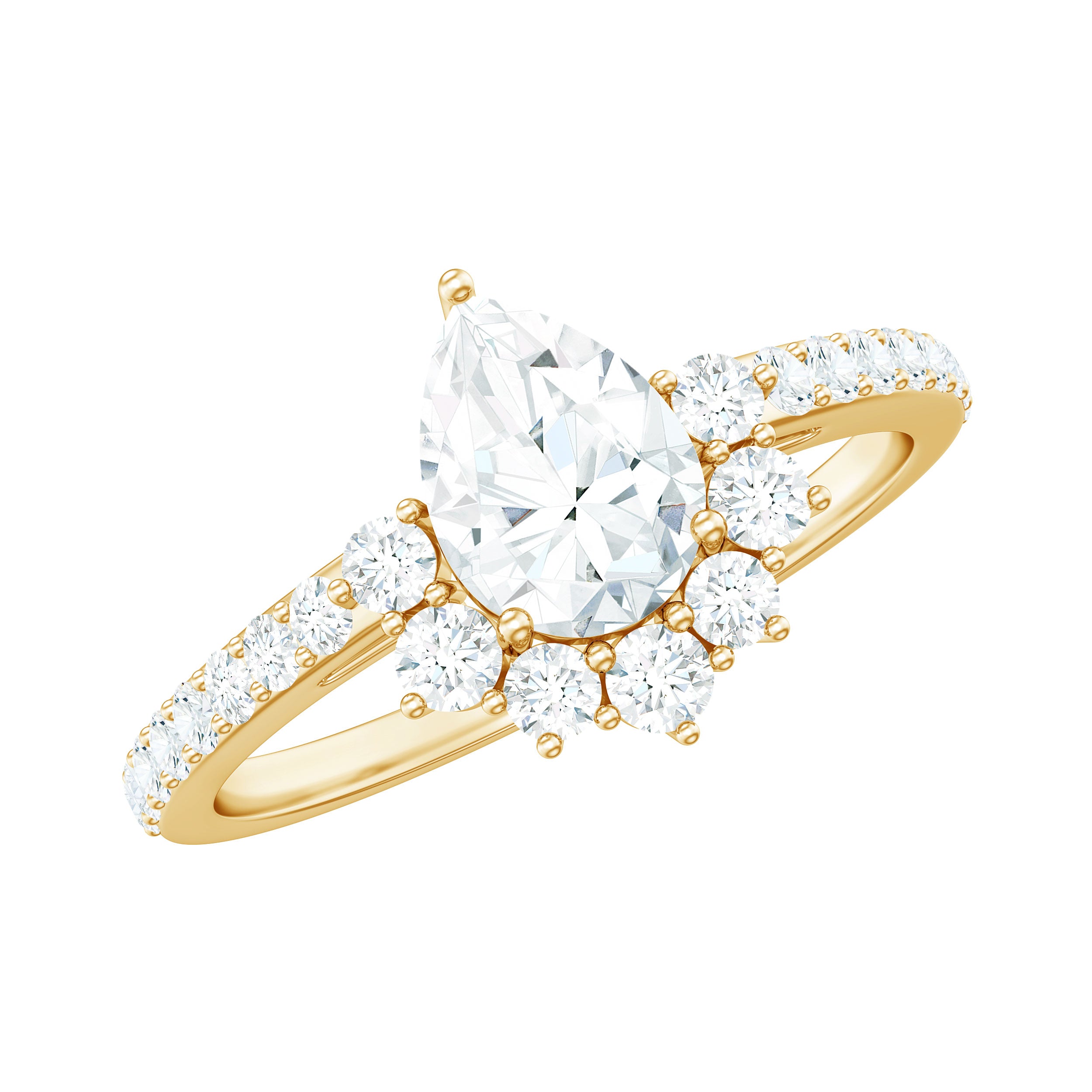 This Designer Engagement Ring is bound to wow anyone who sees it. At its heart, it showcases a 5X7 MM pear shaped moissanite of D-VS1 quality, set in prong setting, and is encircled by additional round cut moissanite stones that form a half halo around the main stone. The sleek band is adorned with delicate round cut moissanite for that added sparkle, and its stylish yet elegant design makes it perfect for everyday wear as well as special occasions. This Moissanite Engagement Ring is more than just jewelry; it radiates beauty and unconditional love. Begin your forever with something that is both stunning and timeless. What sets this Teardrop Engagement Ring apart is its versatility - whether you need an Engagement Ring that truly shines, a Proposal Ring to ask the big question in style, or just a gift for your loved one to commemorate your special moments, this piece is the ideal choice. Plus, it adds a classic charm with a touch of royalty in one breathtaking piece, making it a meaningful and thoughtful addition to your jewelry collection.