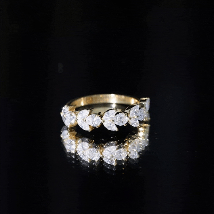 Show your love with this enchanting Moissanite Eternity Ring, guaranteed to make her heart flutter. It is a wonderful addition to her Jewelry Collection, and this Leaf Eternity Ring enhances all her favorite outfits with its unmatched brilliance. Crafted from 14K Yellow Gold Plated Silver, it showcases alternating marquise and pear cut certified Moissanite Stones, meticulously arranged and secured in prong setting to form a leaf-like design. The moissanite boasts D color and VS1 clarity, providing the same dazzling sparkle and durability as natural diamonds, but at a more budget-friendly price. Whether you are celebrating a wedding, an anniversary, or attending a formal event or casual dinner, this Half Eternity Band offers the perfect blend of nature-inspired elegance and timeless charm. This Wedding Eternity Ring allows you to shine gracefully, symbolizing radiant beauty that sparkles even more with every glance. Its intricate craftsmanship comes together to create a Moissanite Wedding Band that will truly resonate with your heart.