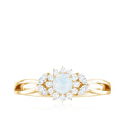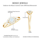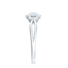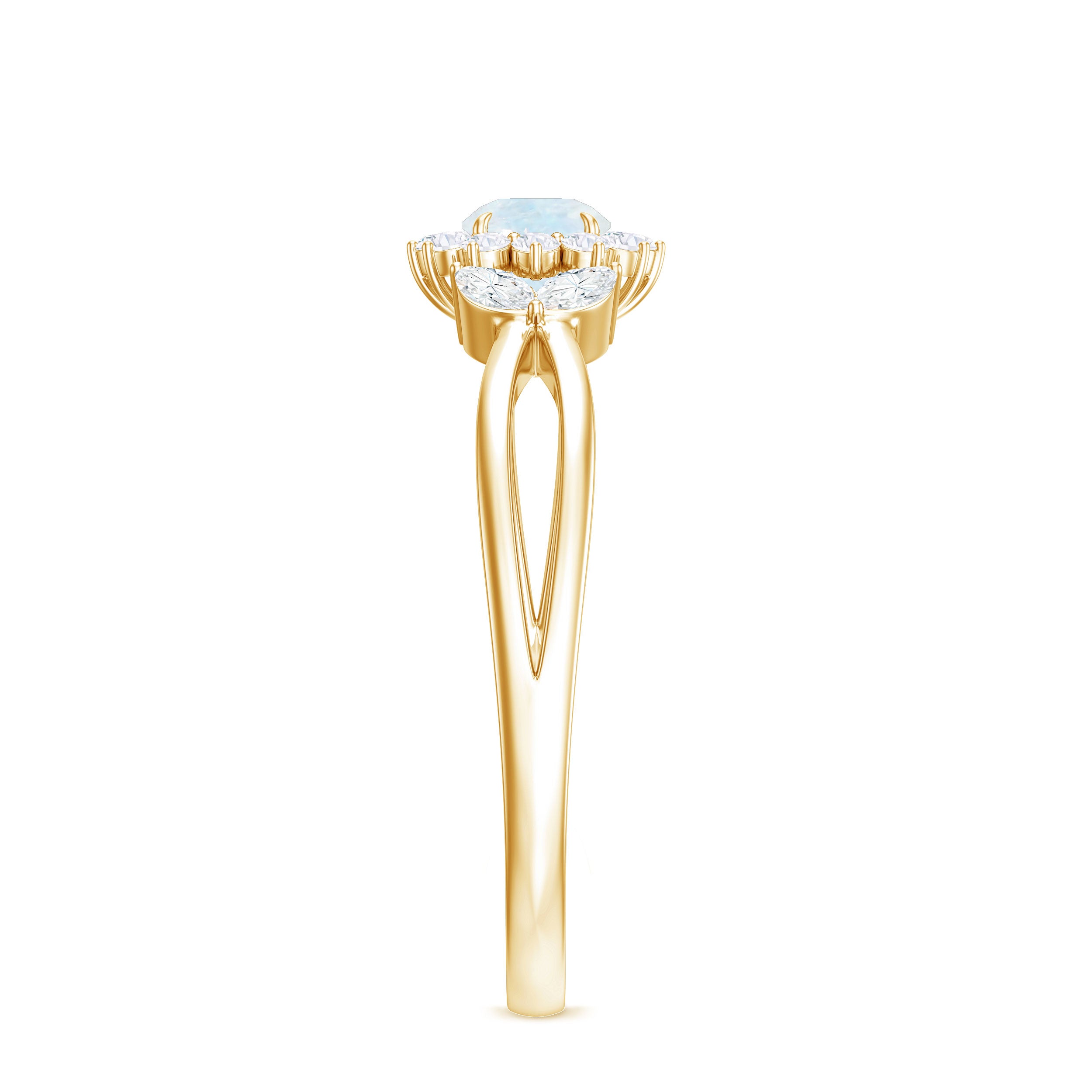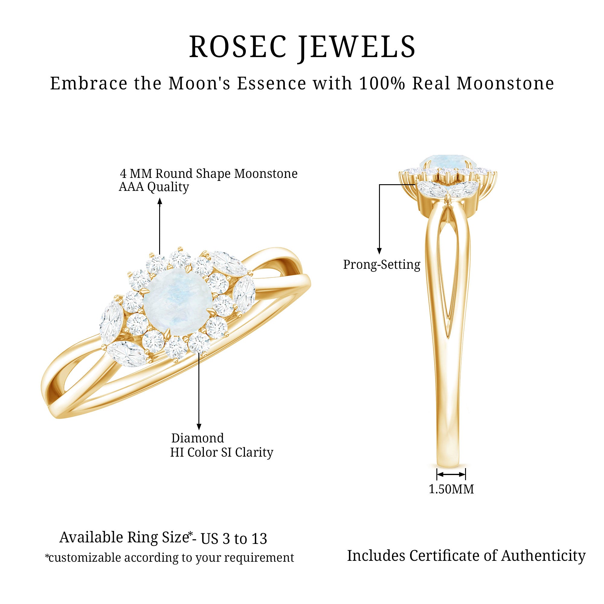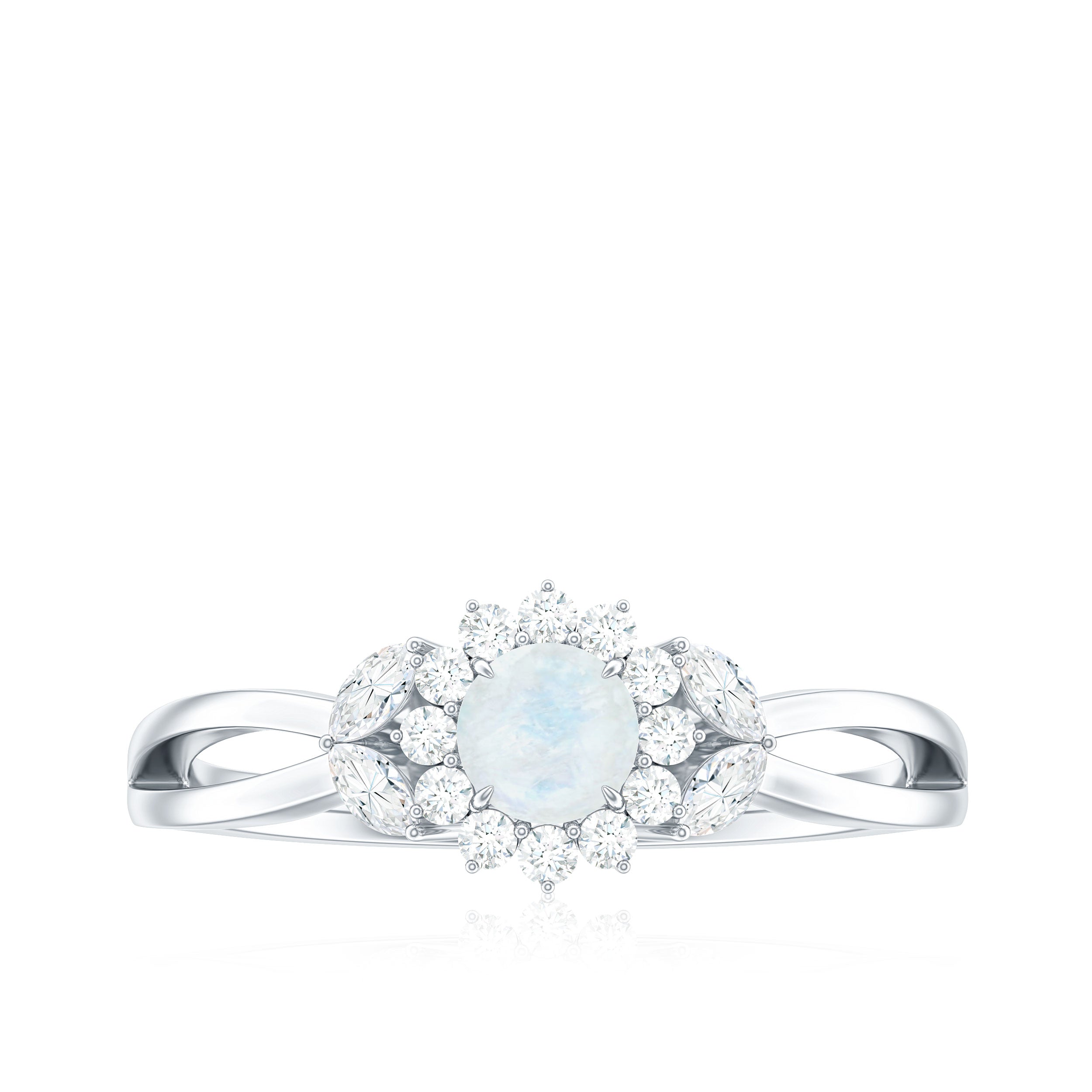 The Floral Ring is featuring a Round Moonstone, held in Claw Setting, and a Halo of Round Diamond along with Marquise Cut Diamond. This Moonstone Engagement Ring is an alluring piece of fine jewelry, it has a split shank to give it a captivating touch.