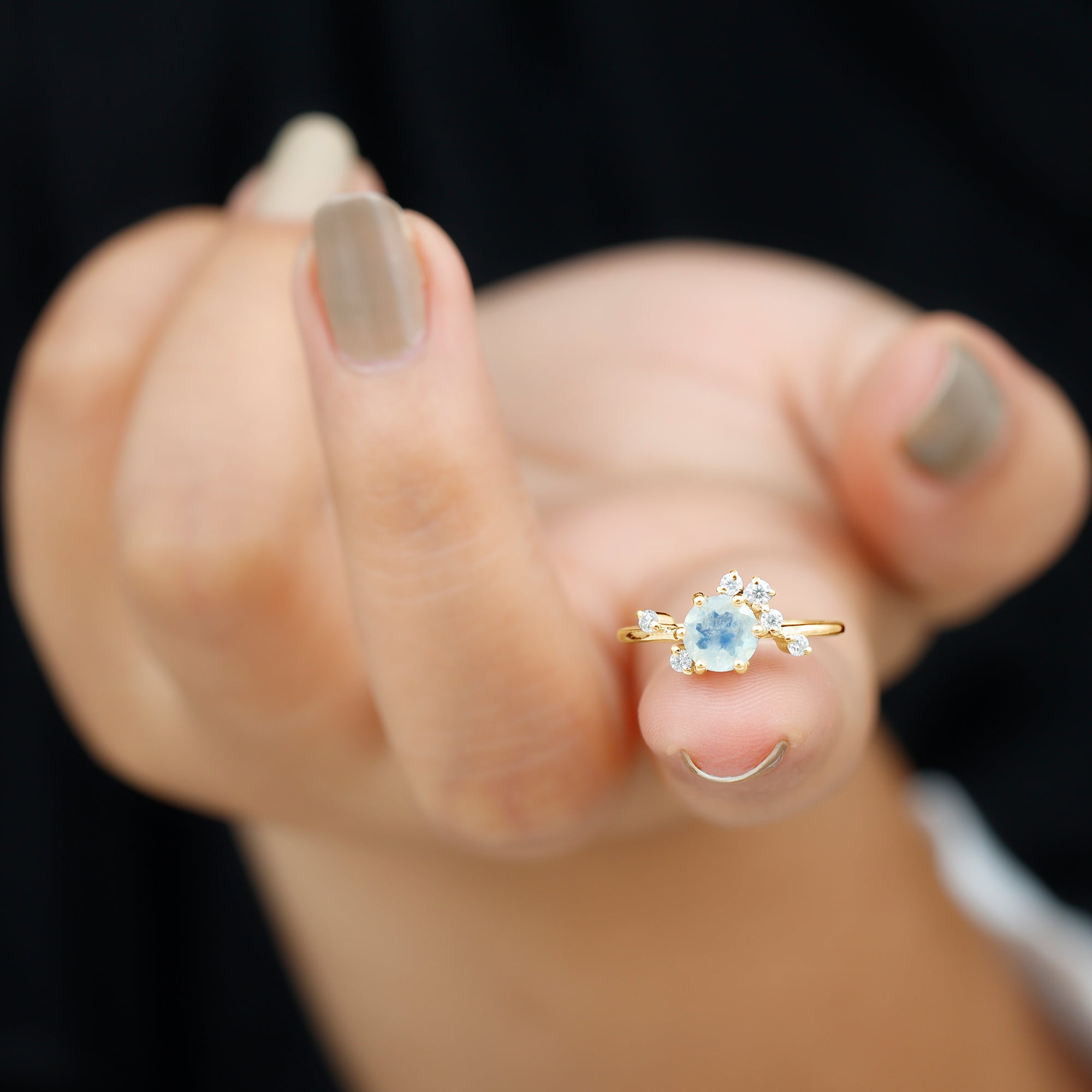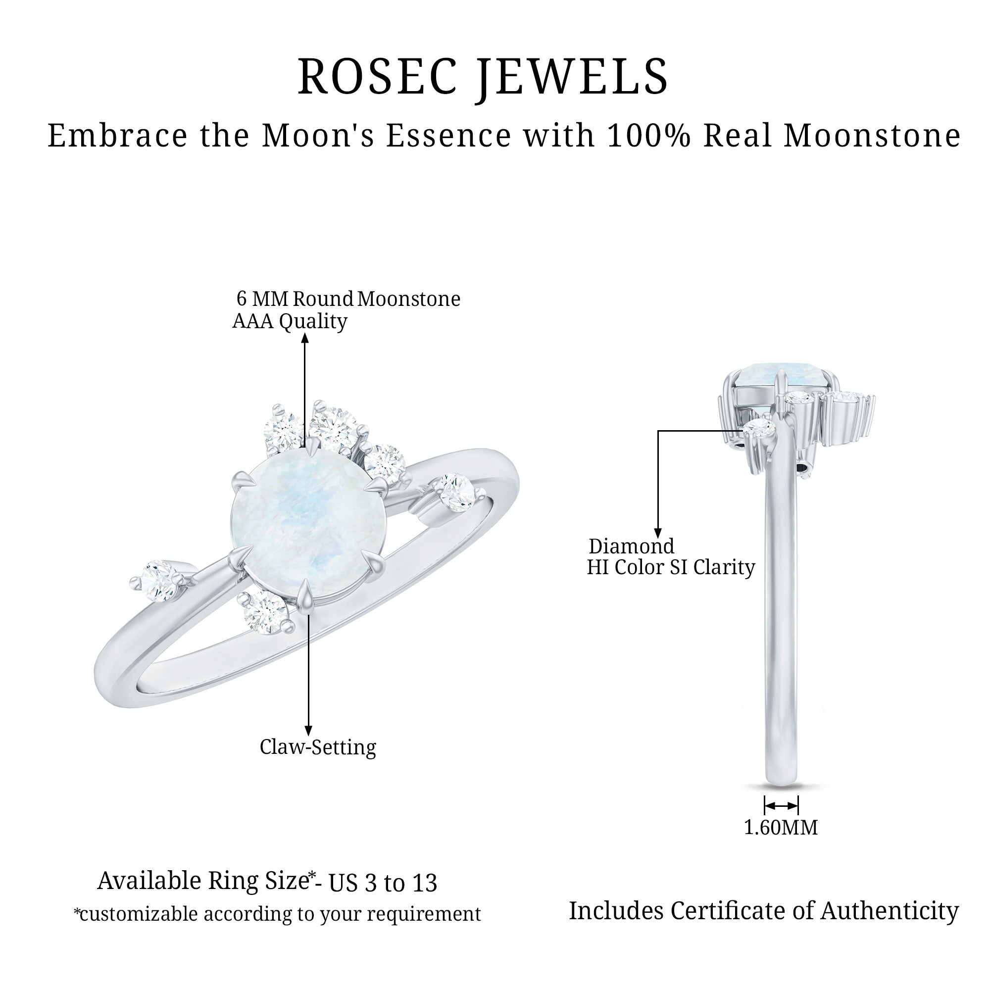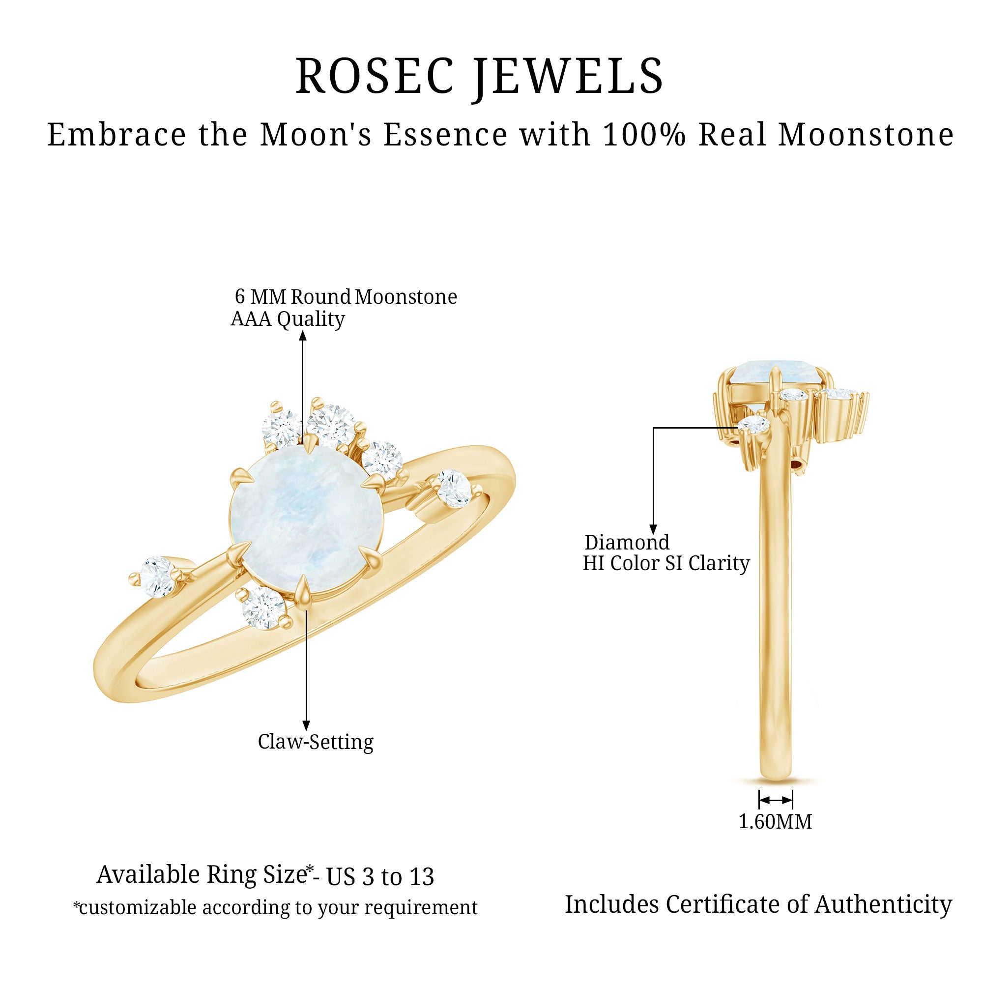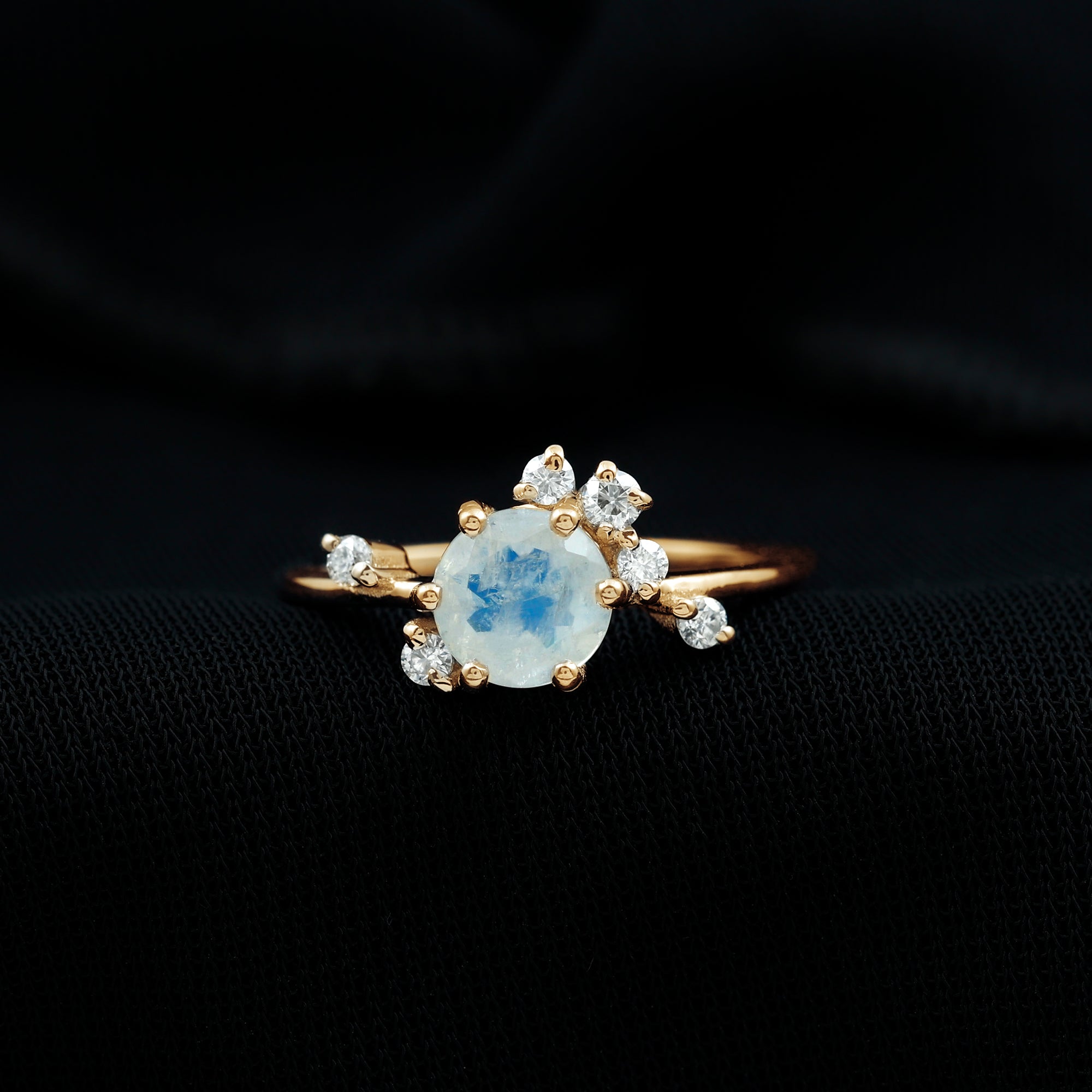 Make a heartfelt gesture with this Scatter Promise Ring featuring a dazzling Round Shape Moonstone in a Claw Setting, accompanied by glistening Diamond gemstones. This luxurious Promise Ring is the perfect surprise for your beloved.