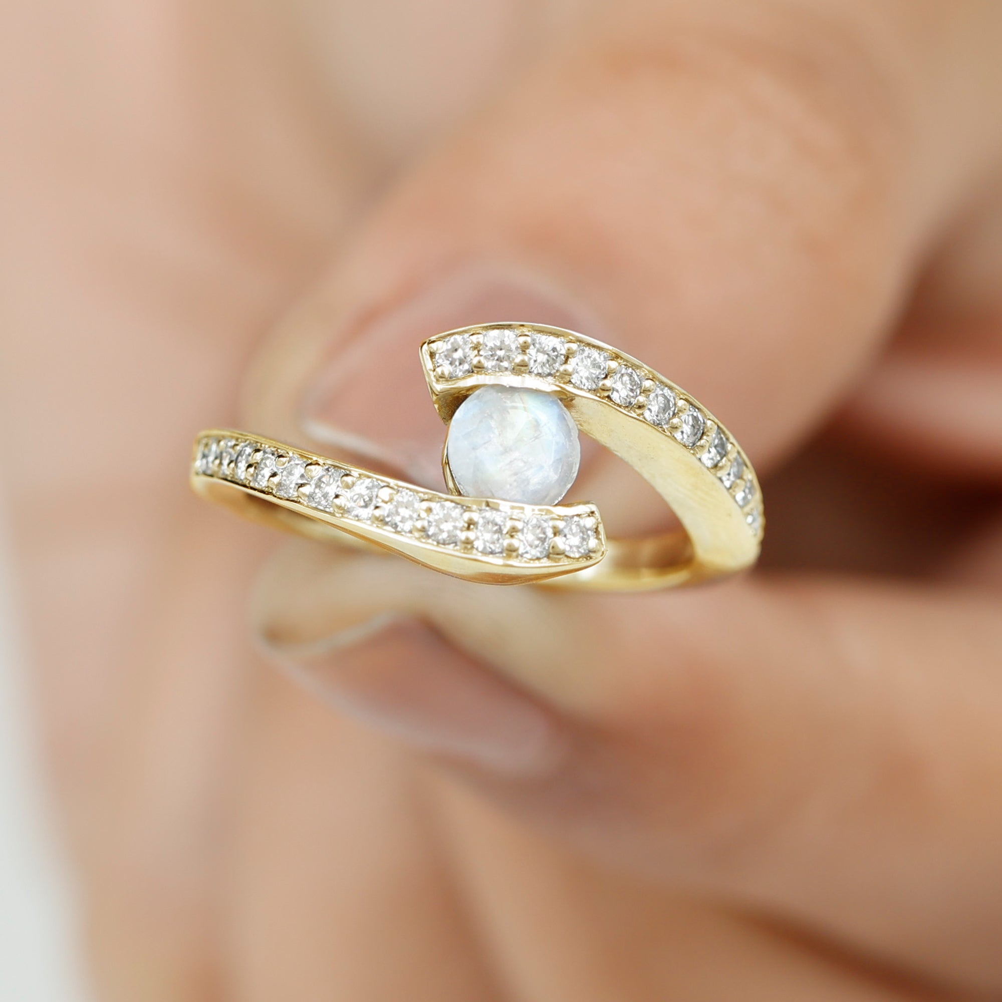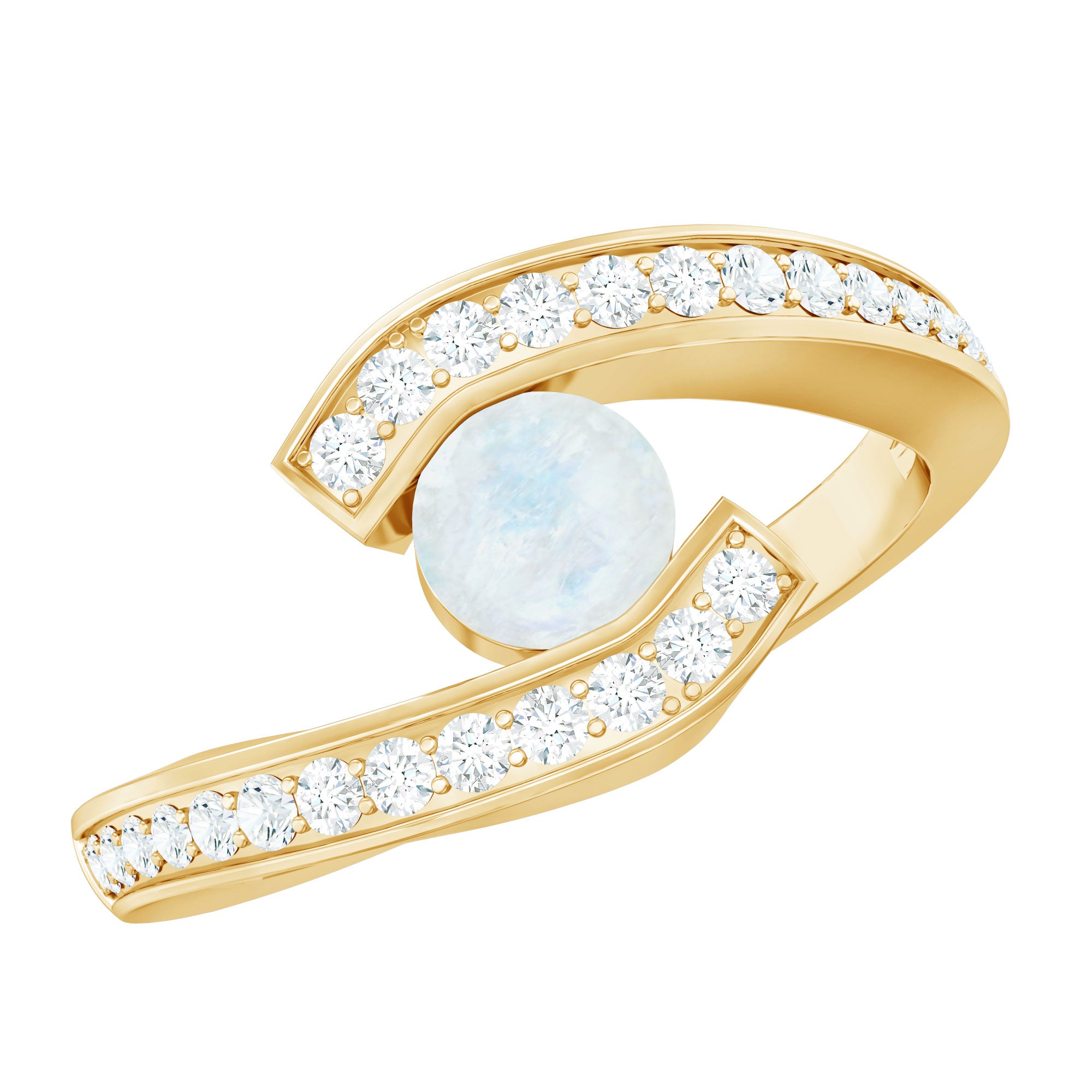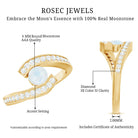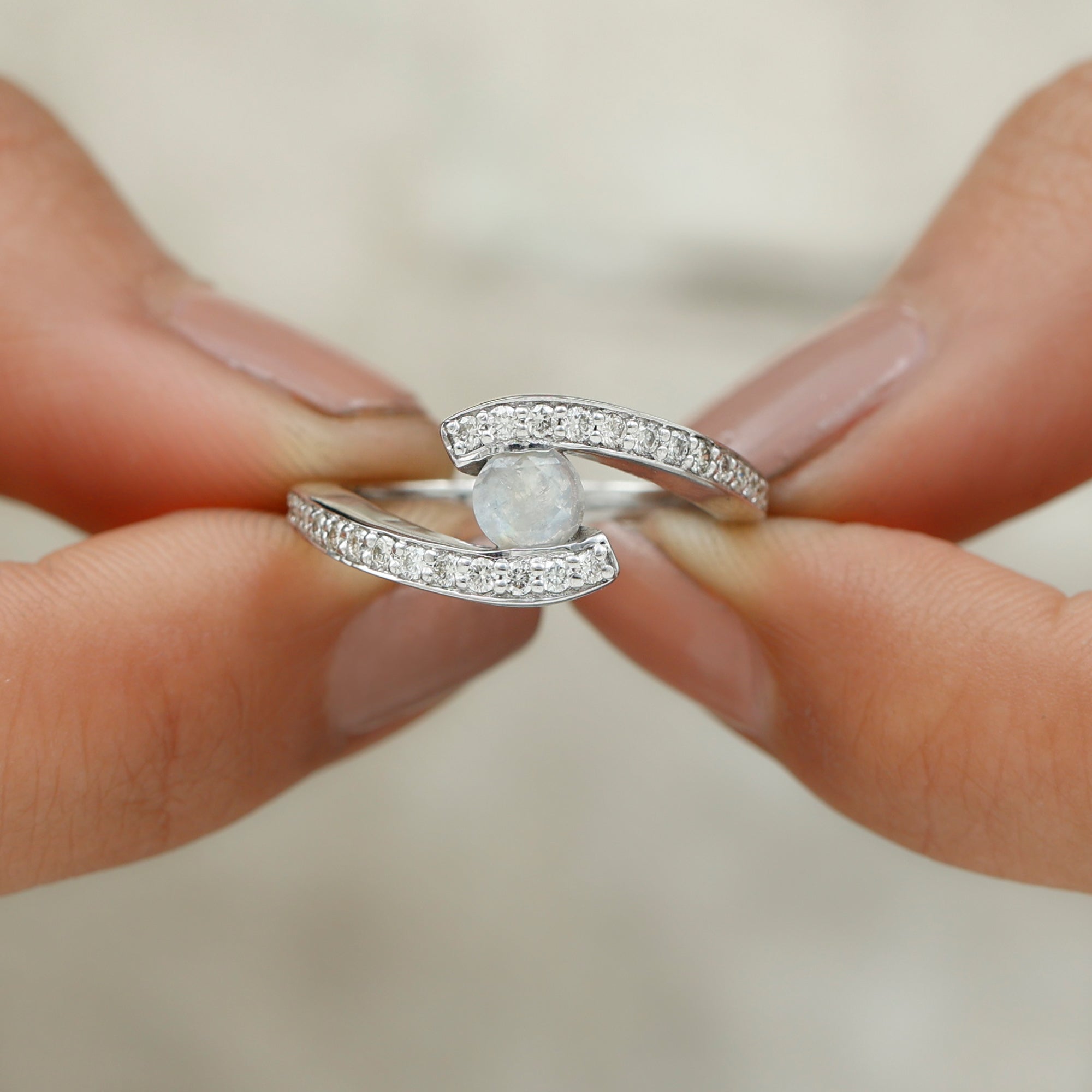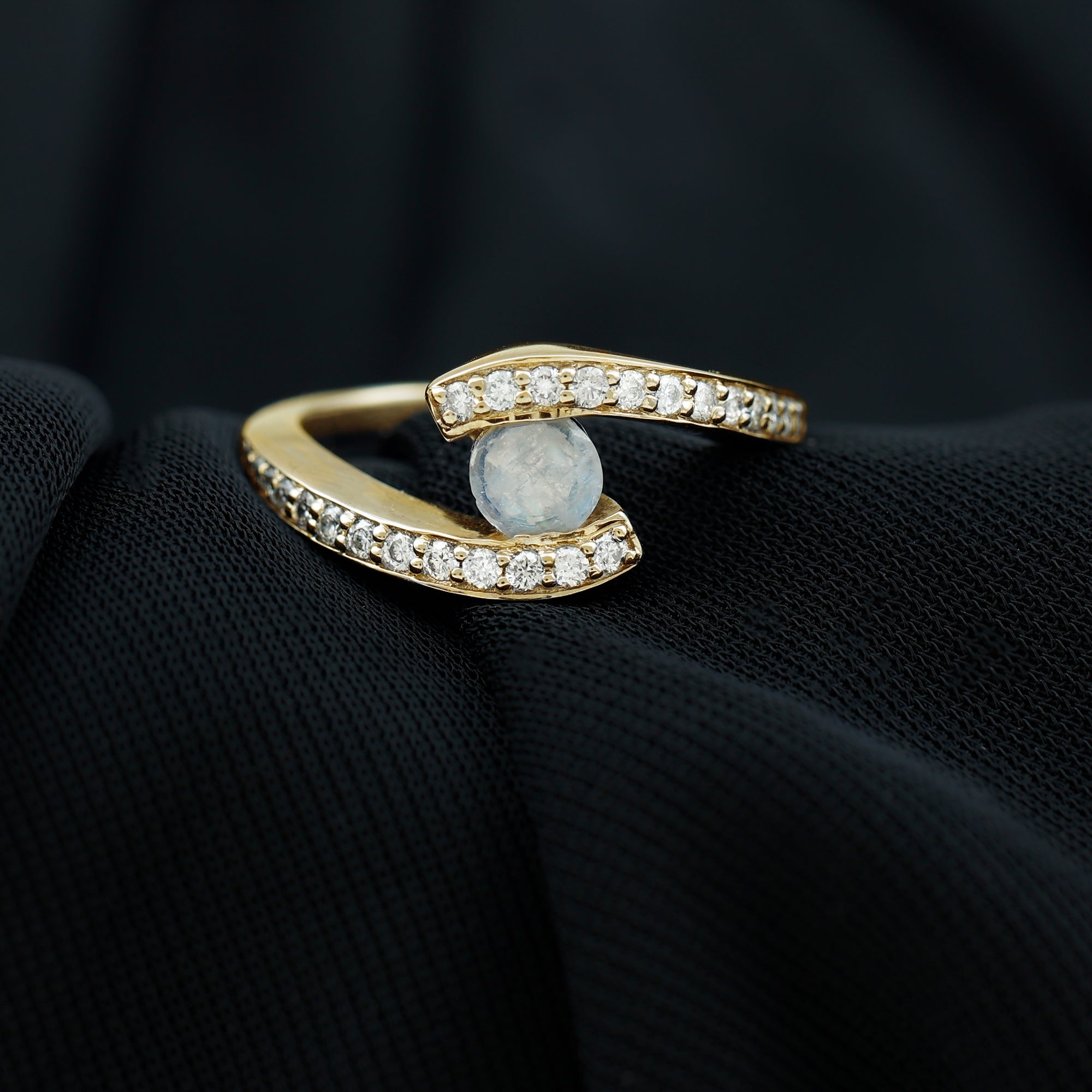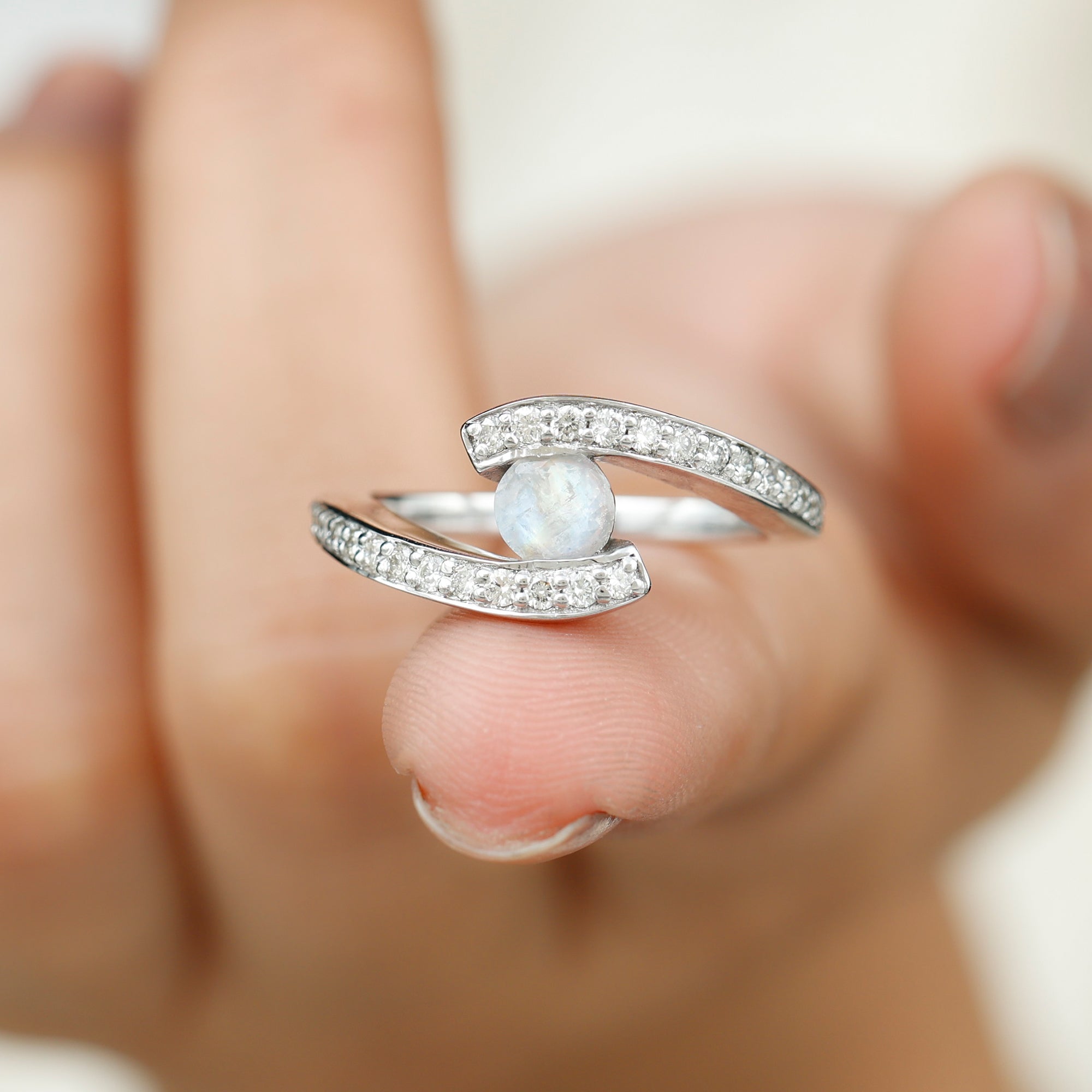 The alluring Bypass Engagement Ring is crafted with Solid Metal and embellished with Round Shape Moonstone and Round Shape Diamonds studded on the shank. Let your partner fall in love with you a little more by gifting her this mesmerizing Moonstone Ring as a Birthday or Anniversary Present.