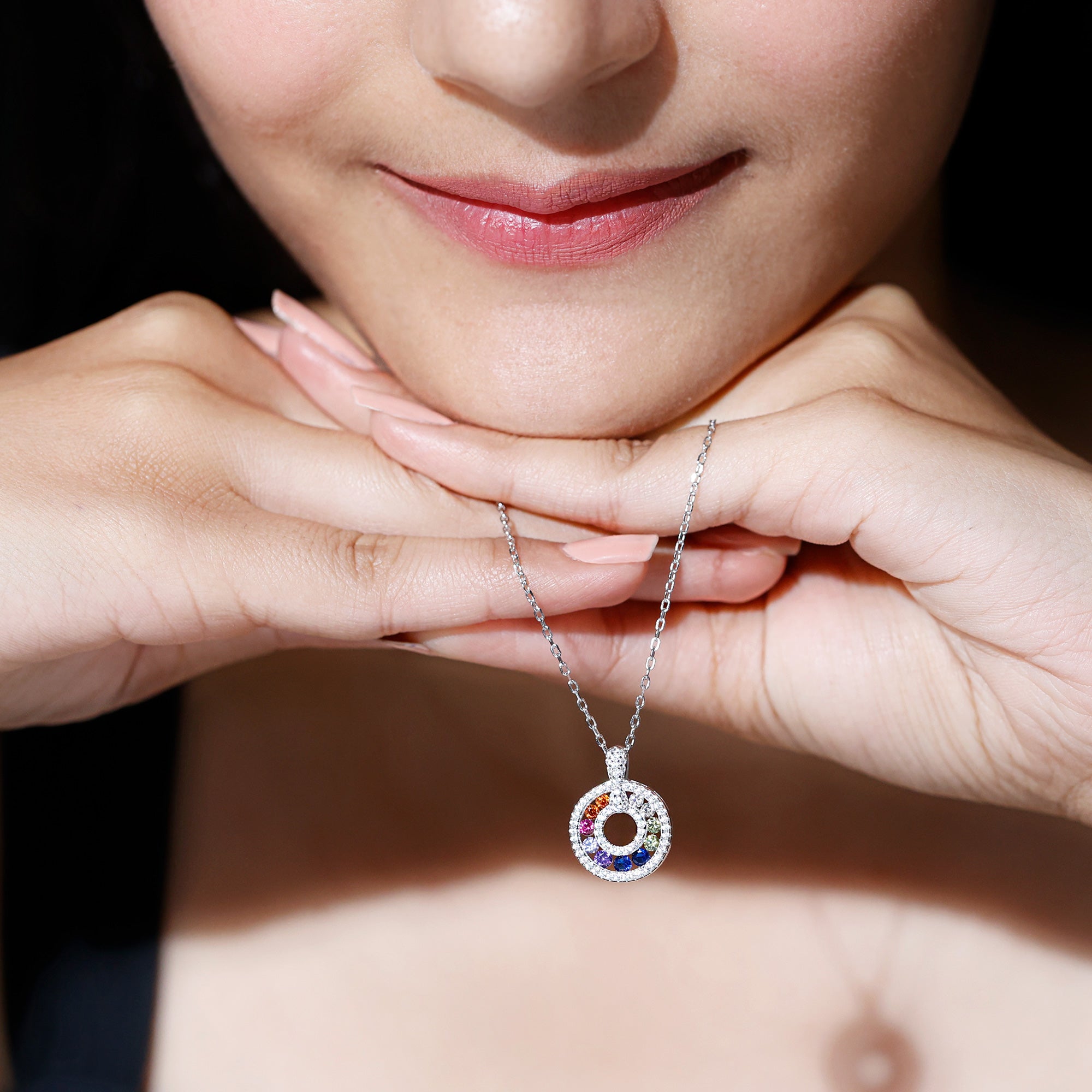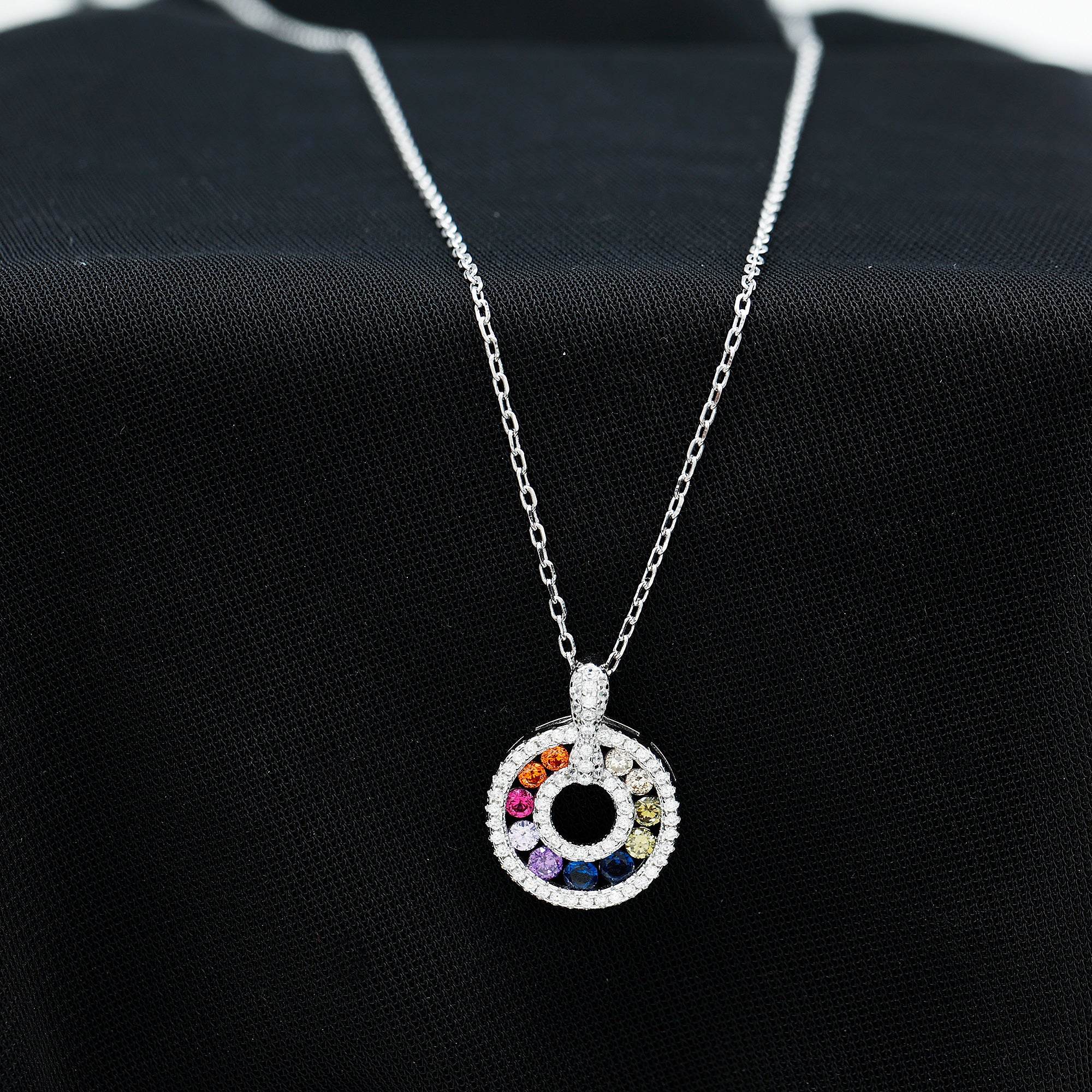 Fill your days with color, joy, and effortless charm with this stunning Eternity Necklace, beautifully crafted in 925 Sterling Silver. Designed to bring vibrant energy to every moment, this Rainbow Necklace features an Open Circle adorned with Amethyst, Lab Blue Sapphire, Lab Ruby, Lab Orange Sapphire, Lab Yellow Sapphire and Zircon stones, each one adding its own unique touch of brightness. The stones are set in a circular frame that catches the light from every angle, creating a look that feels playful yet elegant. Whether you are dressing up for a celebration or adding a pop of color to your everyday style, this Multi Gemstone Necklace blends seamlessly with everything from casual outfits to evening dresses. It is the perfect way to express your love for bold, joyful accessories that make you feel confident and radiant. Arriving in a lovely jewelry box, this Multi Stone Necklace is ready to gift for Christmas, birthdays, anniversaries or any special occasion that calls for something meaningful and memorable. This Multicolor Gem Necklace is a little burst of happiness designed to brighten any outfit and any day.