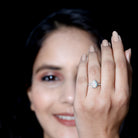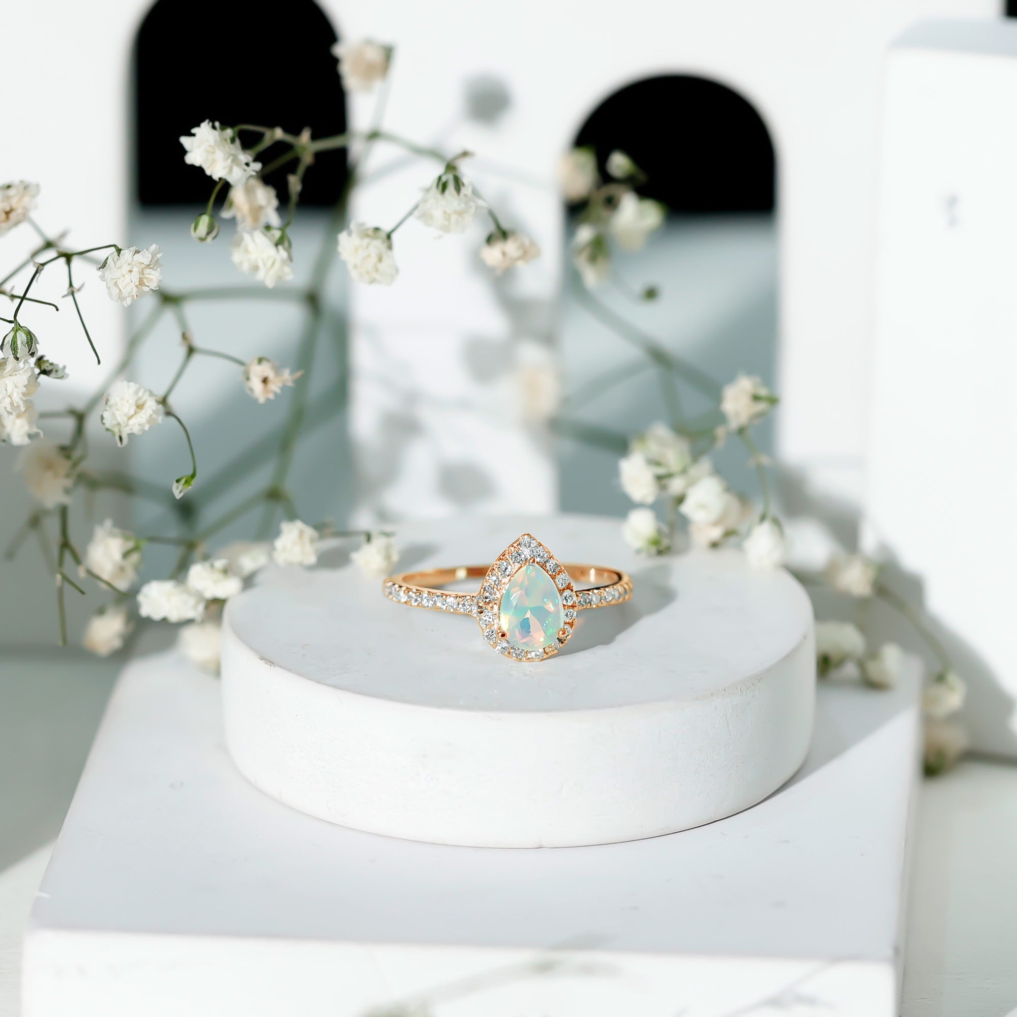 Make a statement of elegance with this stunning Teardrop Engagement Ring. At the center, the 5X7 mm Pear Shape Ethiopian Opal set in 3 Prong Setting glows with an otherworldly play of colors that seem to tell a story of their own. Encircling this captivating gem is a halo of scintillating Diamond stones, each one catching the light to create an irresistible sparkle that amplifies the natural beauty of the Opal. The sleek Band studded with dainty Diamond stones lets the center stone take all the spotlight, perfect for those who appreciate a mix of classic grace and contemporary flair. Whether you are planning a proposal or treating yourself to a meaningful symbol of love, this Opal Diamond Ring is designed to be cherished forever. Delivered in a signature jewelry box and available in various sizes, this Pear Shaped Engagement Ring promises a flawless and dazzling fit. Bold yet delicate, this Opal Halo Ring captures the essence of timeless beauty with a fresh and trendy twist, making it the ultimate expression of romance and style.