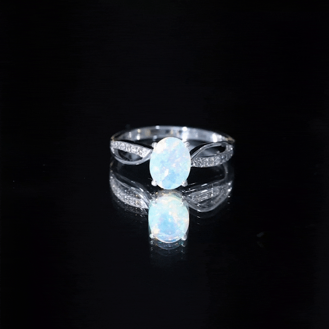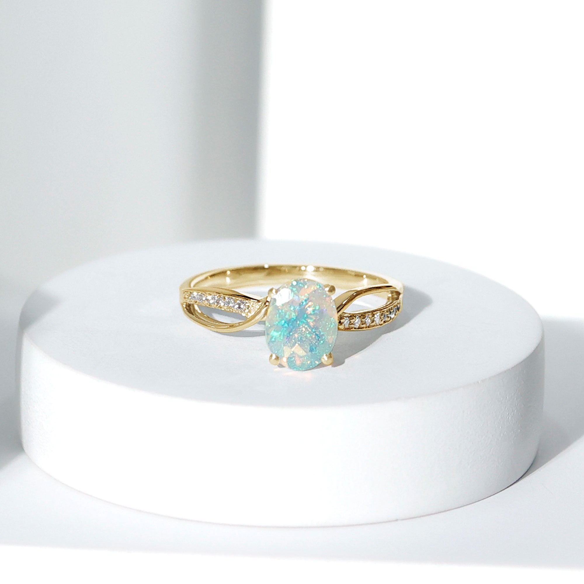 Celebrate your love story with a ring that symbolizes connection, harmony and forever. This Solitaire Engagement Ring is pure magic, its luminous 6X8 mm Oval Ethiopian Opal center stone flashes with fiery hues of pink, green and blue, like bottled stardust on your finger. The Split Shank design symbolizes two souls joining into one journey, which makes this Oval Engagement Ring truly meaningful. The band gently parts and curves toward the center opal, each side adorned with dainty Diamond stones that add the right touch of sparkle and grace. This Opal and Diamond Engagement Ring is elegant with a twist, perfect for someone who values beauty with depth. Whether you are drawn to the ever-changing glow of the Opal or the symbolic meaning behind the design, this Split Shank Engagement Ring is made to turn moments into memories. Presented in a signature jewelry box and available in multiple sizes, this Oval Opal Ring is ready for your yes moment and every day after. This Opal Diamond Ring is for the bride who believes in fate, soul connections and love that glows from within.