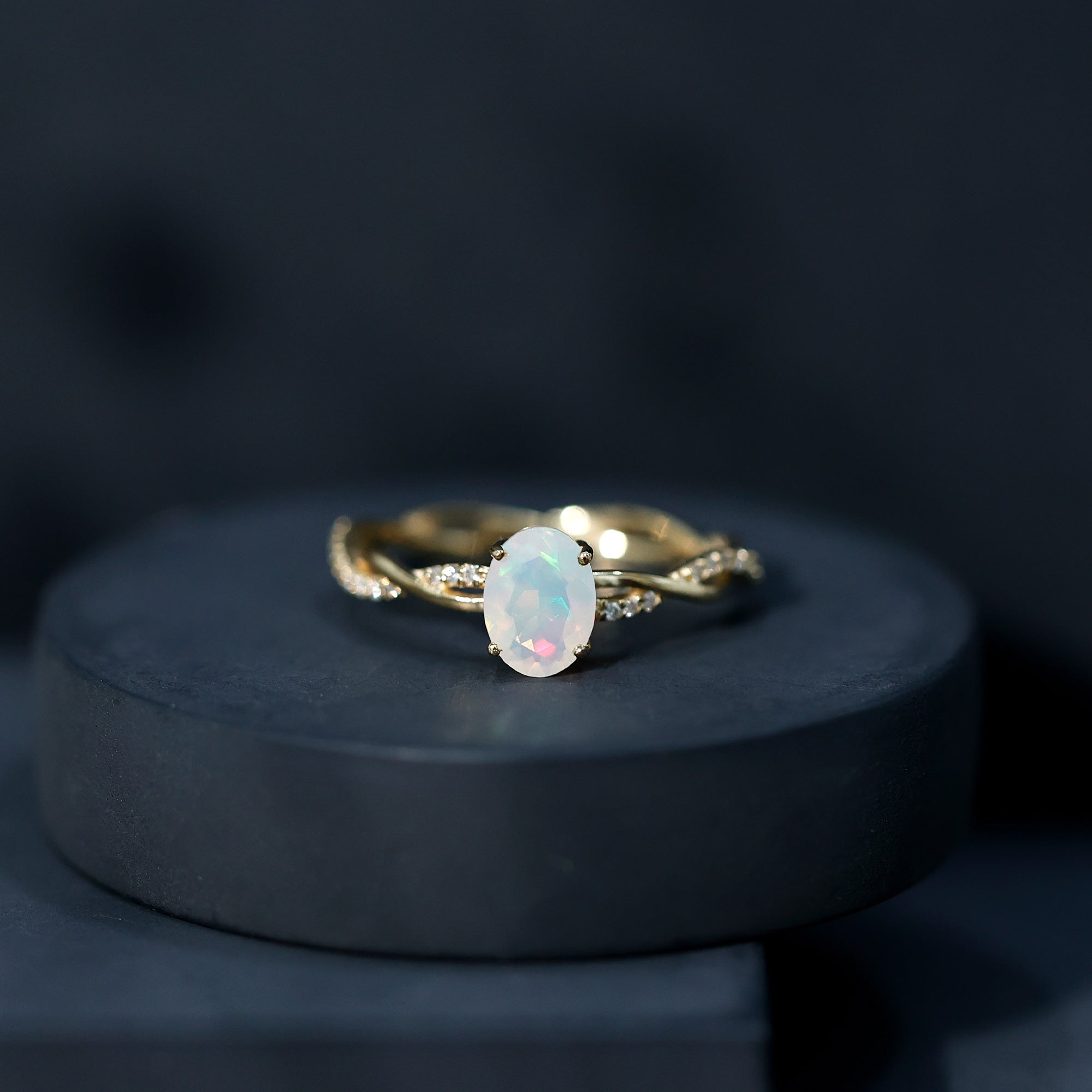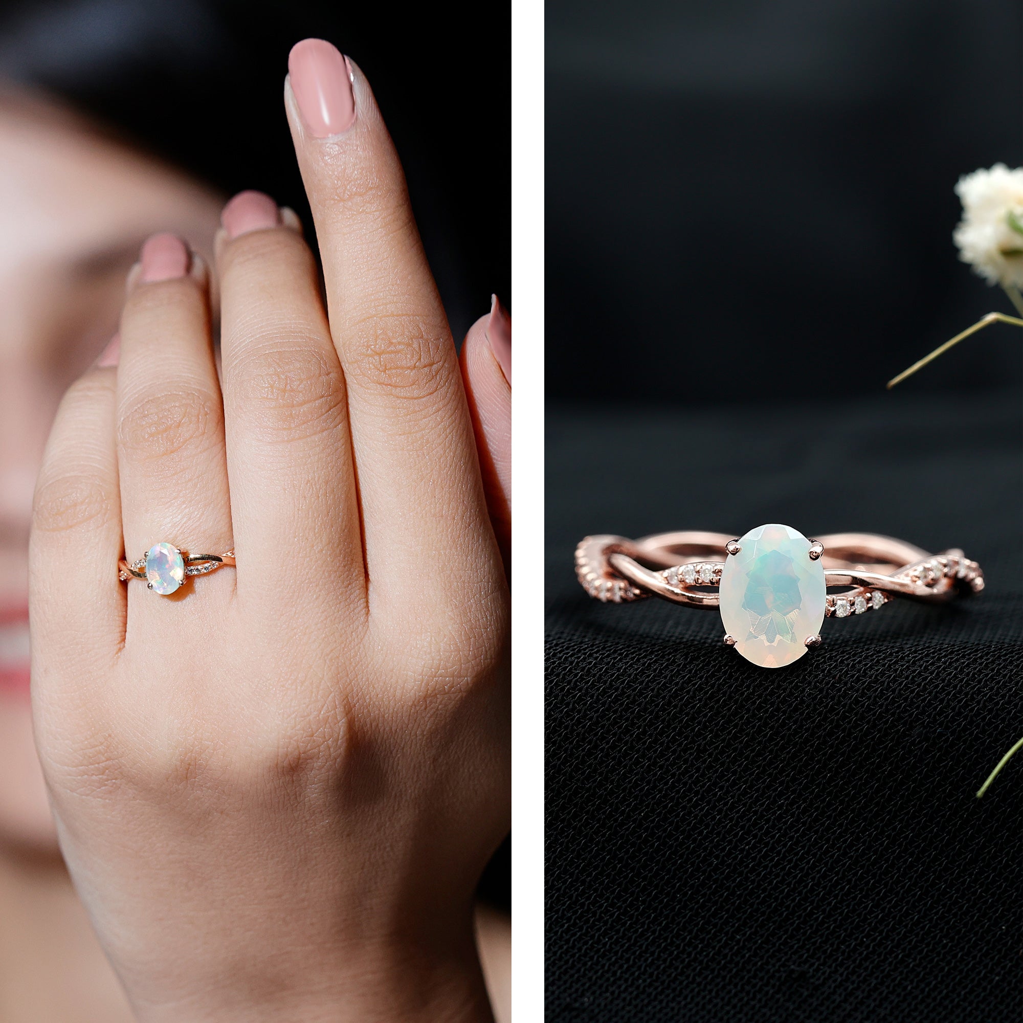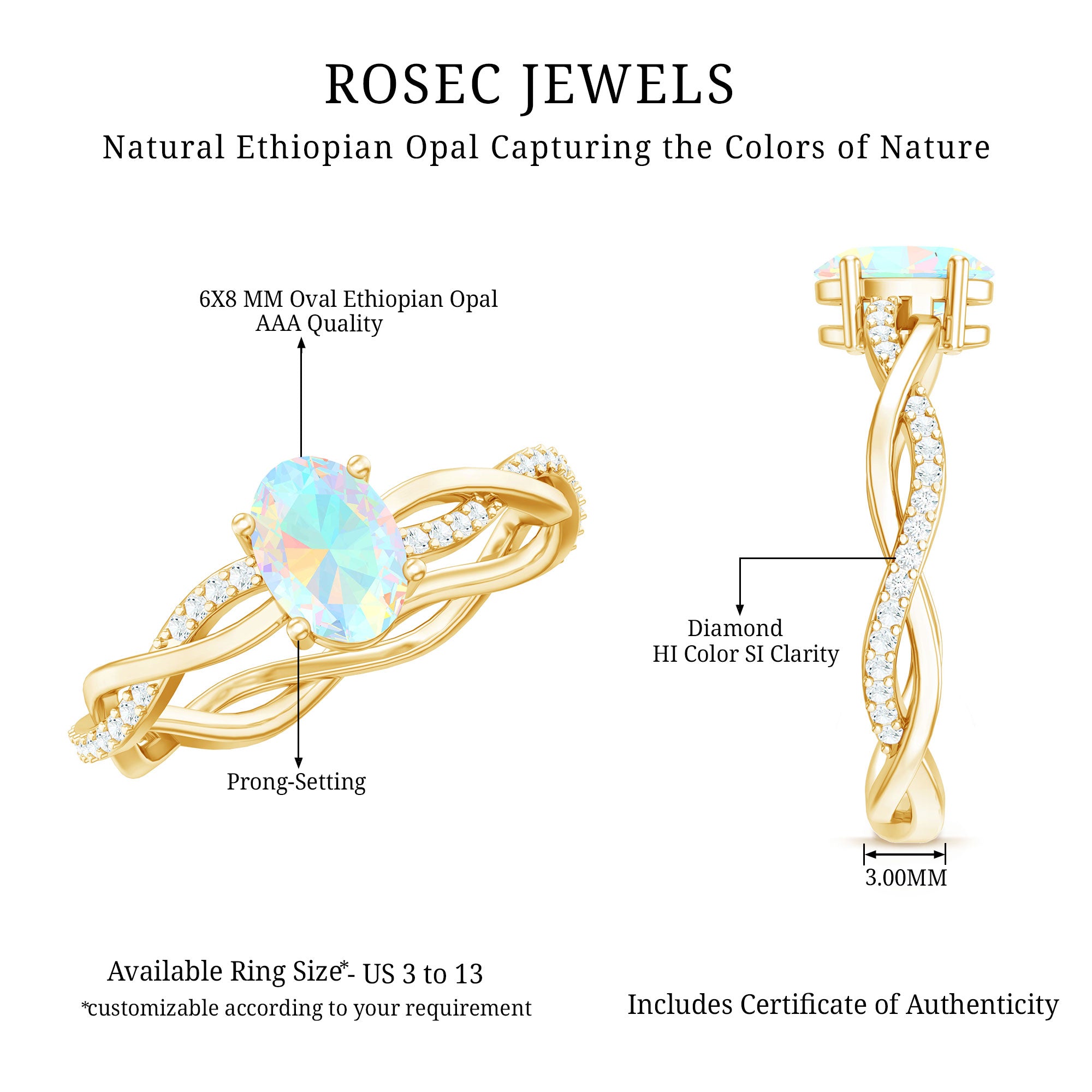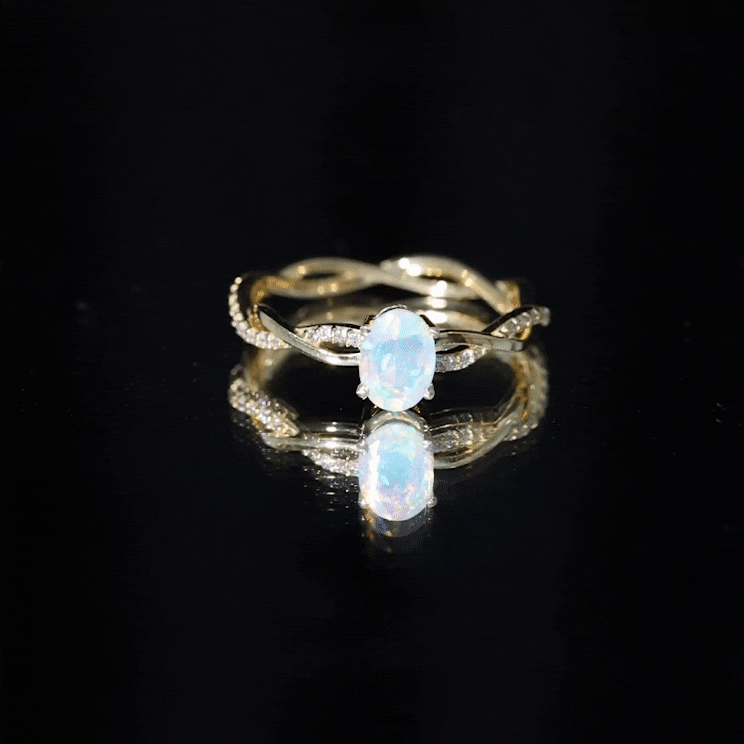 Let your love story shimmer with something truly extraordinary. This Ethiopian Opal Engagement Ring is where timeless romance meets beauty. At the center of this Solitaire Engagement Ring is a luminous 6X8 mm Oval Shape Ethiopian Opal set in Prong Setting, glowing with ethereal flashes of color that shift from soft pastels to fiery brilliance depending on the light, a perfect symbol of a love that is always evolving, yet forever constant. Framing this dreamy gem is a Diamond studded Braided Band, intertwining like two lives woven together in harmony. The braided detail adds a romantic, handcrafted feel while the dazzling Diamond stones bring just the right touch of sparkle to elevate every moment. Whether you are proposing or celebrating a forever bond, this Oval Engagement Ring makes a statement that is both elegant and personal. Thoughtfully packaged in a beautiful jewelry box and available in multiple ring sizes, this Opal Diamond Engagement Ring is ready to become an unforgettable part of your journey. Ideal for anyone drawn to the mystical charm of opal, this Braided Engagement Ring is a promise and a lifetime of love wrapped into one unforgettable design.