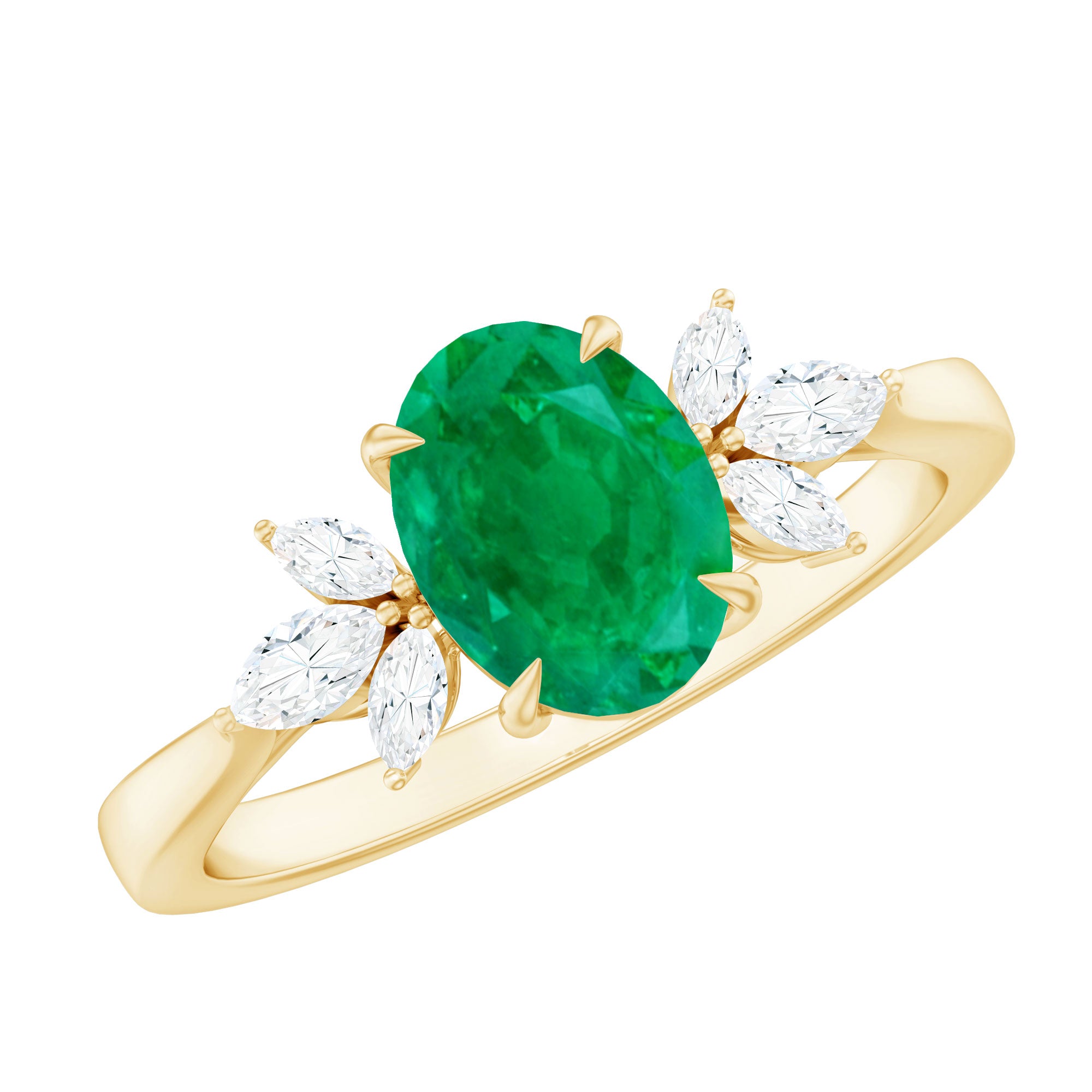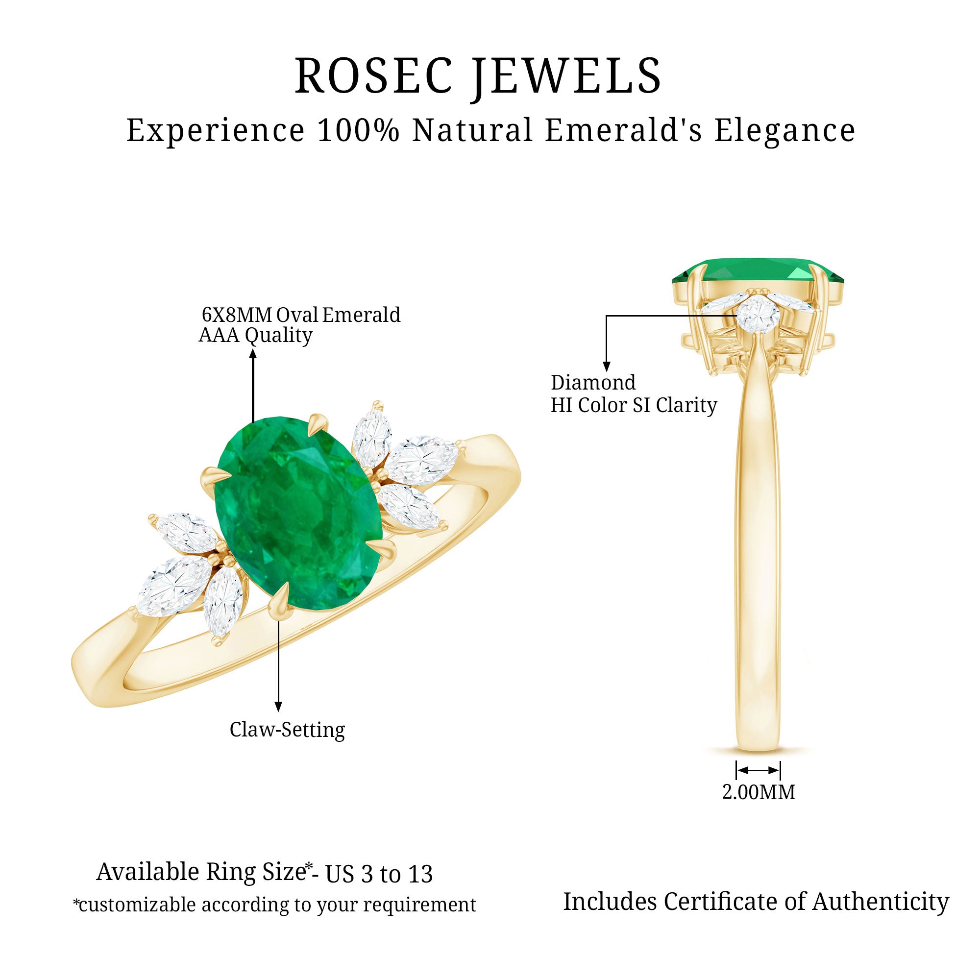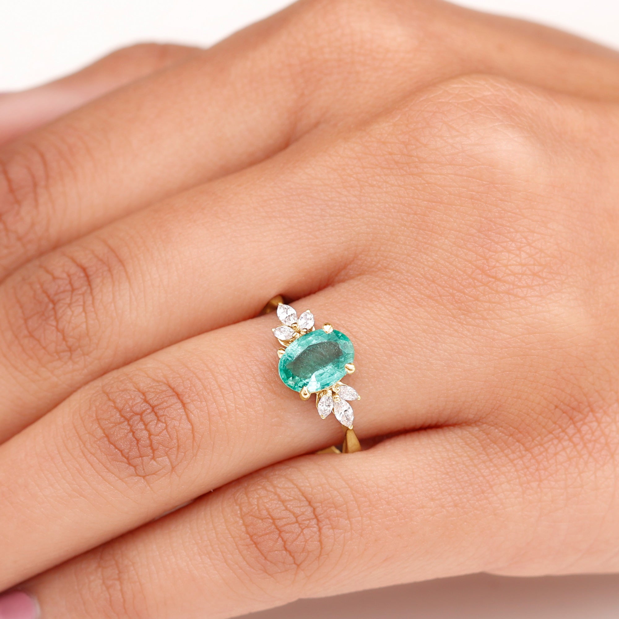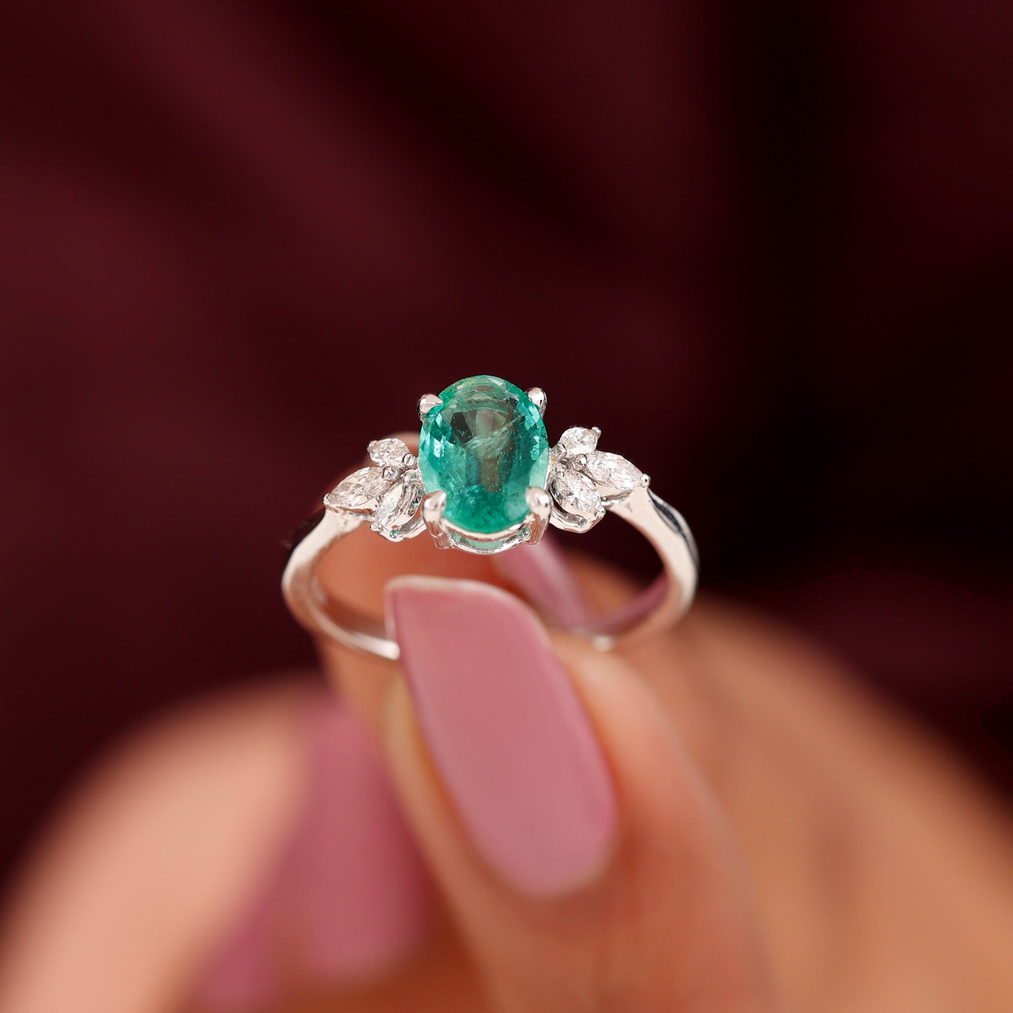 Turn a simple promise into a lasting memory with the radiant glow of this Emerald and Diamond Engagement Ring. It is curated with a breathtaking 6X8 MM oval cut emerald, held securely in claw setting that allows the gemstone’s rich green color to glow with natural brilliance. The AAA quality real emerald represents love, harmony, and new beginnings, making it a meaningful choice for such a special moment. On each side of the center stone, a trio of marquise cut diamonds (HI-SI quality) forms a graceful leaf-inspired pattern, adding a delicate touch of sparkle and elegance. Every detail is carefully designed to highlight the emerald’s deep color while enhancing its brilliance with the soft shimmer of diamonds. This Emerald Engagement Ring is more than a symbol of love, it is a reflection of your shared journey and the promise of a bright future ahead. Whether worn every day or kept for meaningful occasions, it will always remind her of the moment your hearts united. Elegant, thoughtful, and full of emotion, this Oval Shaped Engagement Ring captures the true essence of everlasting love and makes an unforgettable statement of devotion.