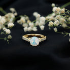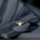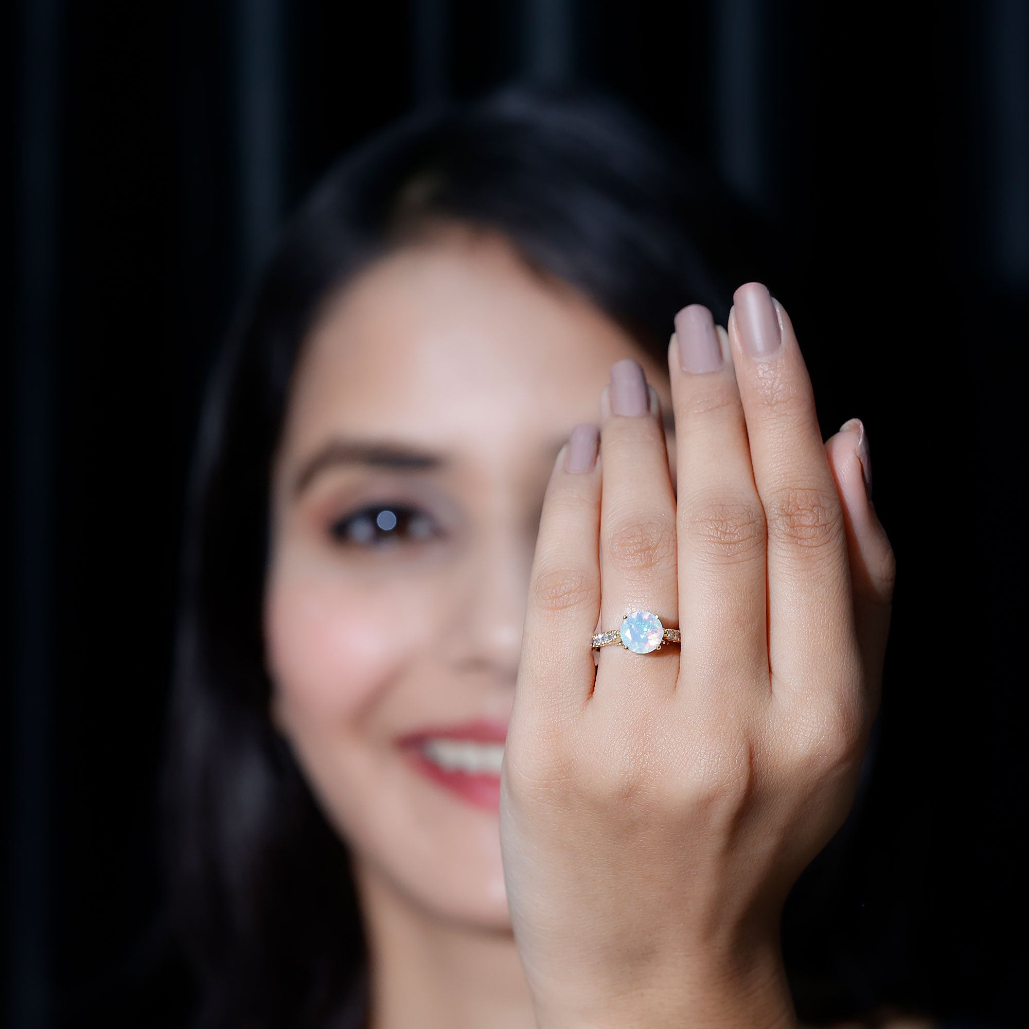 Undeniably breathtaking, this Ethiopian Opal Engagement Ring is a perfect choice for the modern bride-to-be. At the center of this Solitaire Engagement Ring lies a mesmerizing 8 mm Ethiopian Opal set in Prong Setting, flanked by Diamond Side Stones, known for its ever-changing play of color, capturing light like a prism. The Side Stones create a sparkling pathway that leads the eye straight to the center gem. Delicate Diamond Stones dazzle along the bridge of the band and can be seen when looked at from different angles. Each Diamond is thoughtfully placed to enhance the glow of the Opal, adding just the right touch of brilliance without overpowering its natural charm. Crafted for those who crave elegance with a twist, this Opal and Diamond Engagement Ring is a perfect balance of timeless and trendy. Whether you are planning a dreamy proposal or simply indulging in something extraordinary, this Opalescent Ring is designed to make hearts skip a beat. Available in various ring sizes and presented in a signature jewelry box, this Opal Solitaire Ring is ready for that once-in-a-lifetime moment.