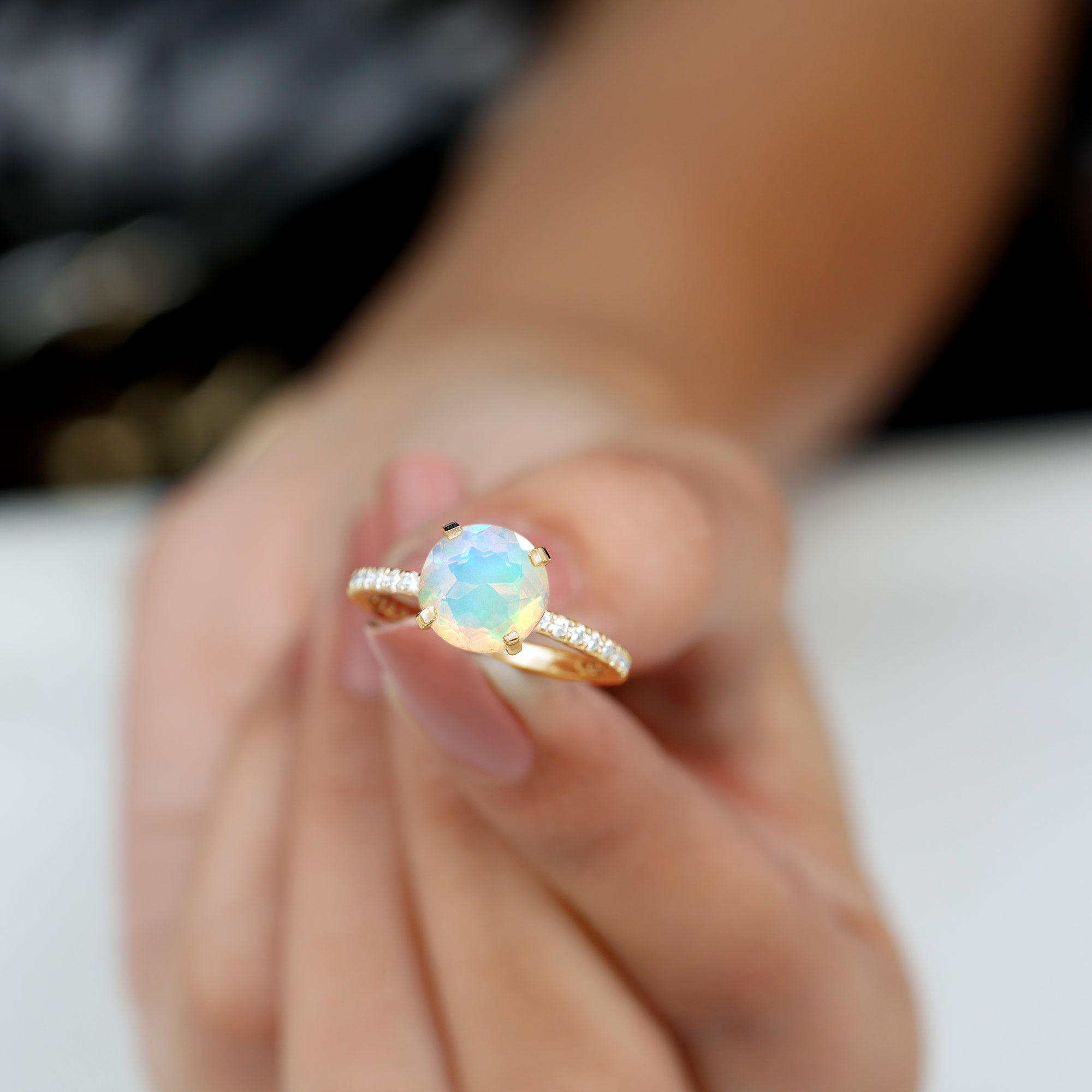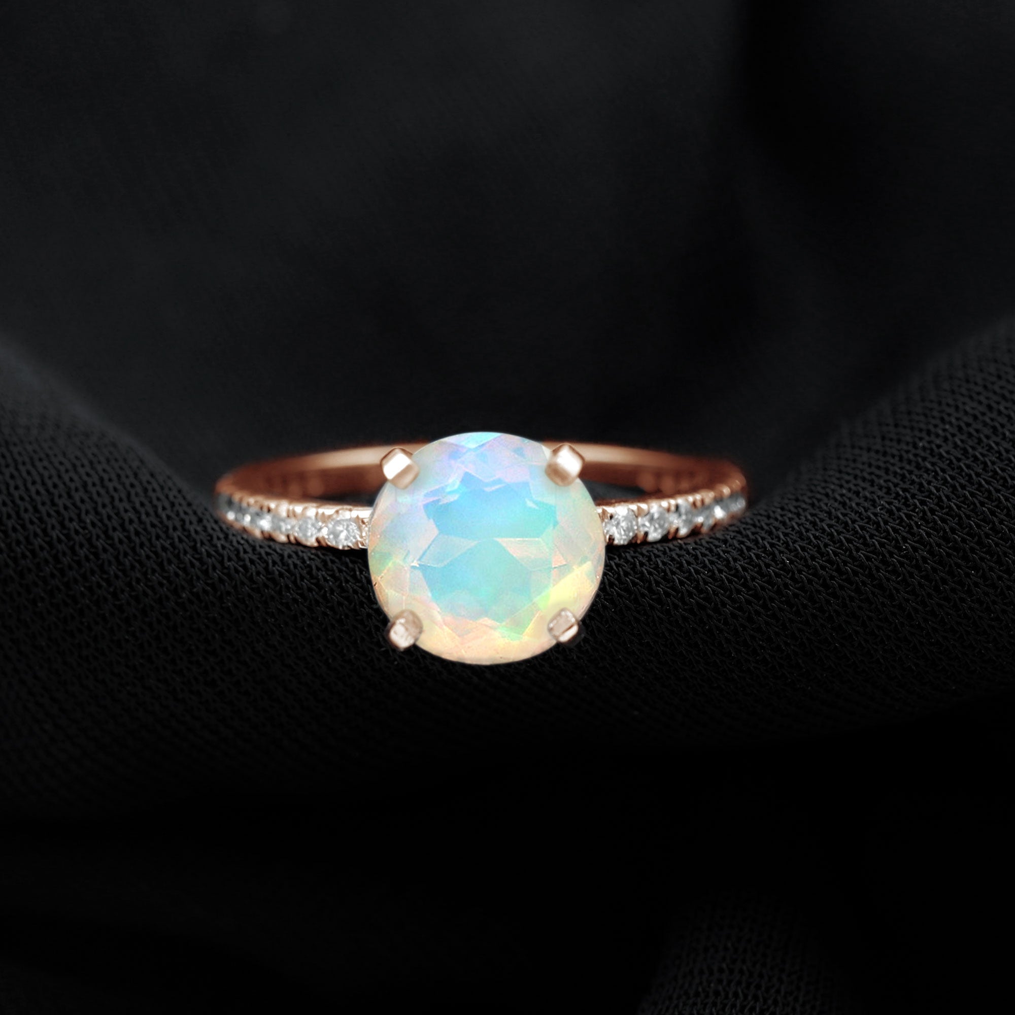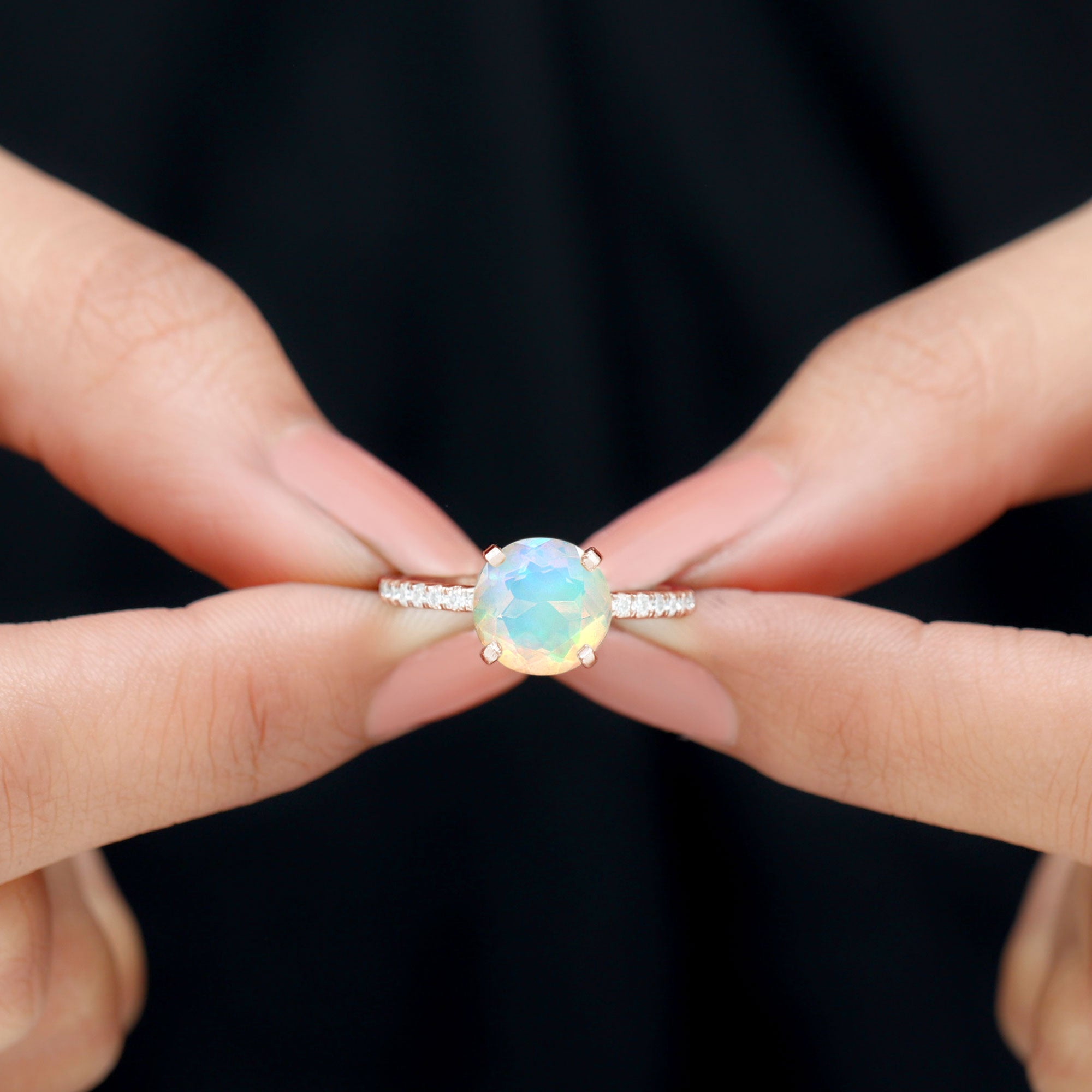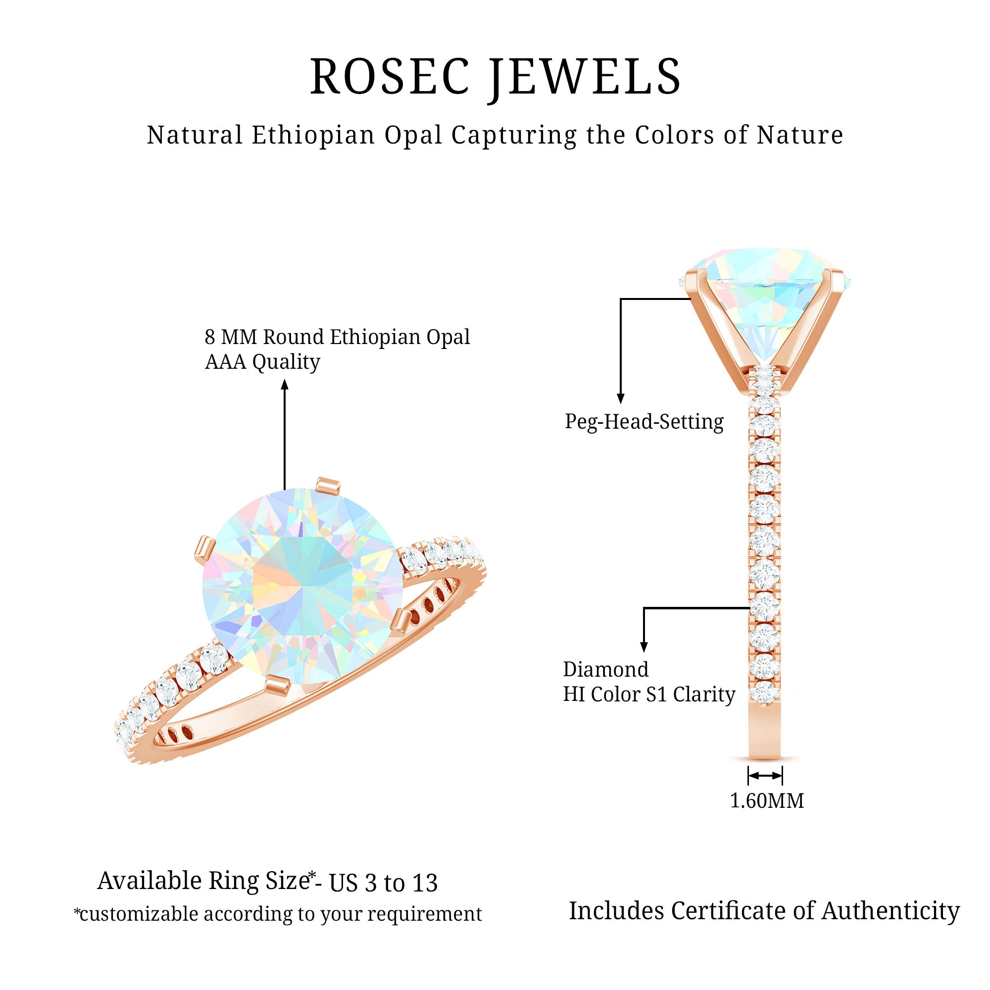 Make your proposal unforgettable with this dazzling Ethiopian Opal Engagement Ring, a rare gem for a rare love. This captivating Solitaire Engagement Ring features a stunning 8 mm Round Shape Ethiopian Opal set in 4 Prong Peg Head Setting, flashing with rainbow hues. Flanked by sparkling Diamond Side stones, each facet catches the light and the breath of anyone who sees it. Whether you are drawn to its cosmic glow or the symbolism of everlasting passion, this Opal and Diamond Engagement Ring tells your love story without saying a word. Delivered in a signature jewelry box, this Real Opal Ring is ready to be the centerpiece of your most important question. Ethereal, enchanting and undeniably unique, this Opal Diamond Ring is a statement, a promise and a forever piece.