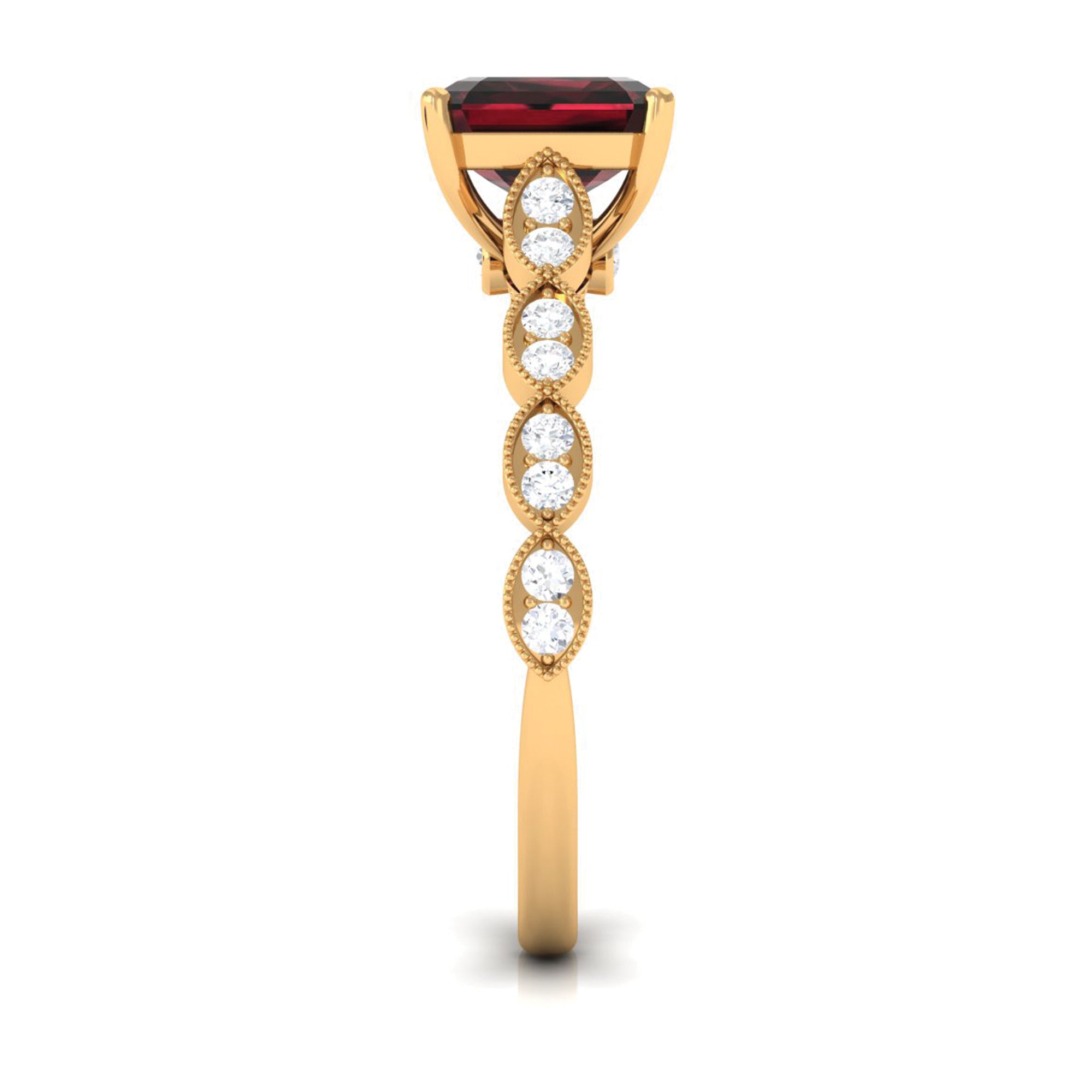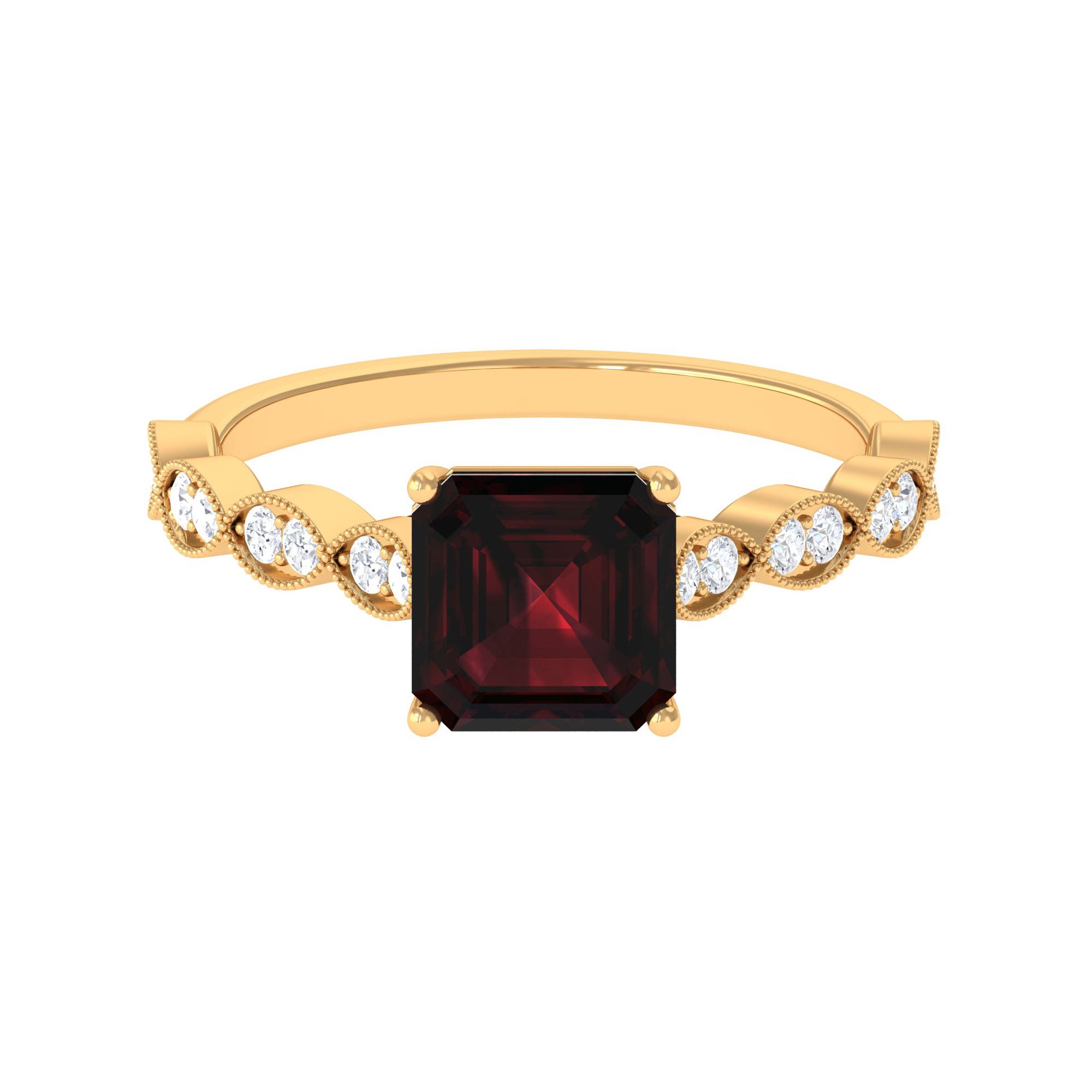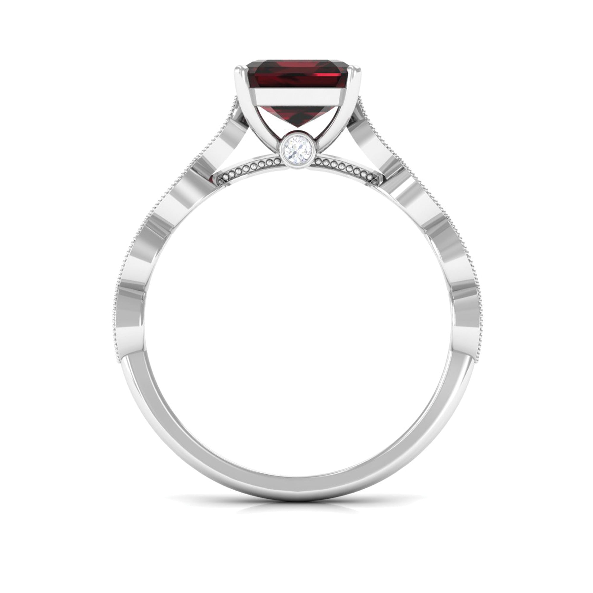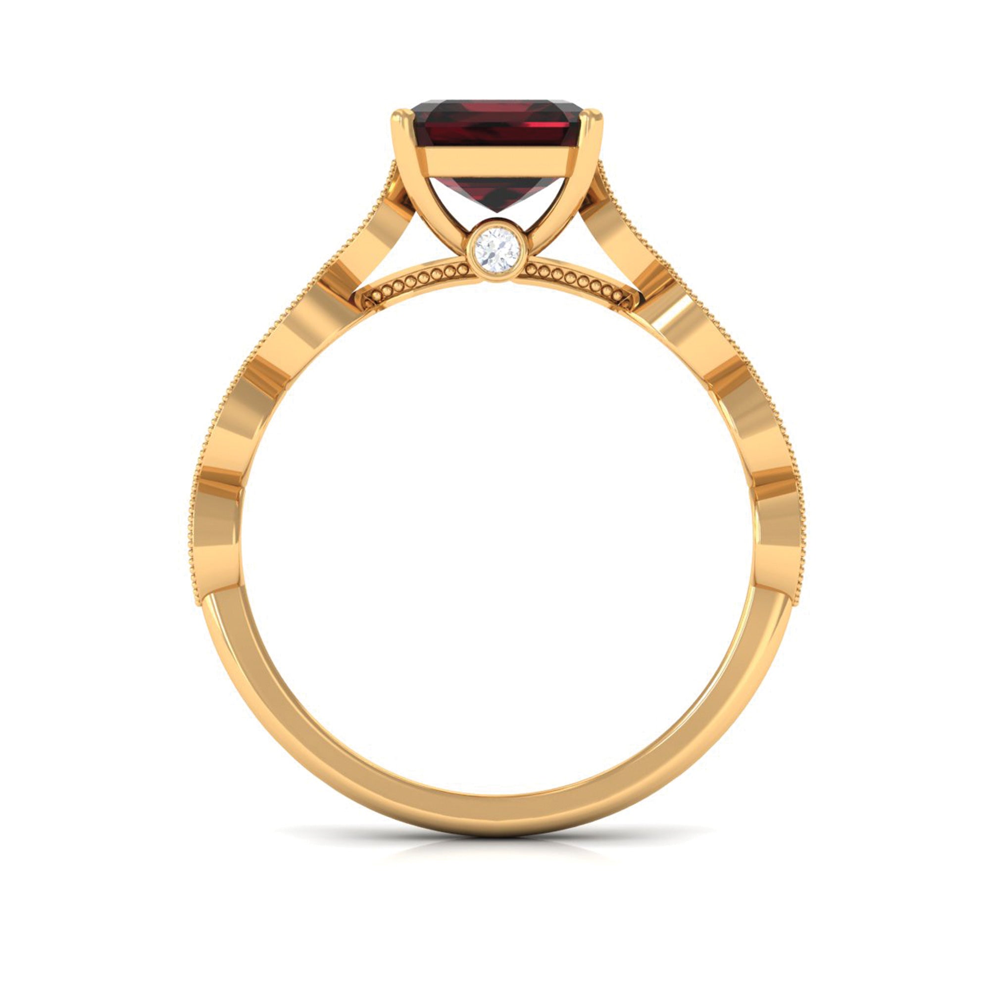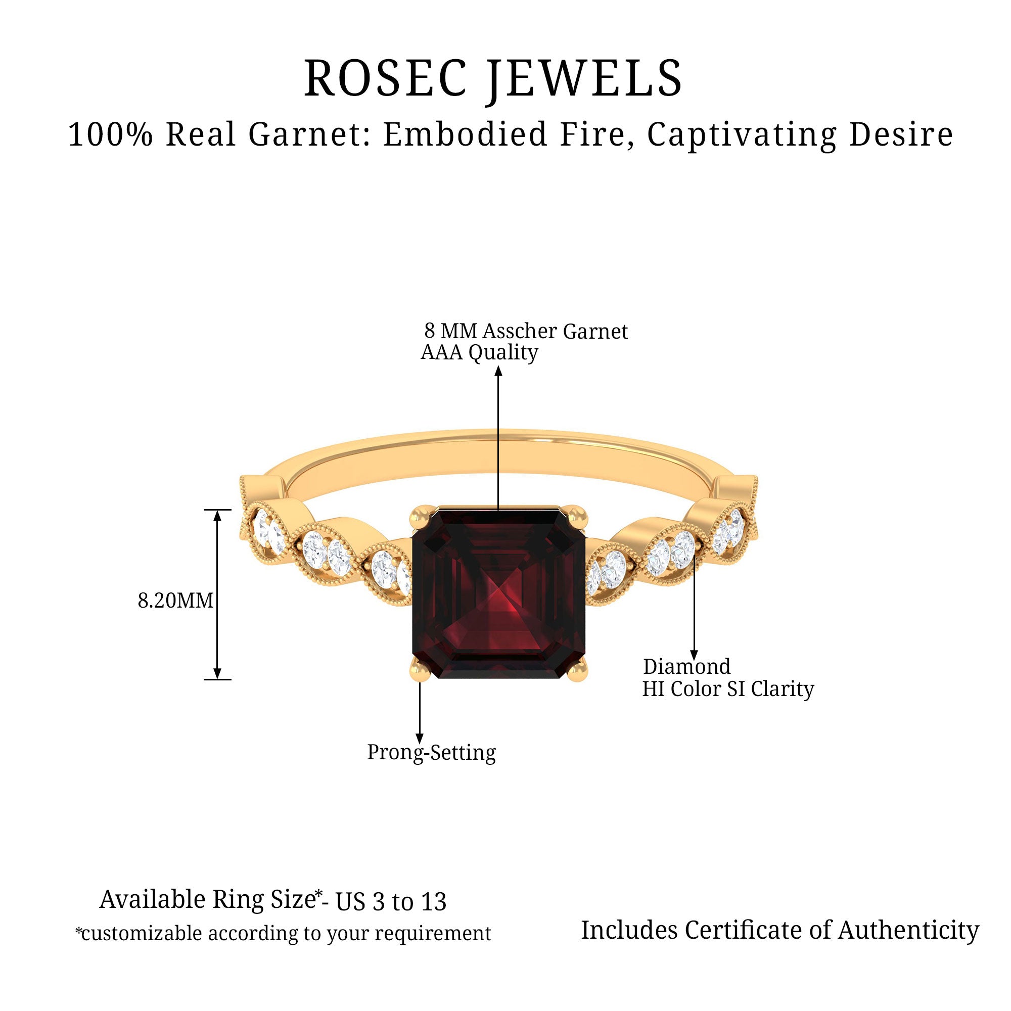 Express your love most dazzlingly with this breathtaking Asscher Cut Engagement Ring. At the center of this stunning Solitaire Engagement Ring is an 8 mm Asscher Cut Garnet set in Prong Setting, radiating deep, passionate red tones. Surrounding the center stone, the band is adorned with shimmering Diamond stones and intricate Beaded Detailing, adding layers of luxury and sophistication. What truly sets this Garnet Engagement Ring apart is the surprise Diamond placed beneath the center stone, a secret sparkle that adds an extra touch of magic and uniqueness. This Garnet Diamond Engagement Ring is a statement of enduring love and commitment. Its classic yet contemporary design ensures it will capture attention and be cherished for a lifetime. Perfect for those seeking a ring that combines timeless beauty with a modern twist, this Red Garnet Ring is a symbol of both the strength and delicacy of your relationship. Presented in a signature jewelry box and available in a range of sizes, this Vintage Looking Engagement Ring is as personal as the love it represents. Whether you are planning a proposal or celebrating a momentous occasion, this ring is the perfect way to say forever.