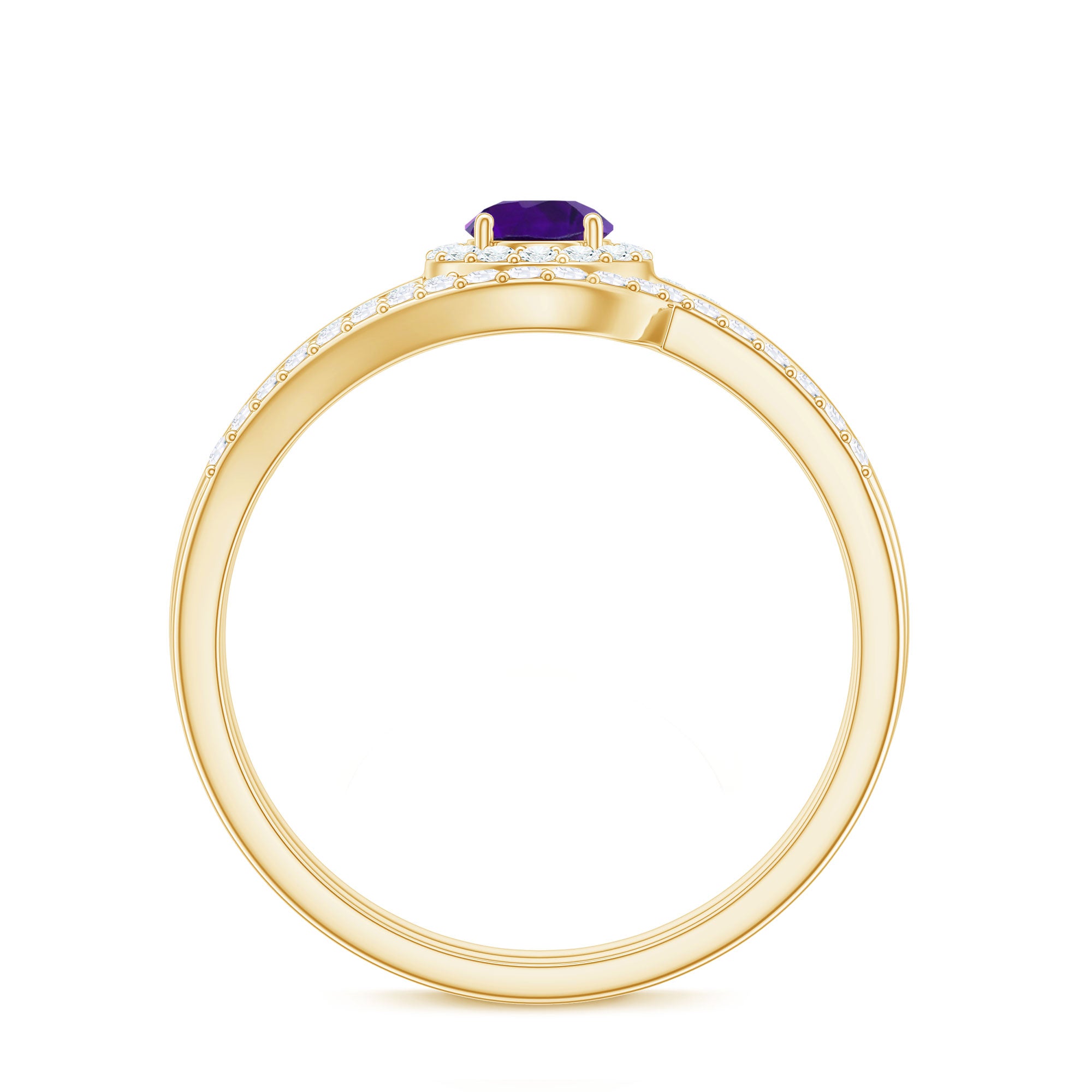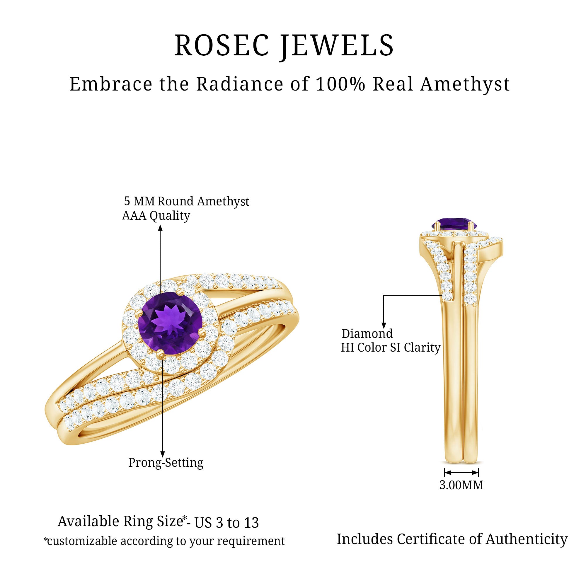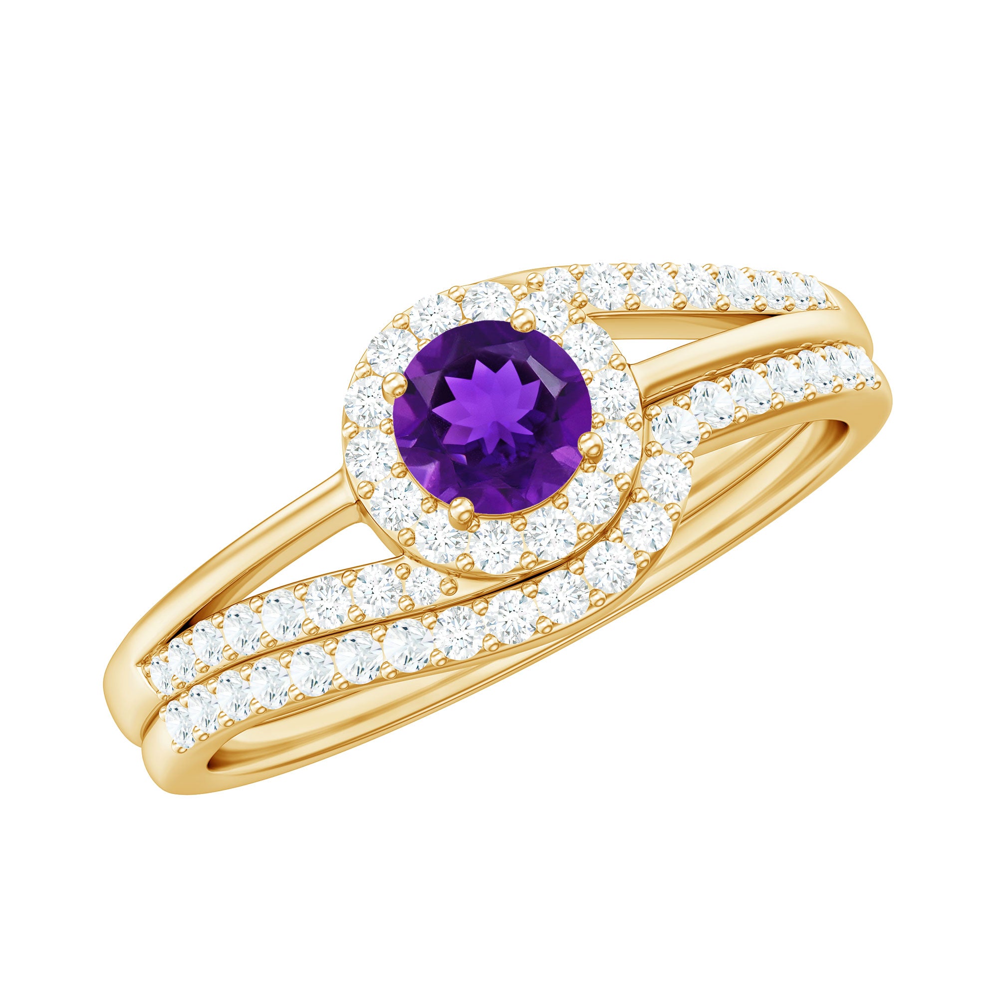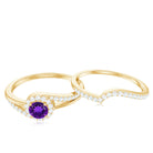 Make your special day even more memorable with our glorious Minimal Wedding Ring set. This stunning Bridal Ring Set features a Round Shape Amethyst at the center, adorned with Diamond Accents, and crafted with high-quality Gold for an opulent appeal. With its elegant and timeless design, this ring set is perfect for any special occasion, adding a touch of sophistication and beauty to your look.