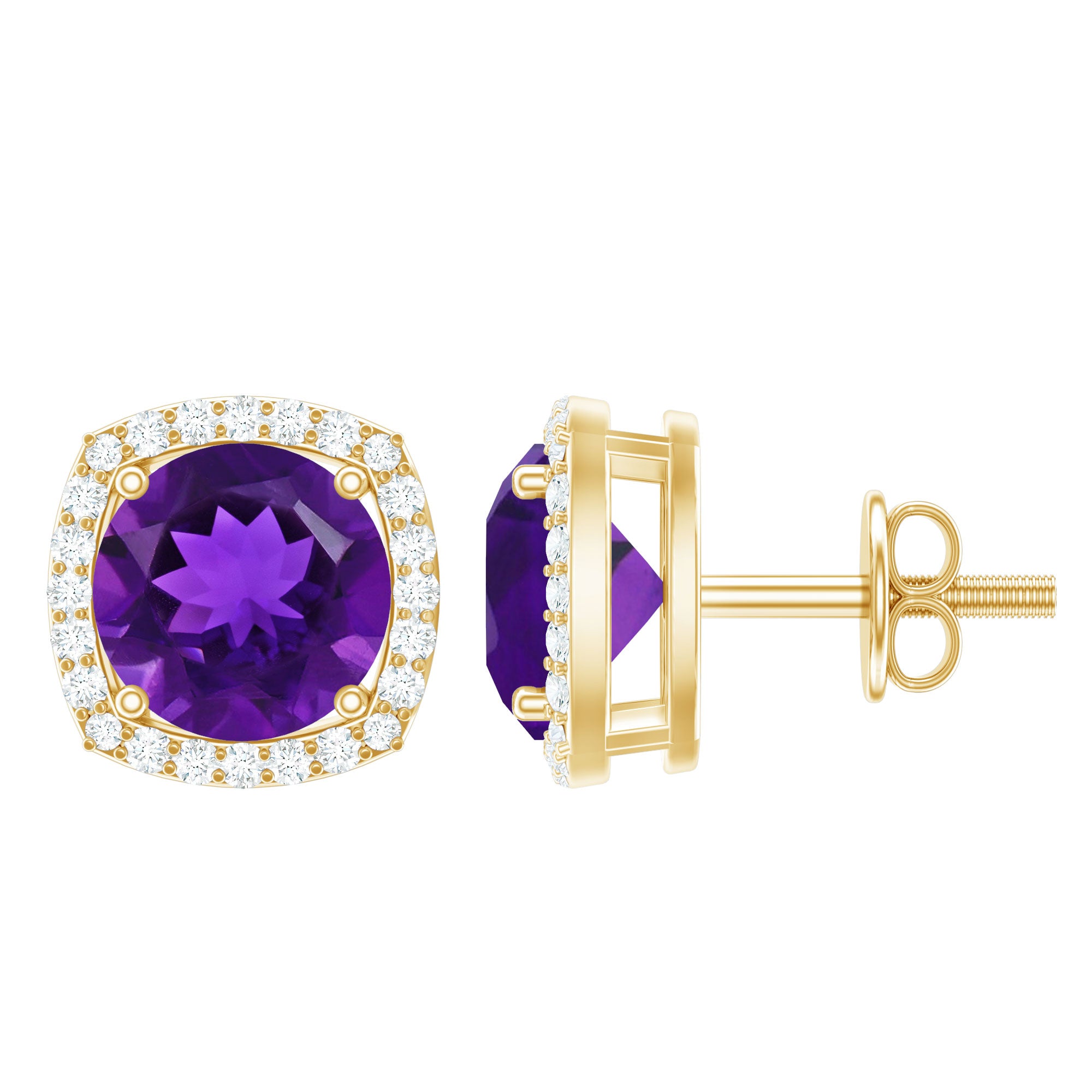 Stunning yet effortlessly elegant, these Amethyst Stud Earrings are a radiant celebration of color, sparkle and refined sophistication. Each earring features a mesmerizing 7 mm Round Shape Amethyst set in 4 Prong Setting, its rich purple hue evoking mystery, passion and serenity, while the surrounding Diamond Halo adds a delicate brilliance that catches the light from every angle. Designed with a secure Screw Back Closure, these Amethyst Diamond Earrings are perfect for daily wear or special occasions. The harmonious blend of vibrant gemstones and sparkling Diamond stones creates a timeless accessory that elevates any outfit, from a casual brunch to an evening gala. Handcrafted with perfection, these Amethyst Studs are a statement of style and grace. Delivered in a signature jewelry box, they make an exquisite gift for someone you cherish or a personal treat to celebrate yourself. A sparkling reminder of elegance, beauty and timeless sophistication.