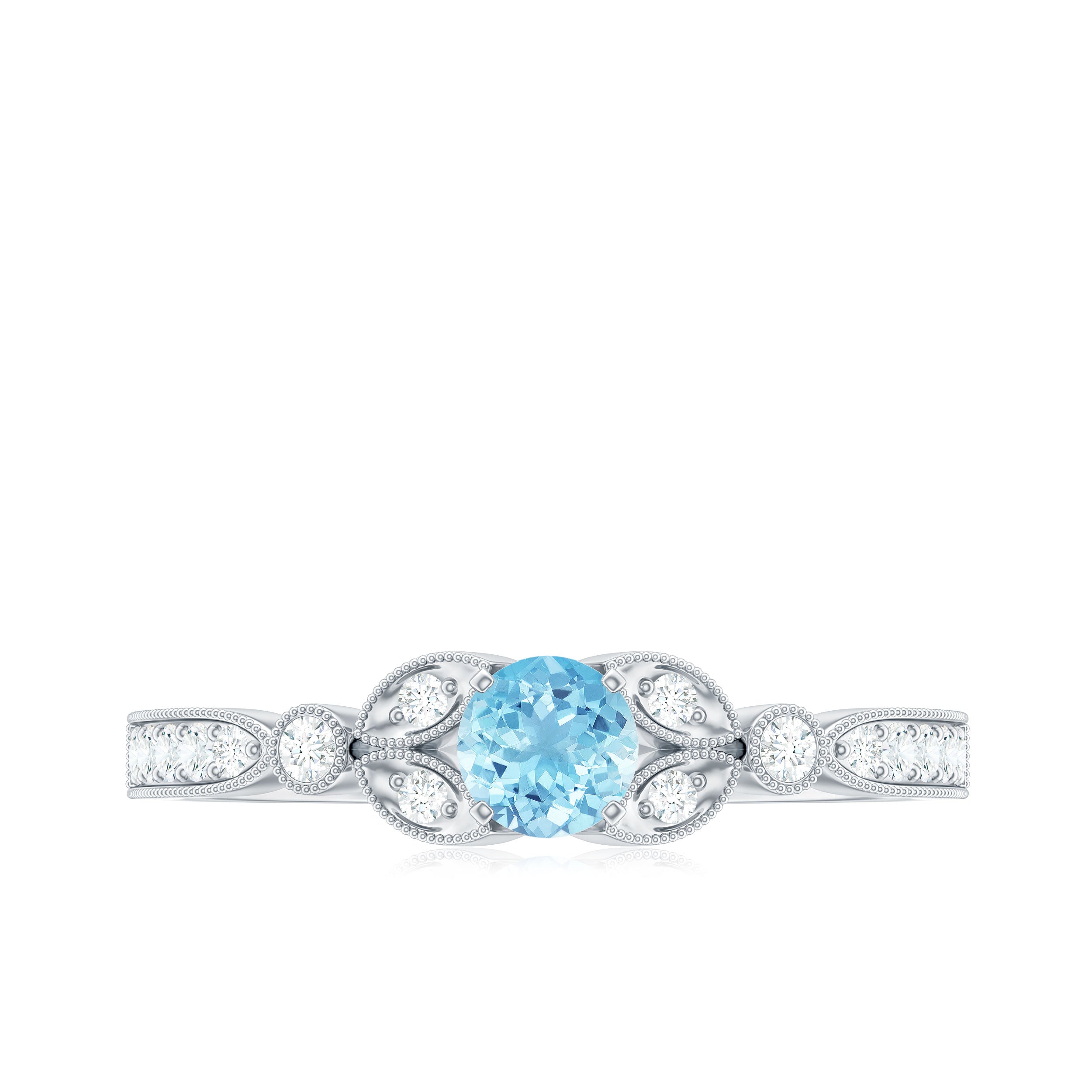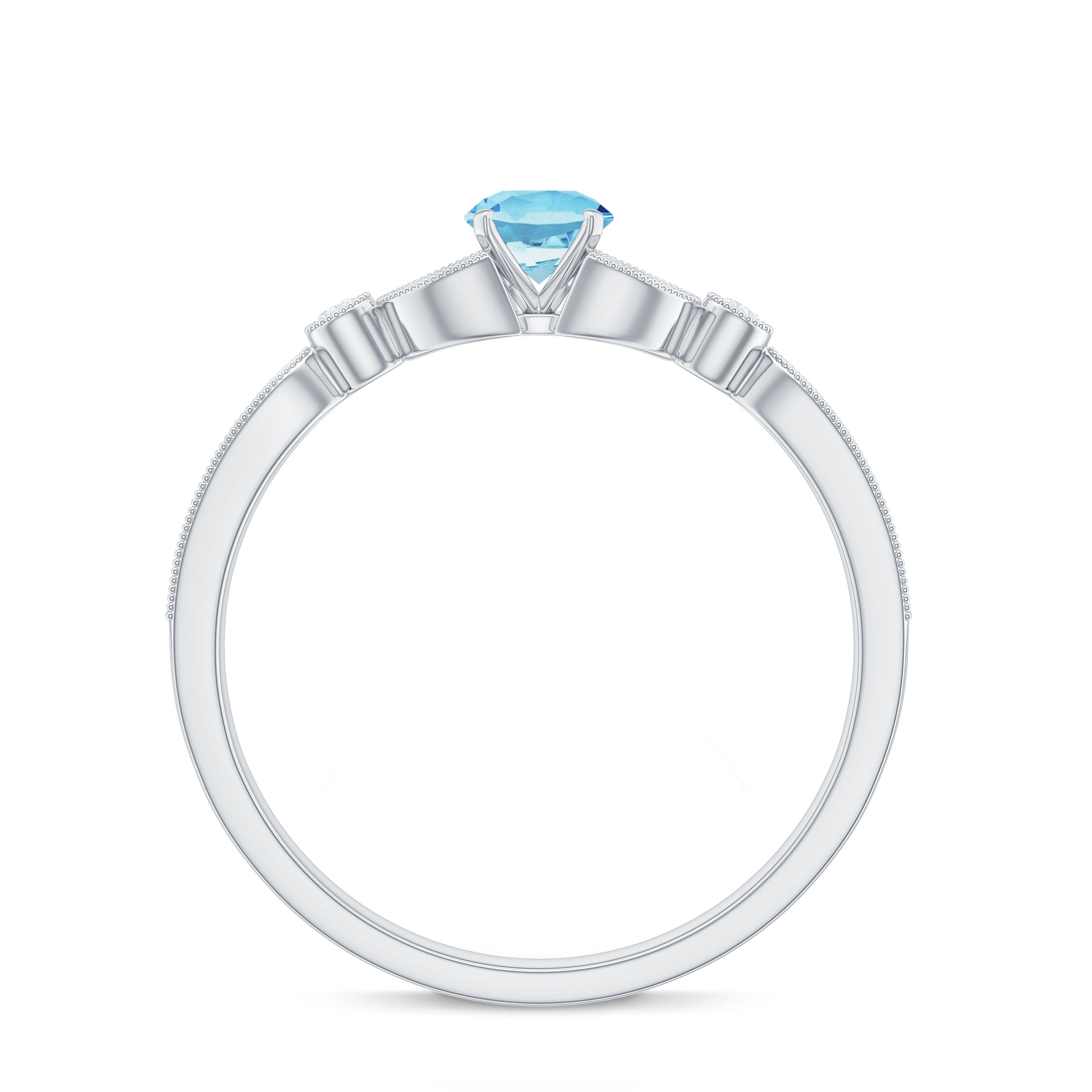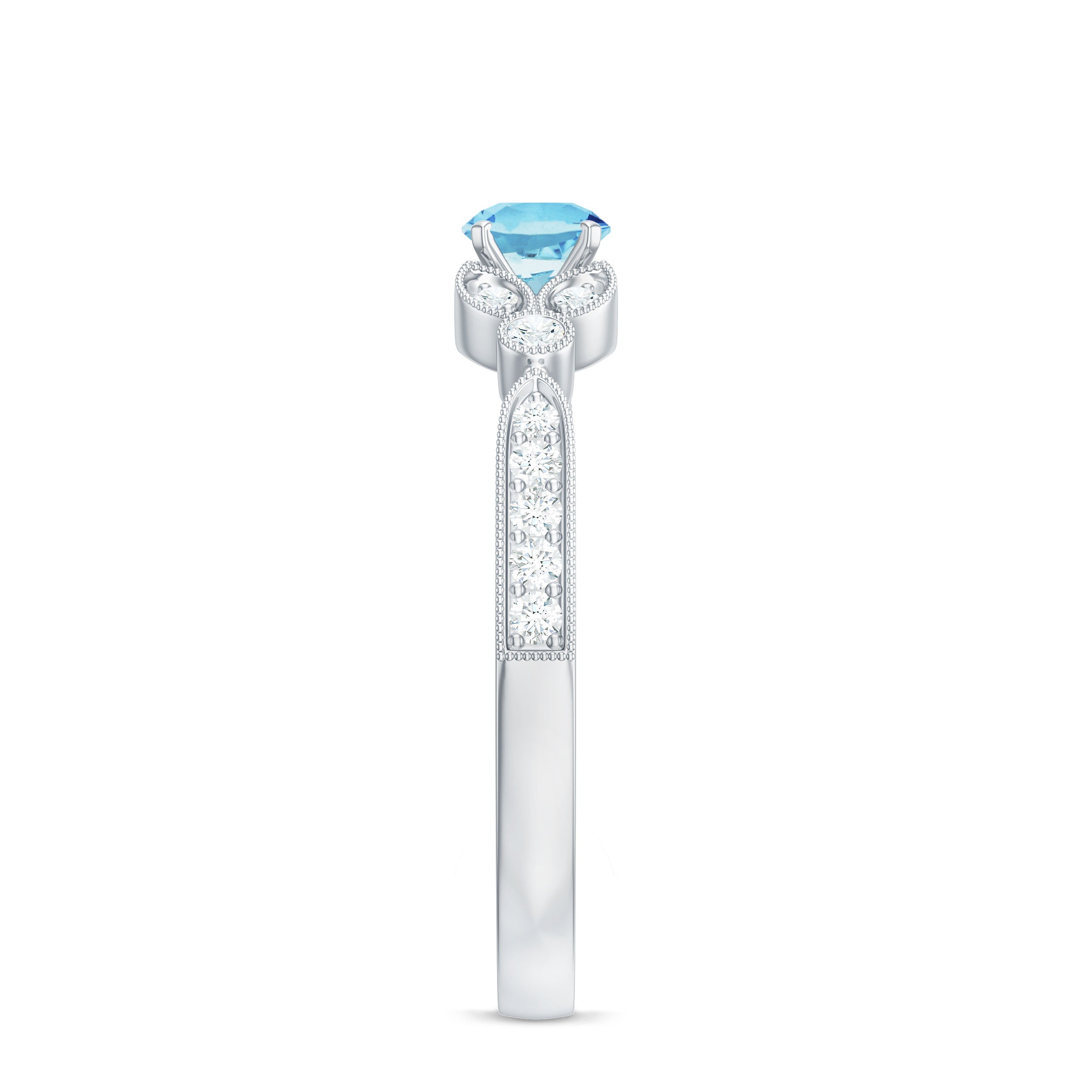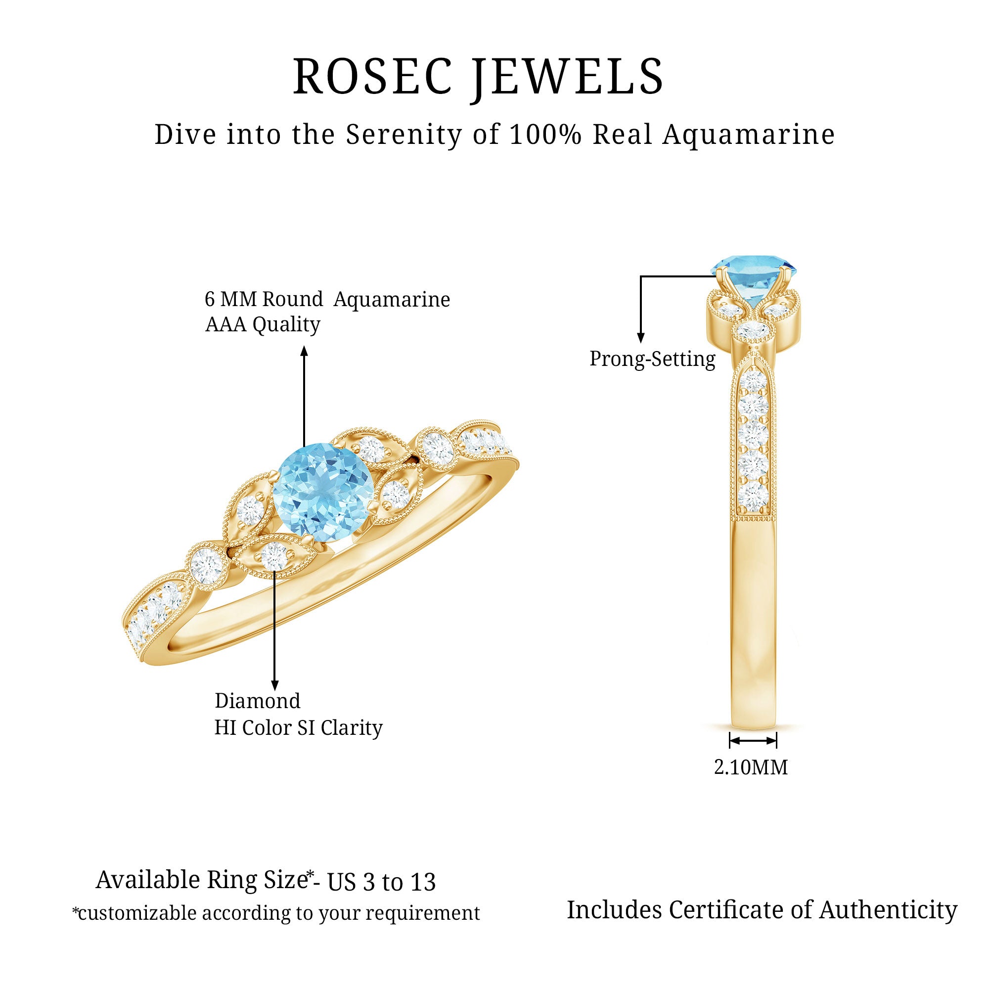 Symbolizing timeless romance and delicate artistry, this Vintage Looking Engagement Ring is a true celebration of enduring love. At its center rests a captivating 6 mm Round Shape Aquamarine gemstone set in Prong Setting, radiating an ocean-blue glow that evokes loyalty and the calm depth of heartfelt devotion. Flanked by sparkling Diamond Side Stones, this Aquamarine Solitaire Ring glimmers with understated elegance, while the intricate Beaded Detailing along the band adds a vintage inspired charm reminiscent of heirloom treasures. Every curve and facet is thoughtfully designed to highlight the natural brilliance of Aquamarine while reflecting a story of romance and timeless beauty. Available in various ring sizes and presented in a signature jewelry box, this Aquamarine Diamond Ring is perfect for proposals, anniversaries or marking any unforgettable moment in your love story. Romantic, graceful and filled with character, this Aquamarine Engagement Ring is a symbol of promise, a reflection of passion and a keepsake that captures the essence of eternal love in every delicate detail.