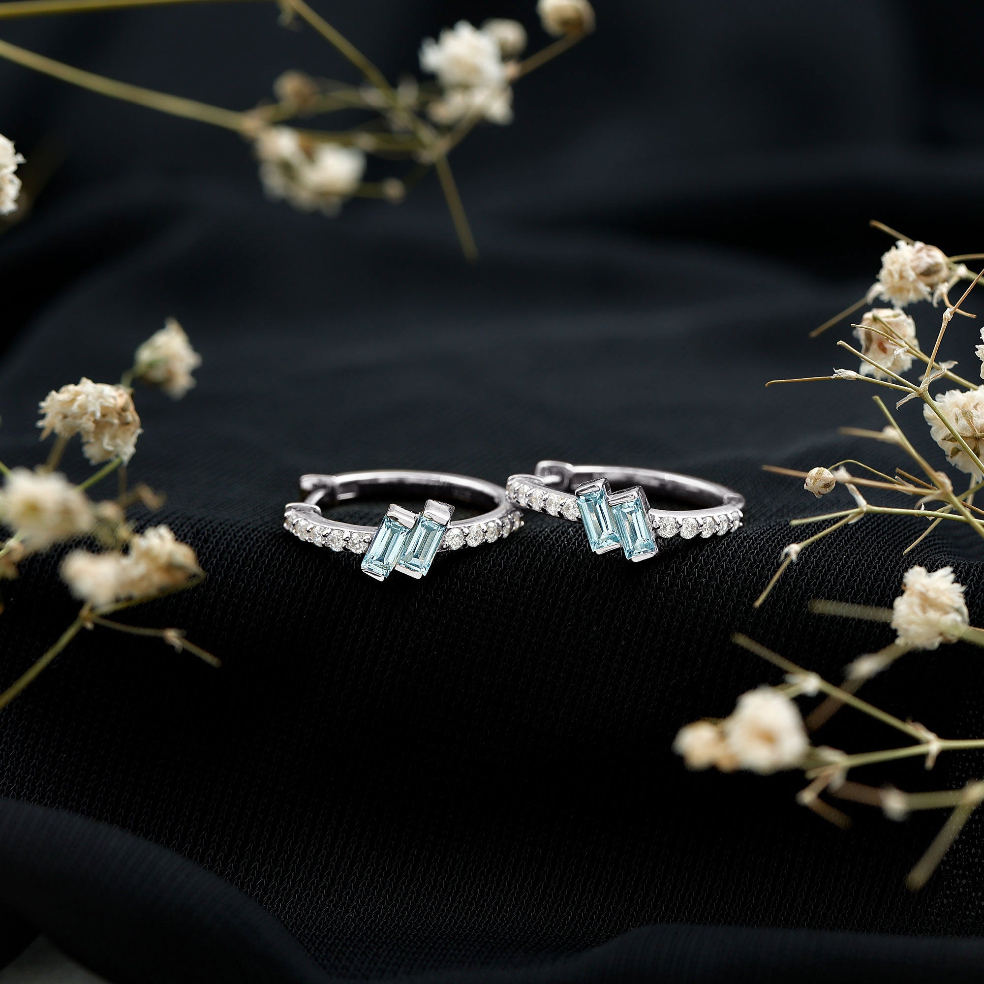 These Aquamarine Hoop Earrings are sure to turn heads and steal the spotlight wherever you go. Perfect for adding a touch of elegance and modern flair to any outfit, these Hinged Hoop Earrings feature two stunning 2X4 mm Baguette Shape AAA Quality Aquamarine gemstones, artfully set in a slightly slanted design over the hoop. This unique placement gives the earrings a contemporary and chic look. To elevate their sparkle even further, the Aquamarine Earrings are adorned with shimmering Lab Grown Diamond stones of EF-VS Quality, creating a perfect balance of color and radiance. These Aquamarine Diamond Earrings are versatile enough to pair with both casual and formal ensembles, whether it is a brunch date, office meeting, or glamorous evening event, they will effortlessly complete your look with grace and sophistication. The combination of natural Aquamarine gemstones and Lab Grown Diamond stones offers both luxury and sustainability, making them a smart and stylish choice. Presented in an elegant signature jewelry box, these Aquamarine Earring Silver also make a thoughtful gift for someone special.