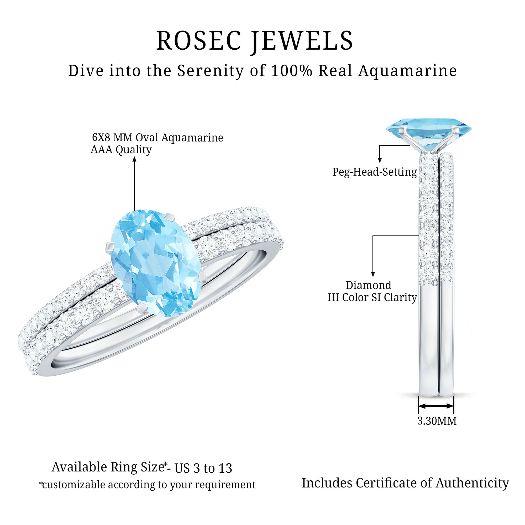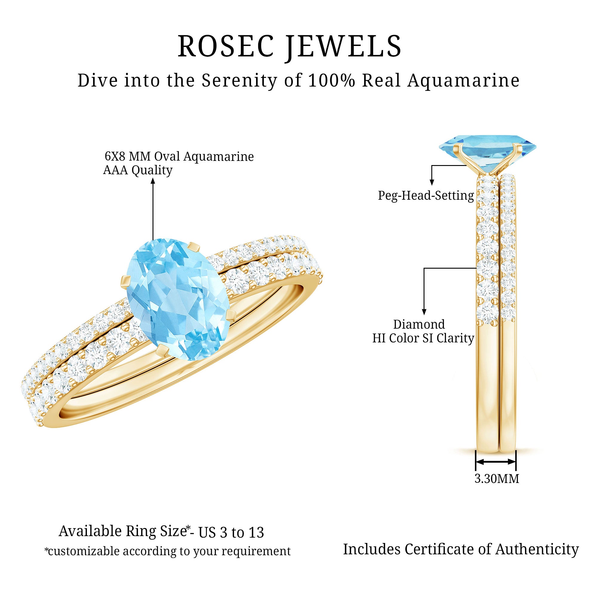 Surprise her with the radiant elegance of this Wedding Engagement Ring Set, a mesmerizing duo designed to celebrate love. The centerpiece of the Solitaire Engagement Ring features a 6X8 mm Oval Shape Aquamarine set in Peg Head Setting, shimmering with soft ocean blue hues that symbolize serenity and everlasting devotion. Sparkling HI-SI Diamond Side Stones gently embrace the AAA Quality Aquamarine, adding a touch of brilliance that mirrors the light in her eyes. Paired perfectly, the matching Wedding Band glistens with Diamond stones, creating a seamless harmony when worn together or a delicate sparkle when the engagement ring is worn alone. Crafted with perfection, this Aquamarine Engagement Ring with Wedding Band embodies both modern sophistication and timeless romance. The Aquamarine is known for its calming beauty and connection to eternal love, making it an unforgettable choice for the woman who captures your heart. Available in various ring sizes and presented in a signature jewelry box, this Wedding Bridal Ring Set is ready to mark your most meaningful moments.
