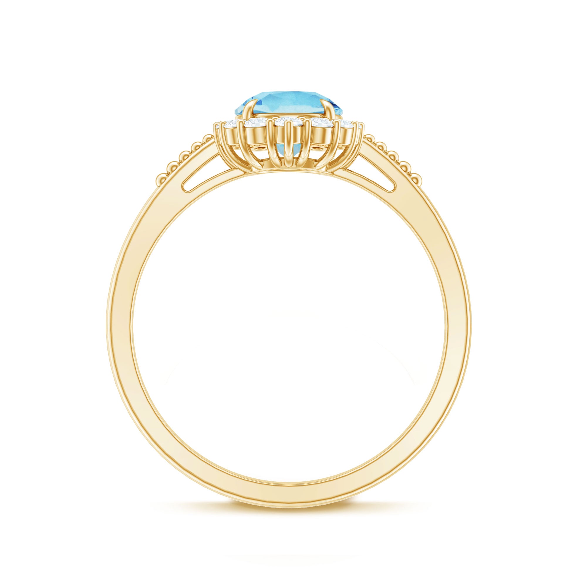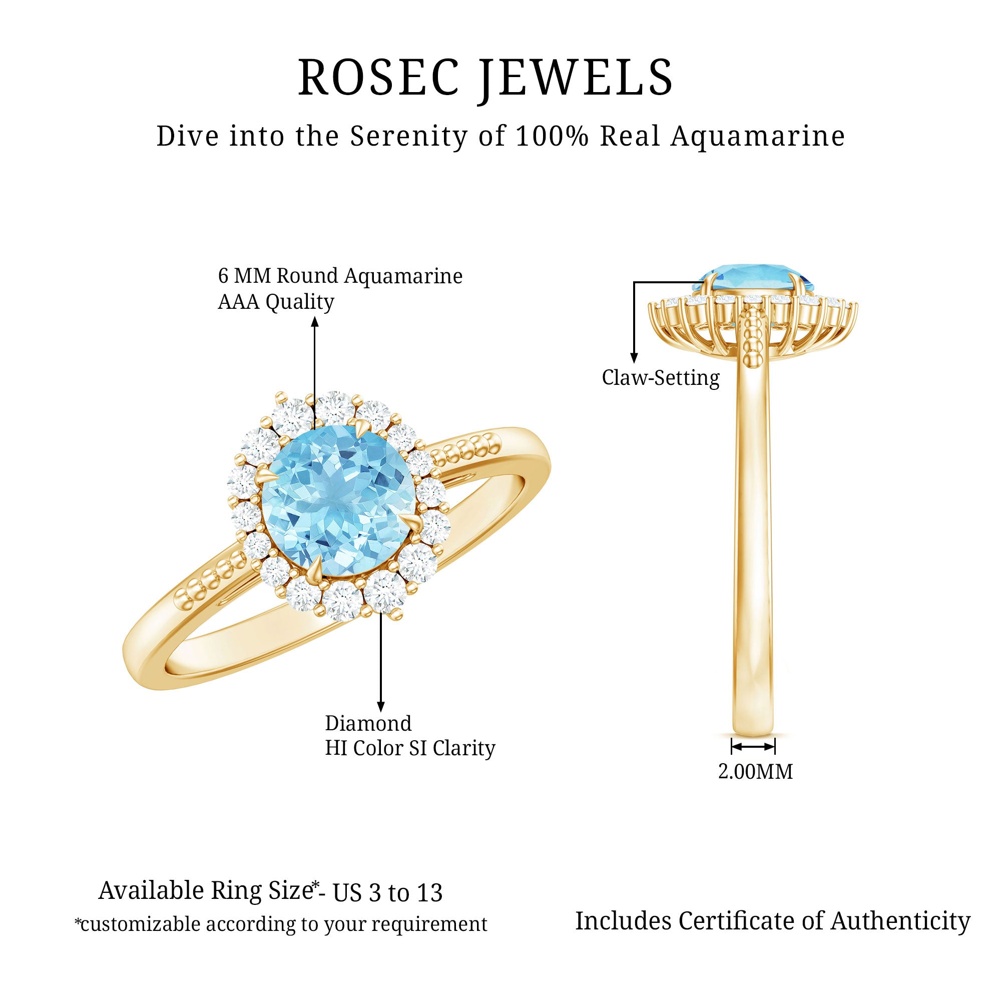 Embark on a journey of eternal love with this Aquamarine Engagement Ring, encircled by a Diamond Halo. A symbol of devotion and breathtaking beauty.