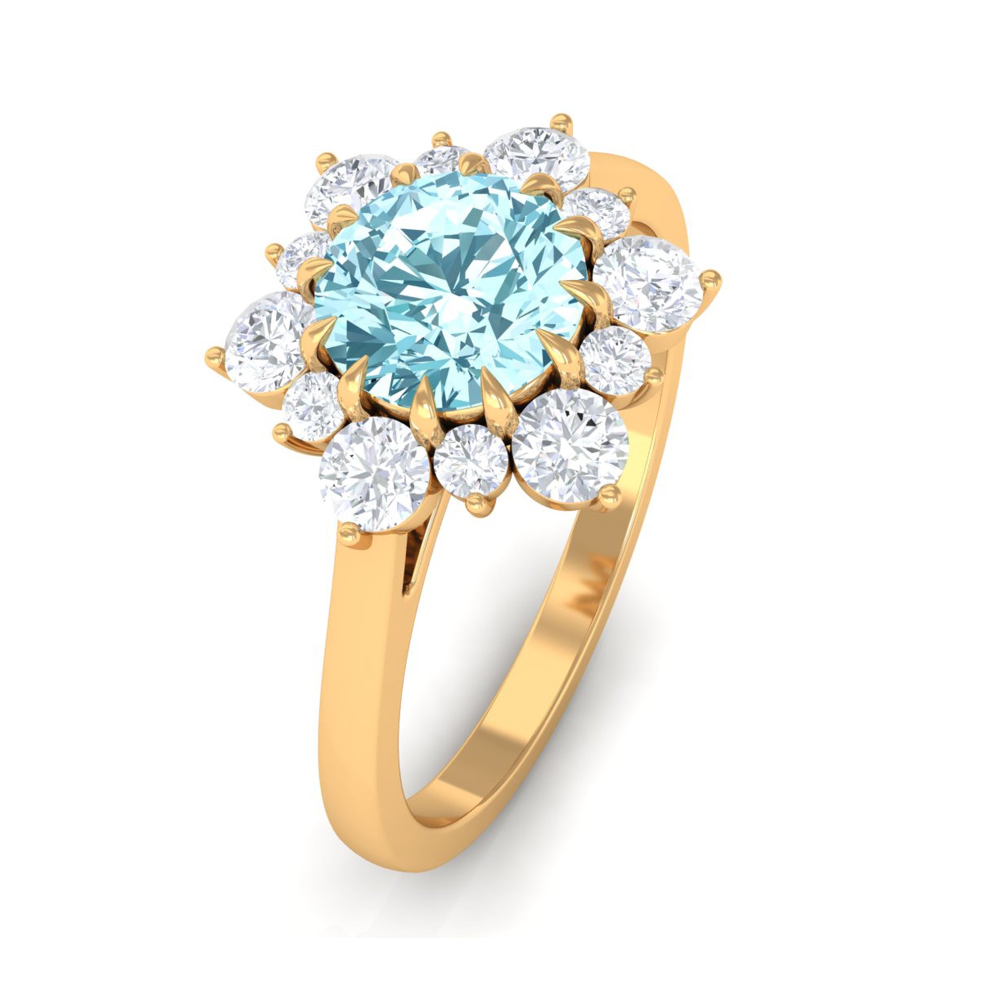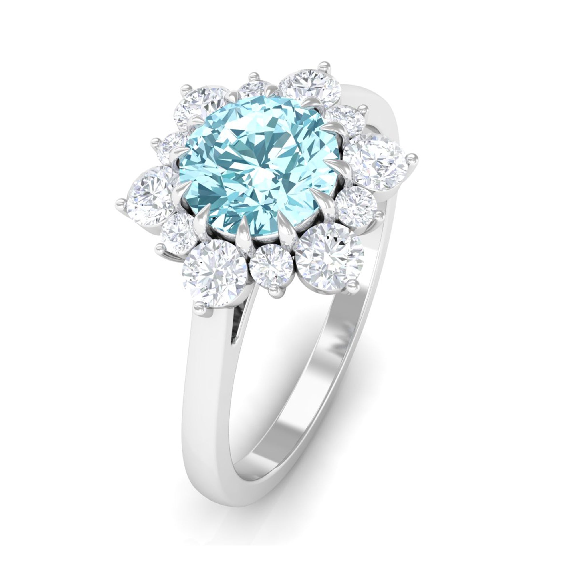 Exude grace with this elegant Classic Aquamarine Ring, showcasing Round Shape Aquamarine in a Claw Setting with a Diamond Halo. This Halo Engagement Ring exudes luxury and allure, making it a truly captivating piece.