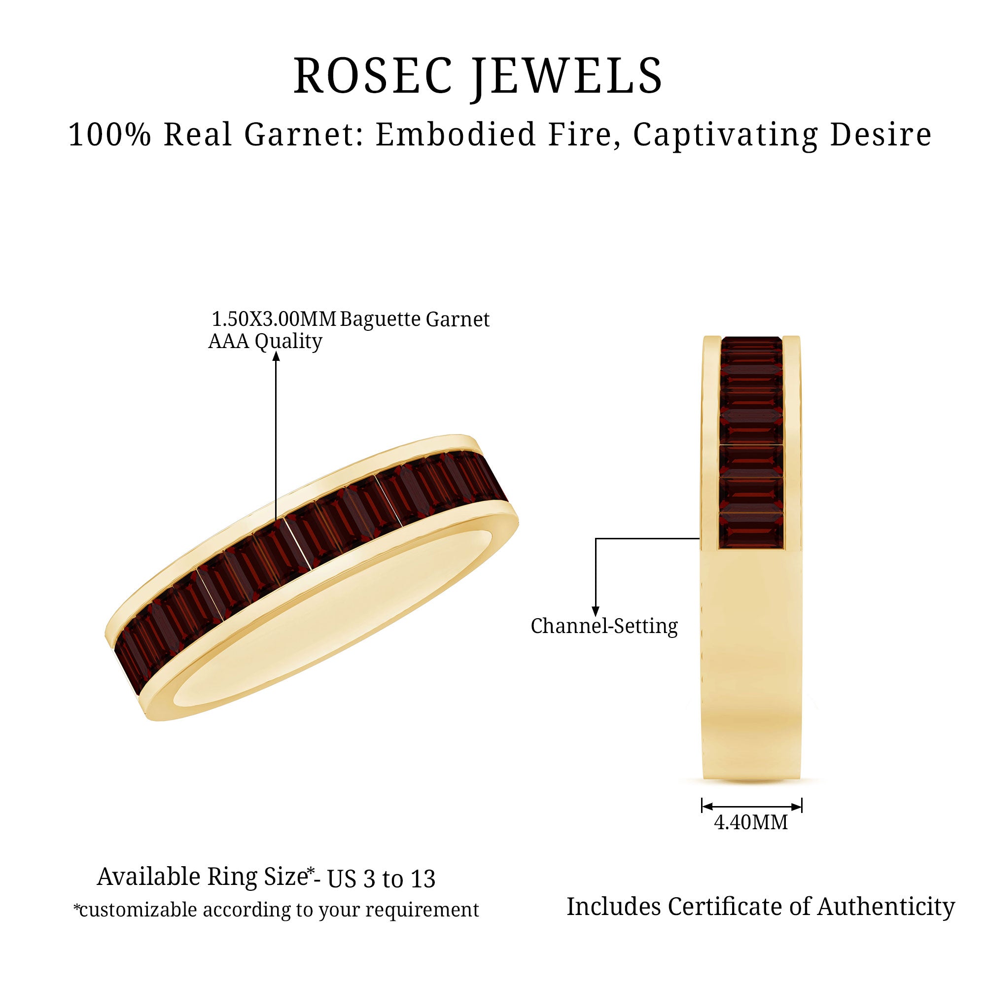 Add a touch of romance and elegance to your ring collection with our stunning Garnet Eternity Band. It is the perfect addition to her jewelry collection, featuring a rich red hue that pairs beautifully with all your favorite outfits. This classic piece showcases baguette cut garnets set securely in channel setting, letting their brilliance shine. Whether you wear it as an Eternity Wedding Band, stack it with another ring, or flaunt it as a standalone piece, its high quality craftsmanship and striking contrast are sure to impress. Plus, you can surprise your loved one with this gorgeous Baguette Wedding Band, it is bound to make her heart race. Handcrafted in 14k yellow gold plated silver.