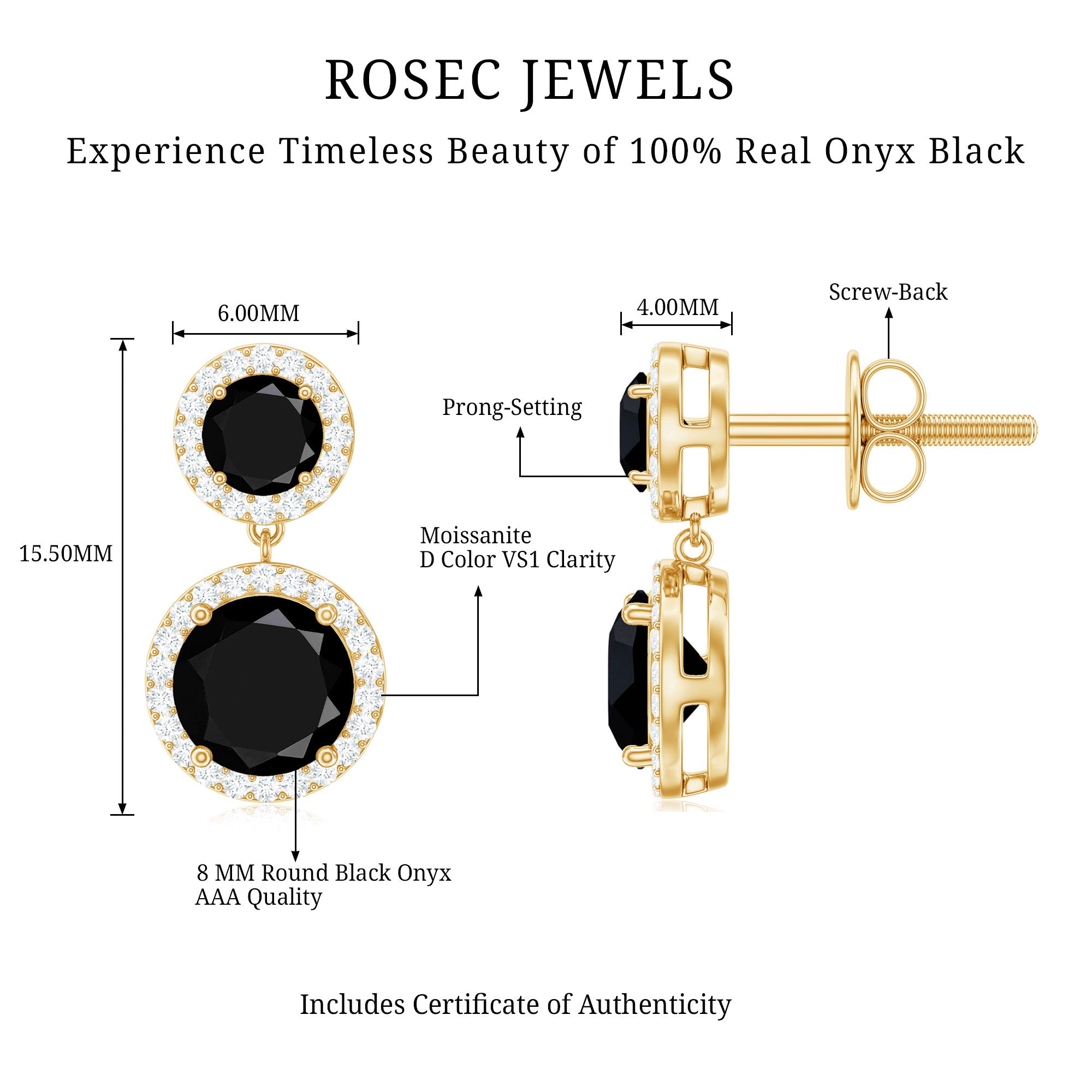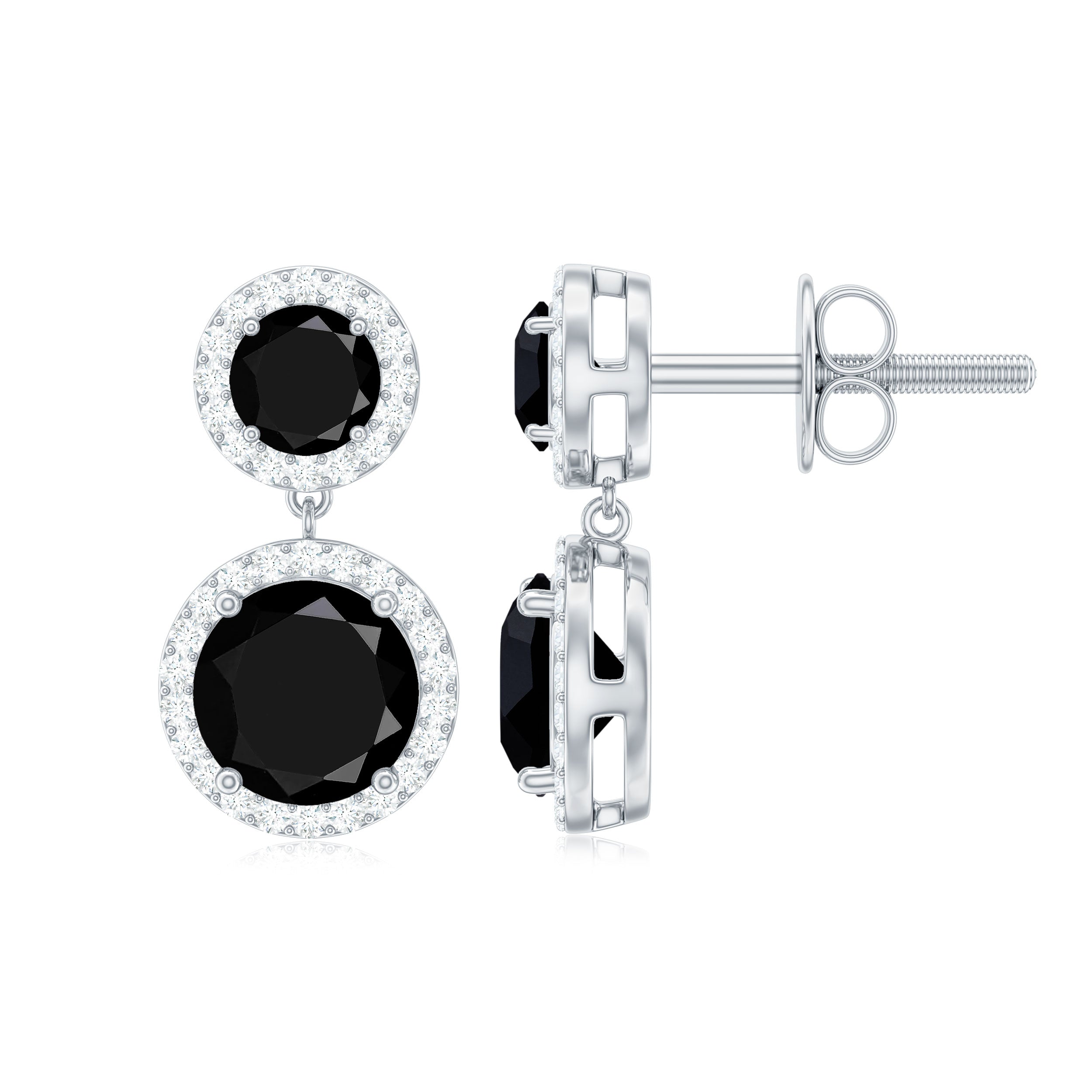 Bold elegance flows through every detail of this Black Onyx Dangle Earring, crafted with a striking black and white contrast that captures attention instantly. Featuring a 5 MM round black onyx at the top and an 8 MM round black onyx gracefully hanging below, the design creates a beautiful balance of sophistication and movement. Each gemstone is surrounded by a sparkling moissanite halo, adding radiant brilliance that highlights the deep richness of the onyx. Set in secure prong setting, the stones shine brightly from every angle, giving the Halo Earrings a luxurious look. The graceful dangle drop style adds soft motion, making these Black and White Earrings perfect for both special events and everyday elegance. A reliable screw-back closure ensures comfort and security, so they stay in place all day. The classic combination of AAA quality black onyx and D-VS1 quality moissanite blends seamlessly with any outfit, from modern and minimal to glamorous and bold.
