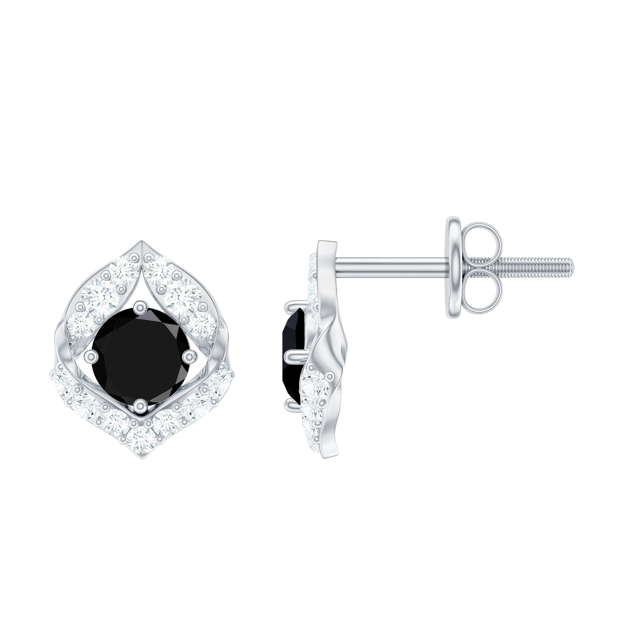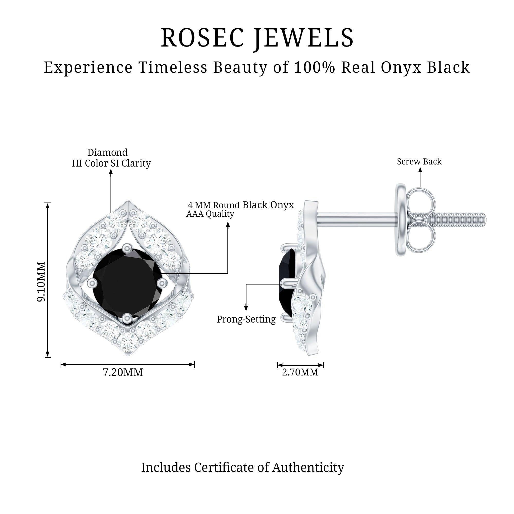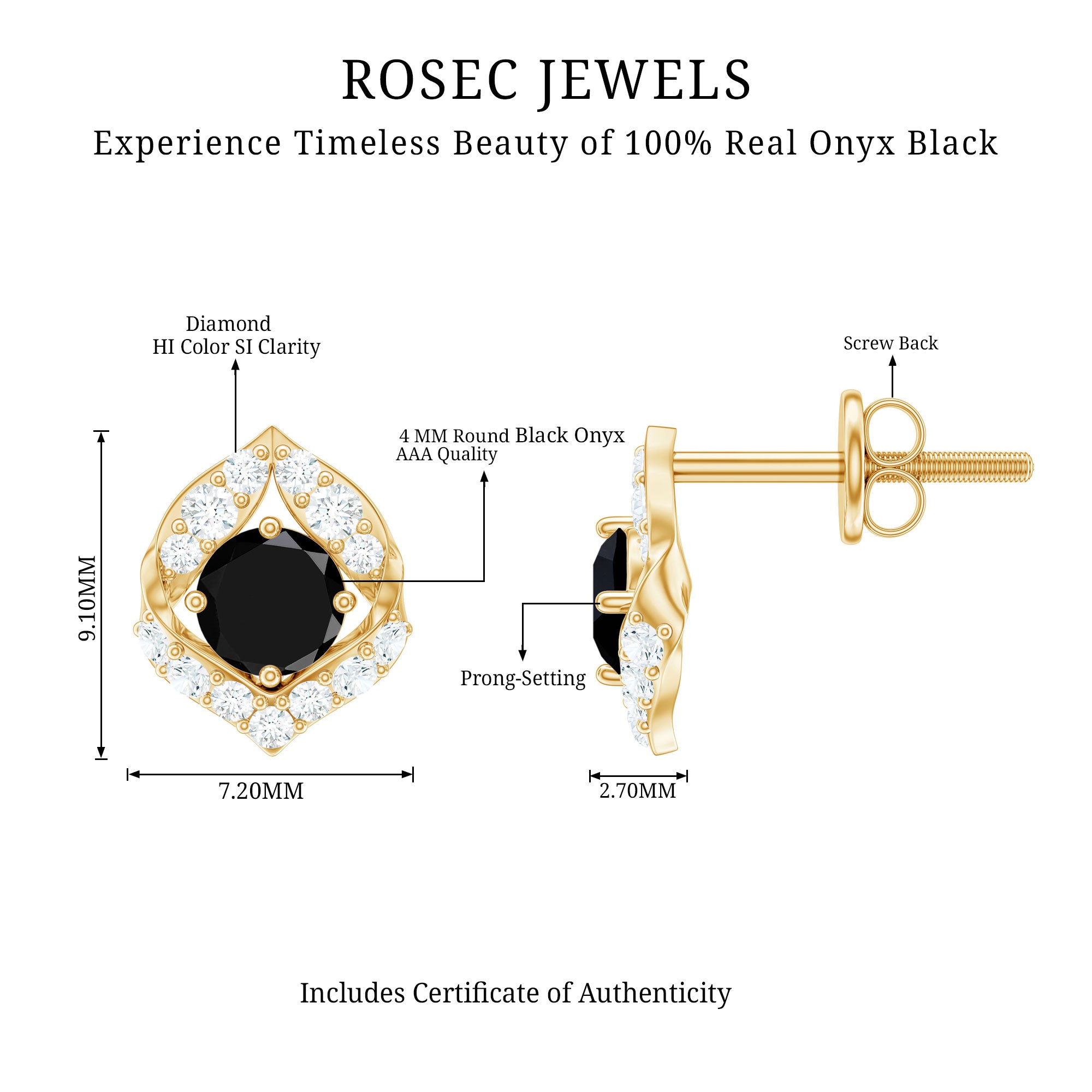 Captivate hearts with every glance of these stunning Leaf Earrings, where nature meets elegance most beautifully. The 4 mm Round Shape Black Onyx is set in Prong Setting within a delicate Leaf Shaped frame, creating a graceful design that symbolizes growth, beauty and timelessness. The frame is adorned with sparkling Diamond stones, adding just the right amount of brilliance to elevate the bold onyx stone. The combination of the dark AAA Quality Black Onyx and the sparkling HI-SI Diamond stones creates a sophisticated contrast that makes these Black and White Earrings perfect for both special occasions and everyday wear. Designed with Screw Back Closure, these Black Onyx Diamond Earrings offer a comfortable fit, ensuring they stay in place from morning to night. Whether you are dressing up for an evening event or adding a touch of refined style to a casual outfit, these Black Onyx Earrings complement any look effortlessly. These Black Onyx Stud Earrings are the perfect way to add a touch of nature inspired luxury to your jewelry collection, offering timeless beauty that is both stylish and sophisticated.