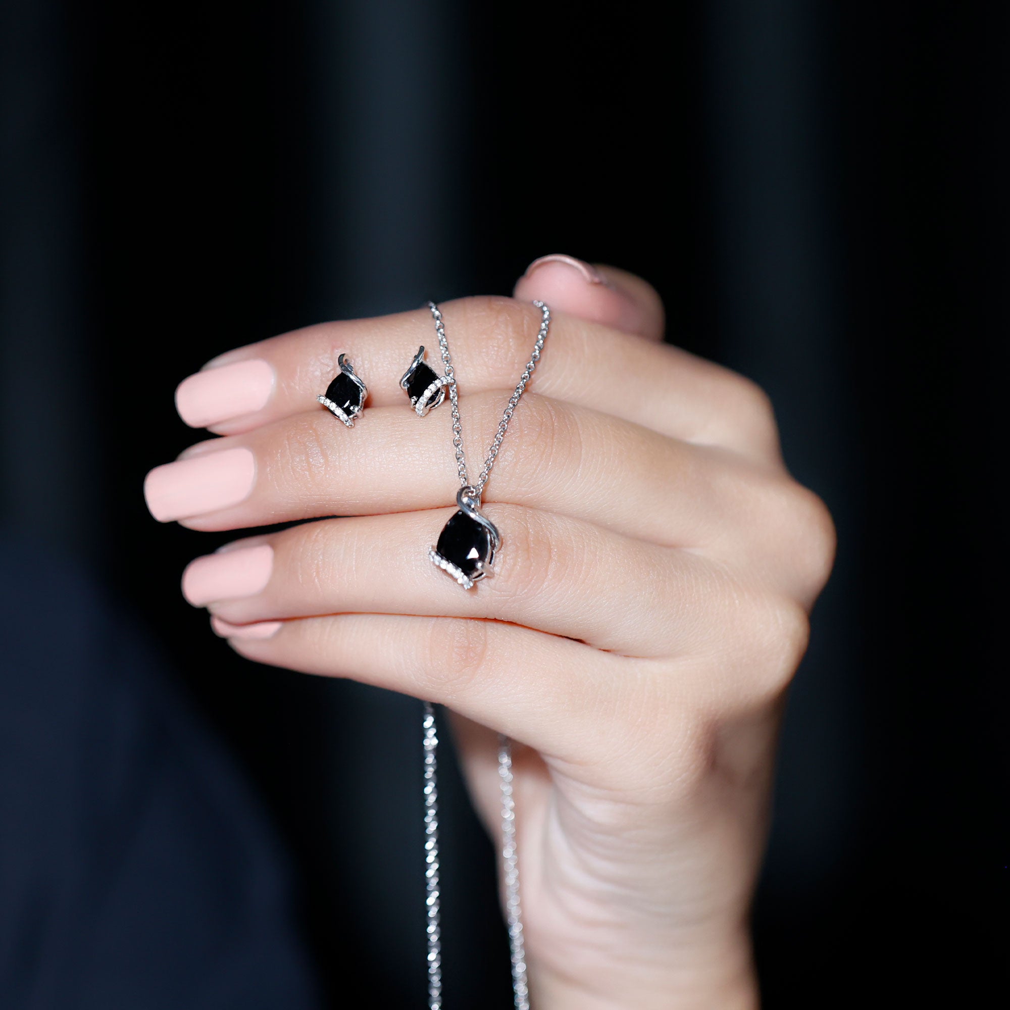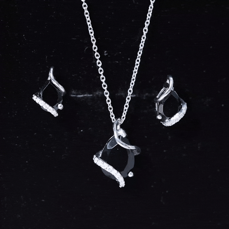 Black never goes out of style, and this stunning Solitaire Jewelry Set proves it right. Designed around the timeless beauty of monochrome, this Teardrop Necklace and Earrings Set brings together bold elegance and everyday charm in to most graceful way. Handcrafted in 14k white gold plated sterling silver, the set features pear shaped black spinel (7X10 MM stone in Pendant and 5X7 MM stone in Stud Earrings) held by secure prongs, making them a total showstopper. Each stone is gently hugged by a sleek metal wave, dotted with tiny round cut Moissanite stones that add just the right amount of sparkle without stealing the spotlight. The contrast of dark and light in this Black Spinel Jewelry Set creates a clean, classy look that goes with literally everything. The pendant hangs from a delicate cable chain that is both strong and stylish, while the earrings come with secure screw back closures, so you can wear them comfortably all day long. This Black and White Necklace Set is perfect for women who love simple yet striking jewelry.