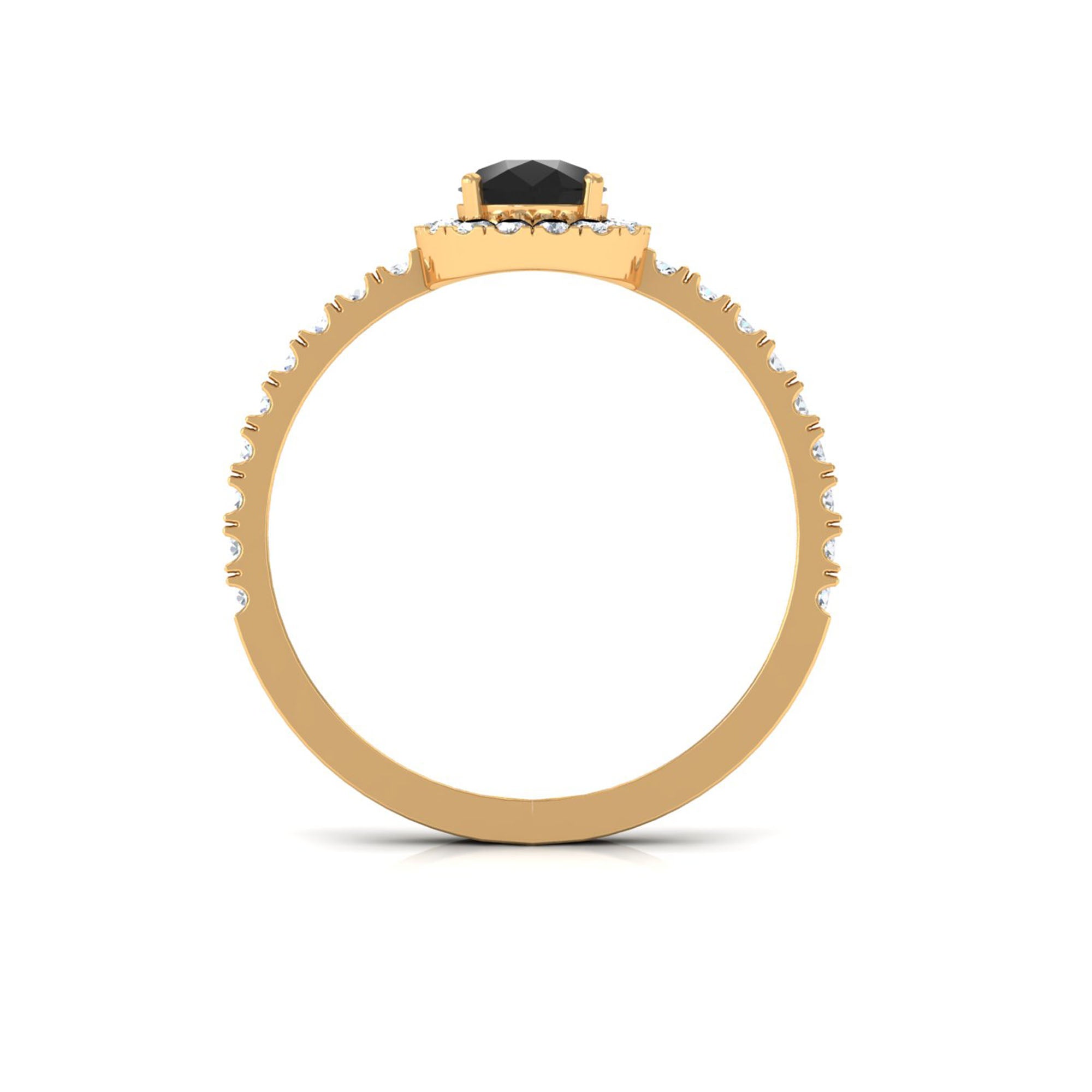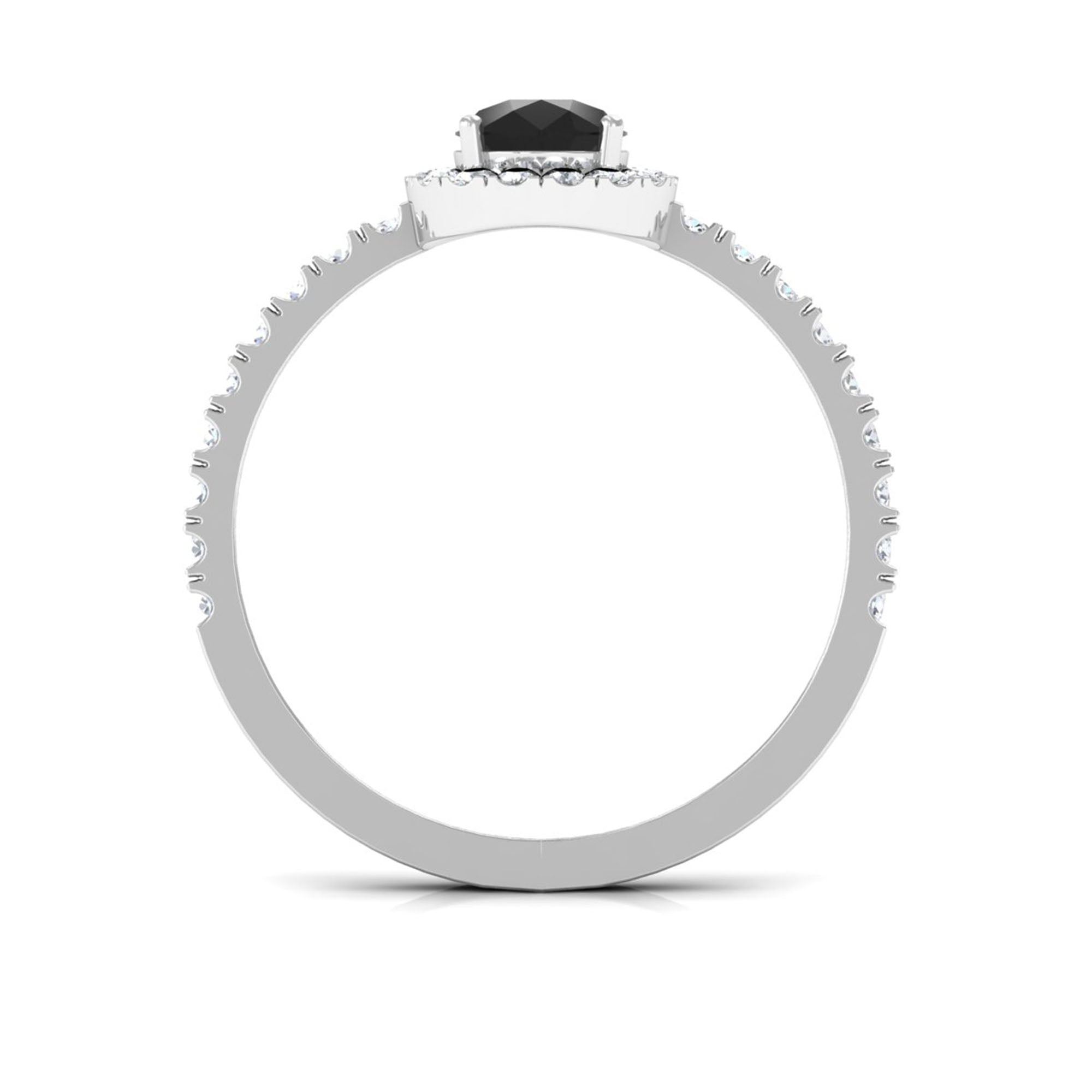 The Natural Black Spinel Pear Shaped Engagement Ring with Diamond Halo is designed for those who appreciate dramatic contrast and contemporary elegance. The deep, opaque tone of black spinel creates a striking focal point, offering a distinctive alternative to traditional clear gemstones.