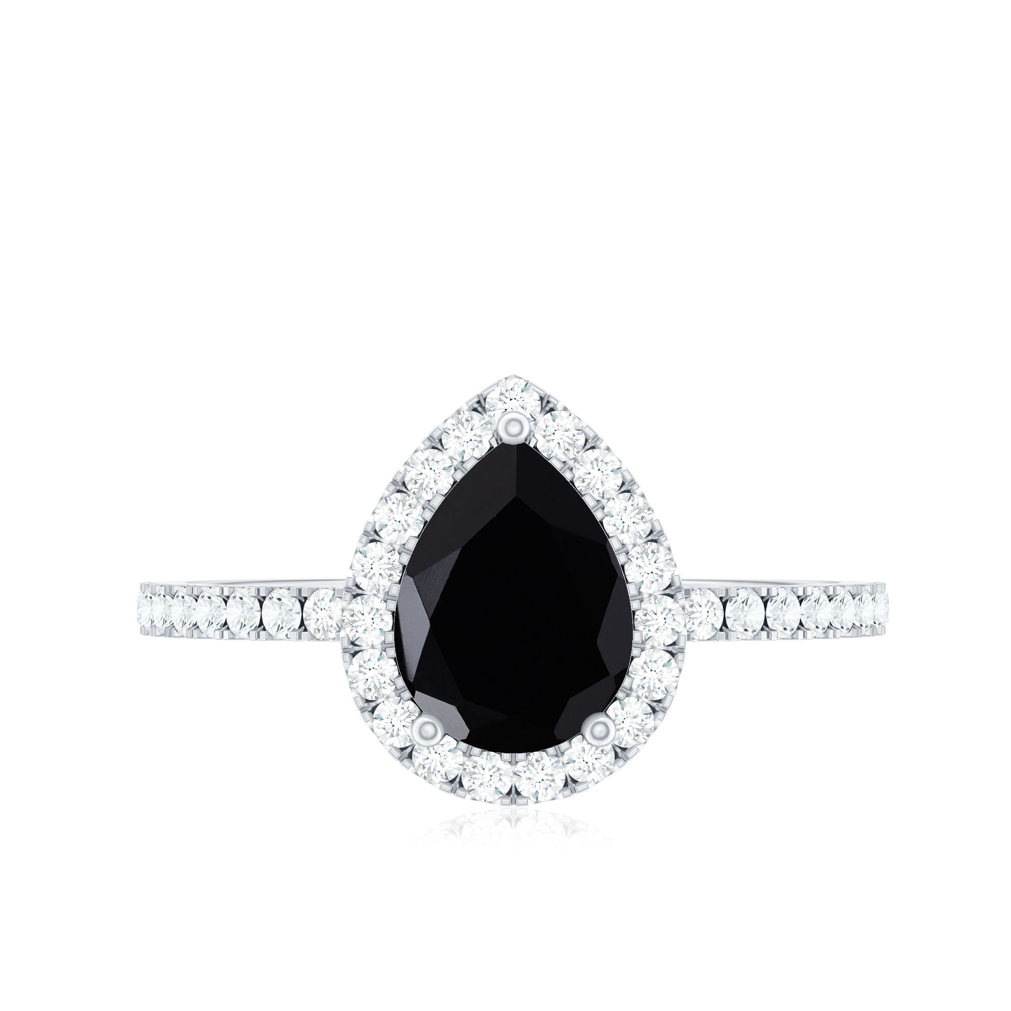 - Natural pear-shaped black spinel center stone.