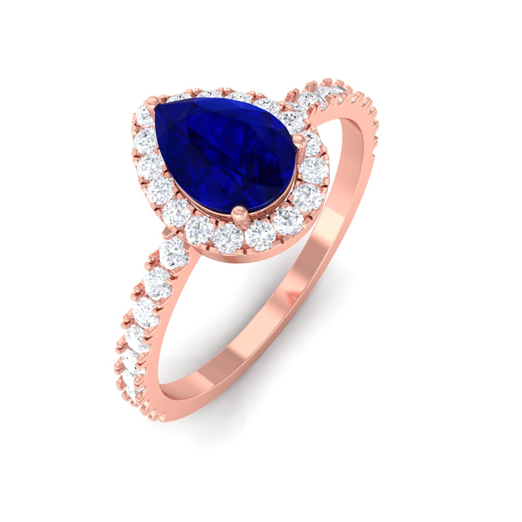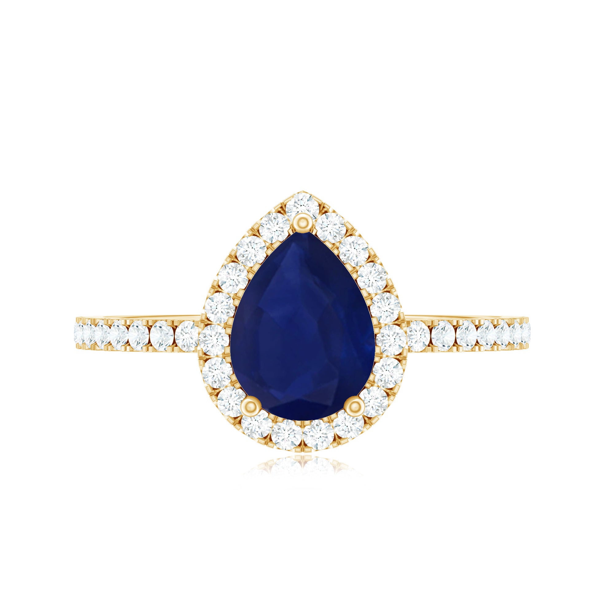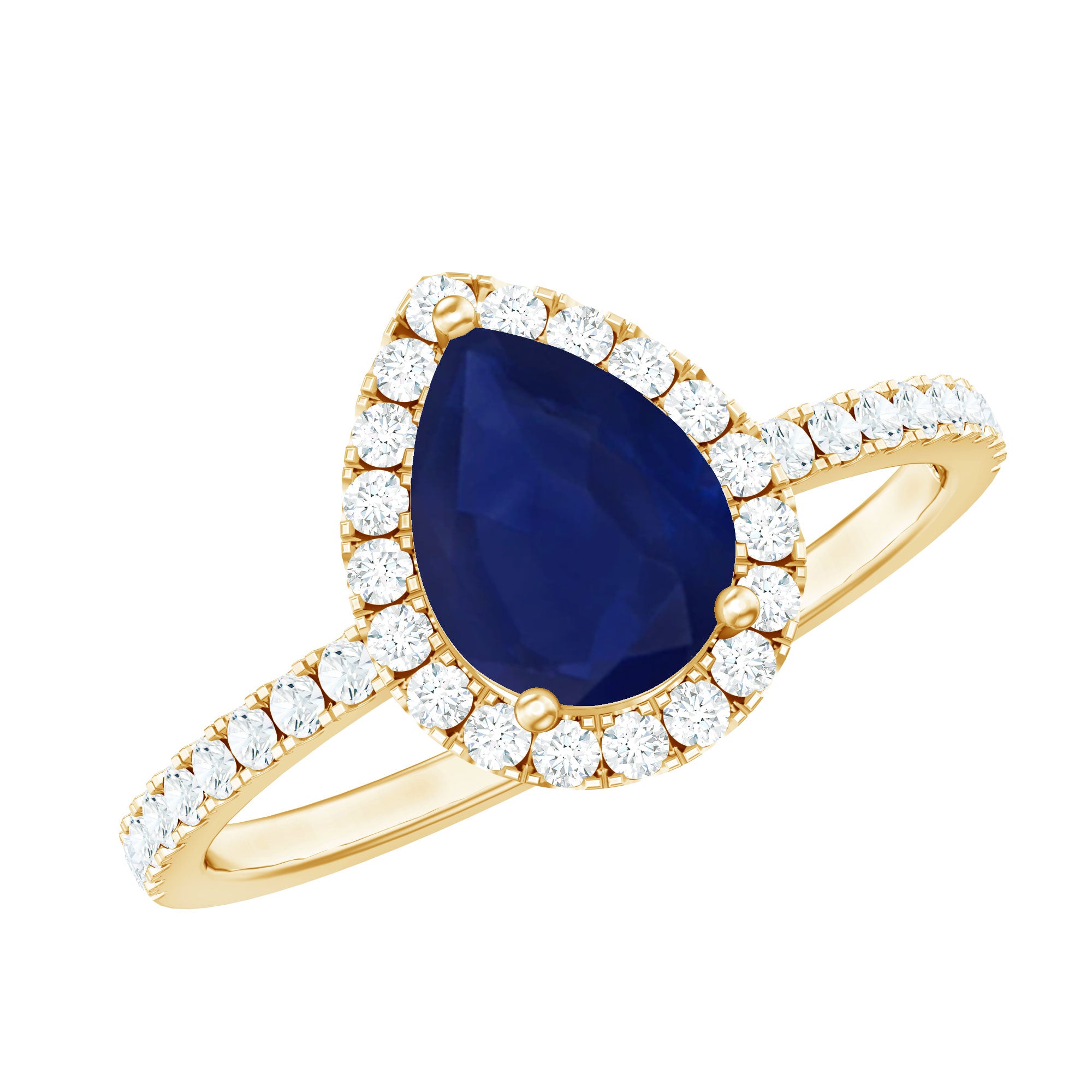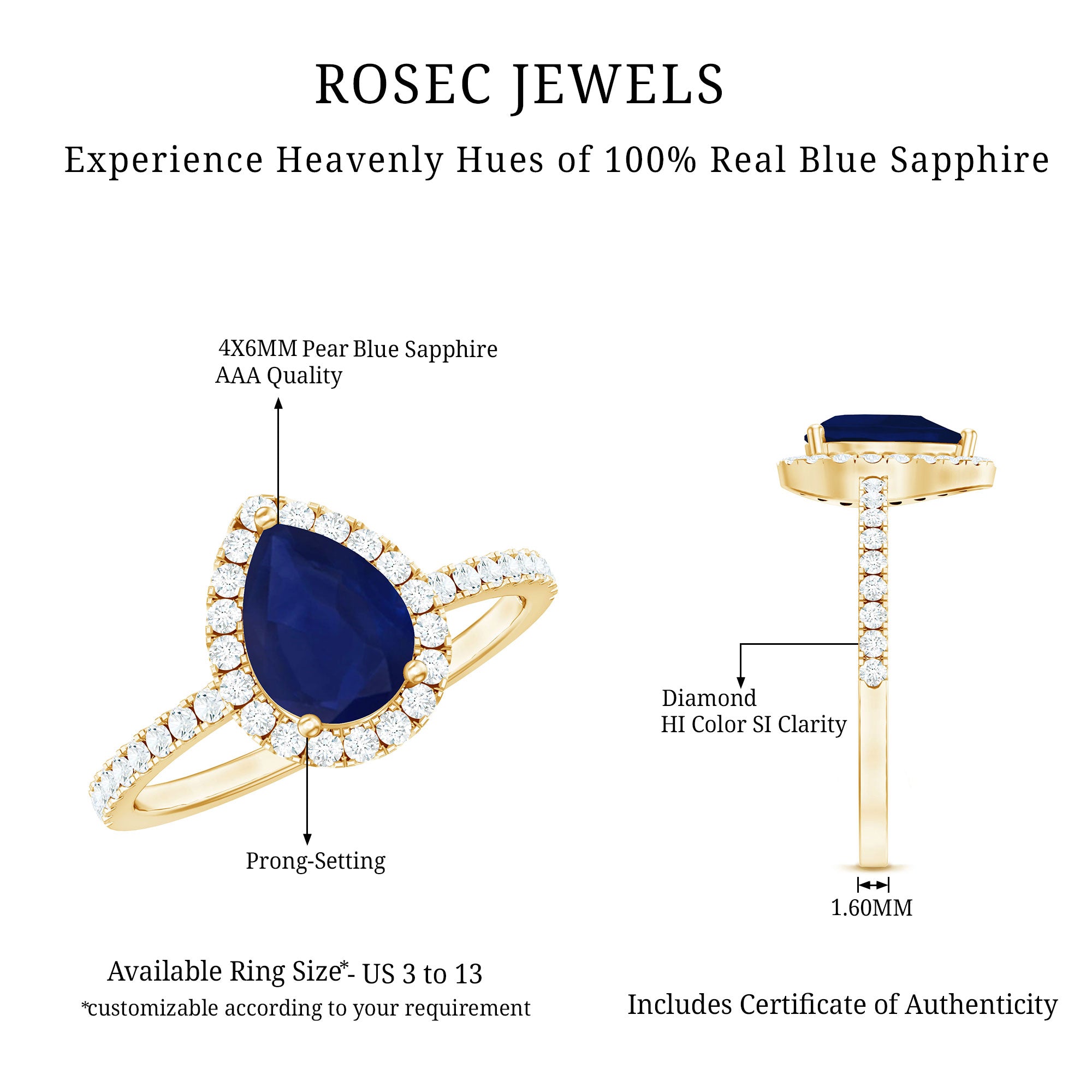 Embark the journey of your life with this Teardrop Engagement Ring adorned with Pear Cut Blue Sapphire, accentuated by and Round Shape Diamond Halo. This Blue Sapphire Engagement Ring will be an adorable piece for your lady that she will adore a lot. Fabulous and impressive Blue Sapphire Teardrop Ring is a perfect present.
